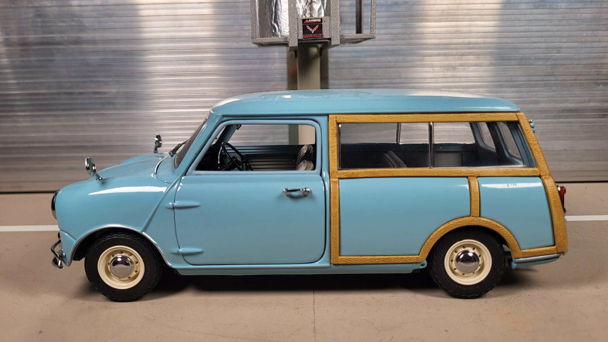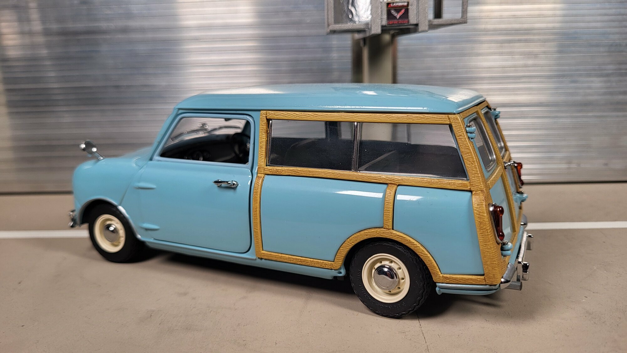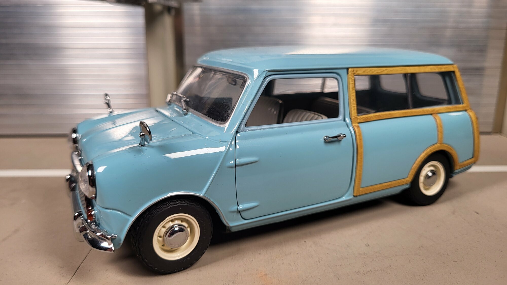 Das hier gezeigte Modellauto stammt aus der Sammlung des Modelly-Mitglieds „Phat‑T“ und bildet den Austin Mini Countryman im Maßstab 1:18 ab. Es handelt sich um ein Modellauto im Maßstab 1:18 des Herstellers Kyosho. Die Miniatur ist aus gemischten Materialien gefertigt: eine Karosserie aus Zinkdruckguss wird mit Kunststoffkomponenten für Verglasung, Interieur, Scheinwerferkörper und Zierleisten kombiniert. Die Fotos zeigen eine hellblaue Lackierung mit sorgfältig nachgebildeter Holzoptik entlang der Seitenflächen und um die Heckpartie. Die Holzstruktur ist fein gerändert und folgt den beim Vorbild typischen Rahmenverläufen über die hinteren Radläufe und die rechteckigen Seitenscheiben. Die Proportionen des Modells orientieren sich am Original: kurzer Vorderwagen, leicht nach vorne geneigte Frontscheibe, langes Dach bis zur zweiflügeligen Hecktür. Die Front trägt die verchromten Stoßstangenhörner, eine mittig platzierte Haubenleiste sowie klassische Außenspiegel auf den Kotflügeln. Die schmalen Reifen sitzen auf einteiligen Stahlrädern mit kleinen Chromzierringen und Nabenkappen; ein konkreter Felgenhersteller ist am Modell nicht abzulesen. Im Innenraum sind die Sitze in hellem Grauton gestaltet, dazu ein spartanisches Armaturenbrett mit zentralem Rundinstrument, wie beim Austin Mini Countryman der frühen Baujahre üblich. Türgriffe, Scharniere und Lampeneinfassungen sind als gesonderte Einsätze umgesetzt, was dem Modell eine klare Ablesbarkeit der Bauteile verleiht. Dieses Modellauto im Maßstab 1:18 wurde von Kyosho gefertigt und richtet sich an Sammler, die eine präzise, aber unaufdringliche Umsetzung klassischer britischer Fahrzeuge bevorzugen.