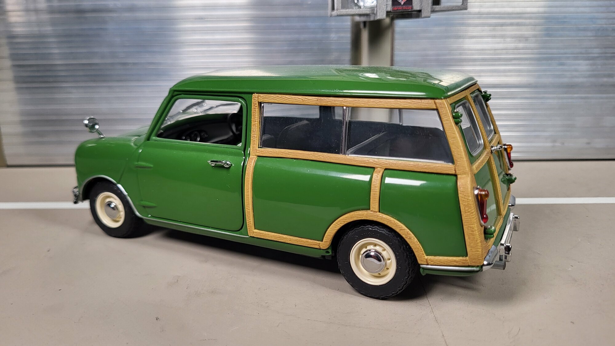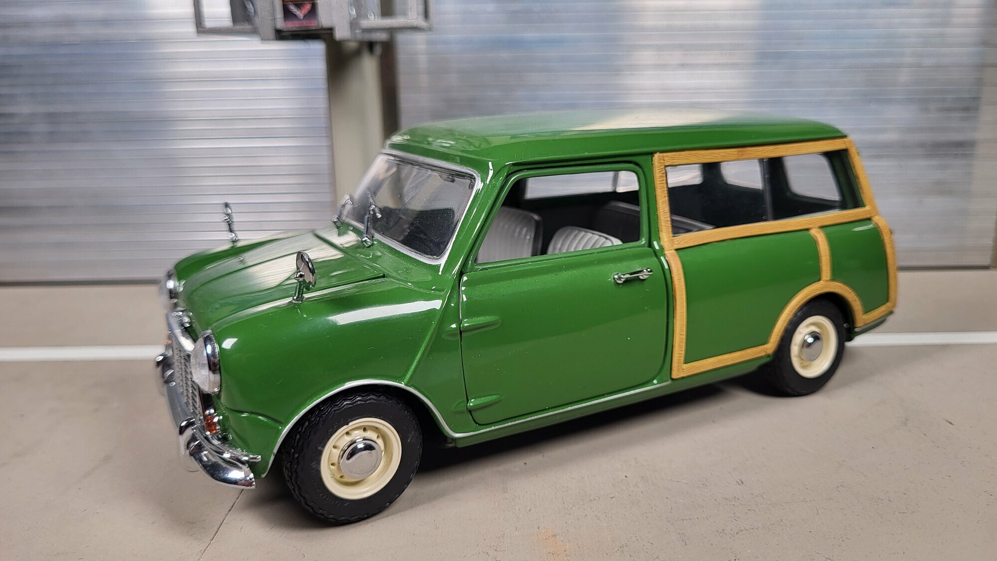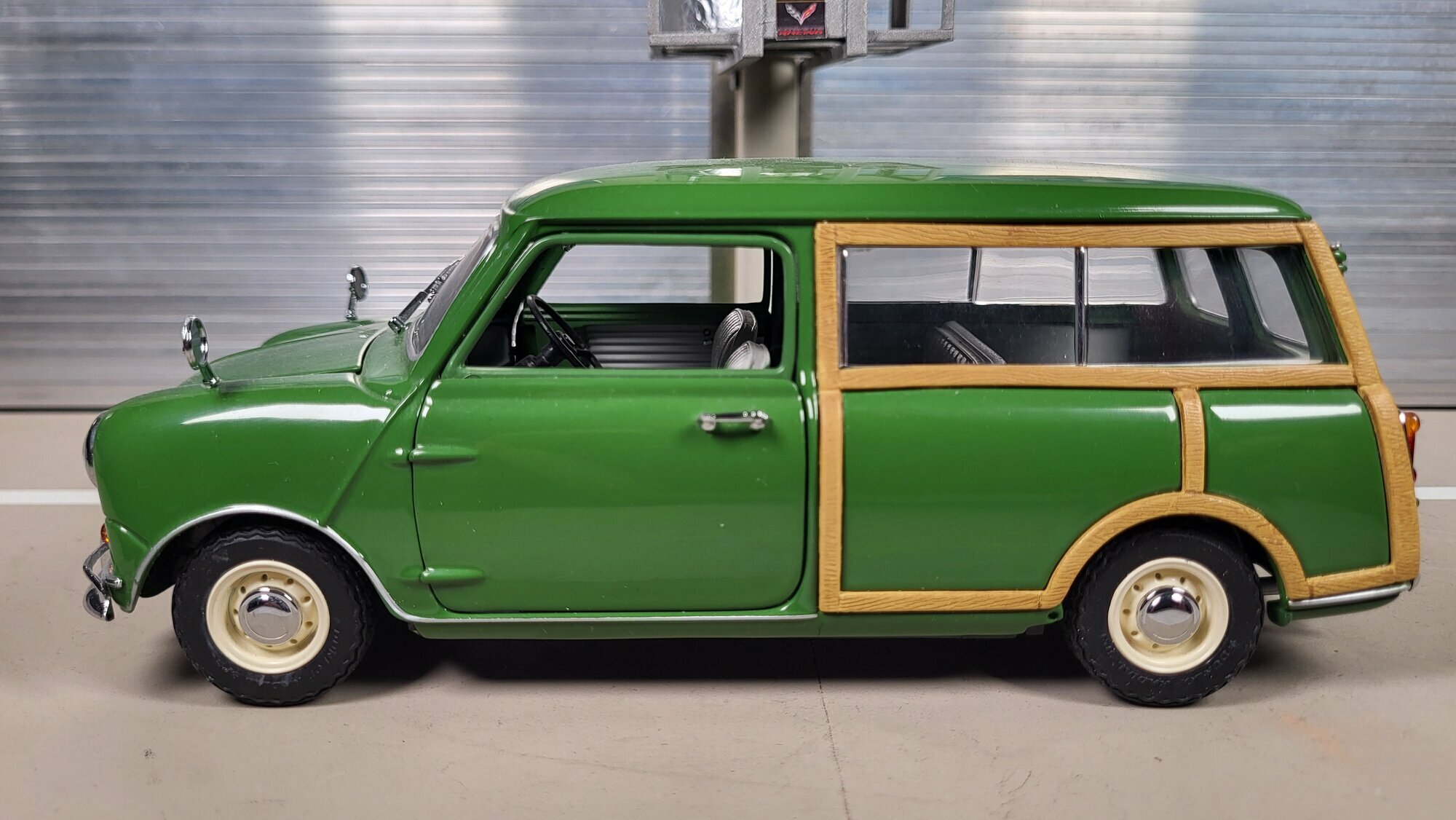 Die hier abgebildete Miniatur stammt aus der Sammlung des Modelly‑Mitglieds „Phat‑T“. Es handelt sich um ein Modellauto im Maßstab 1:18 von Kyosho. Gefertigt ist es in Material‑Mischbauweise, also aus Metalldruckguss mit ergänzenden Kunststoffteilen, was an Zierleisten, Verglasung und Innenraum erkennbar ist. Auf den Fotos fällt der grüne Lack ins Auge, der gleichmäßig appliziert wurde und die charakteristischen Rundungen des Morris Mini Traveller ohne sichtbare Unsauberkeiten abbildet. Das Holzdekor ist sauber als eigenständiger Einsatz oder bedrucktes Bauteil ausgeführt und verläuft entlang der Türen, um die hinteren Radläufe und bis zur Heckpartie. Die schmalen Stoßfänger, die seitlich gesetzten Kotflügelspiegel und die kleinen runden Rückleuchten sind dem Vorbild entsprechend wiedergegeben. Die Stahlfelgen mit kleinen Chromzierringen und zentralen Nabenkappen bilden die typischen 10‑Zoll‑Räder nach; ein spezifizierter Felgenhersteller ist nicht eindeutig erkennbar, daher lässt sich kein klarer Bezug zu Markenfelgen herstellen. Im Innenraum zeigt das Modell graue Sitze und eine schlichte Cockpitgestaltung mit zentralen Anzeigen – eine sachliche Umsetzung des Vorbilds. Die Fensterrahmen wirken maßstäblich dünn, die Spaltmaße der beweglichen Teile erscheinen auf den Bildern gleichmäßig. Insgesamt vermittelt die Miniatur eine stimmige Proportionierung des Kombi‑Hecks und der kurzen Front des Morris Mini Traveller.