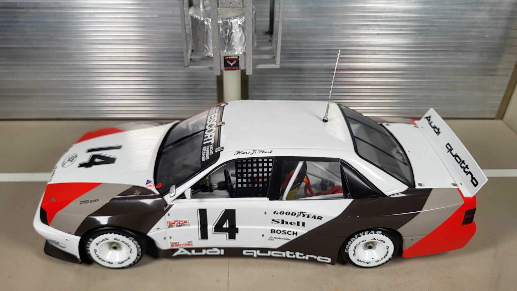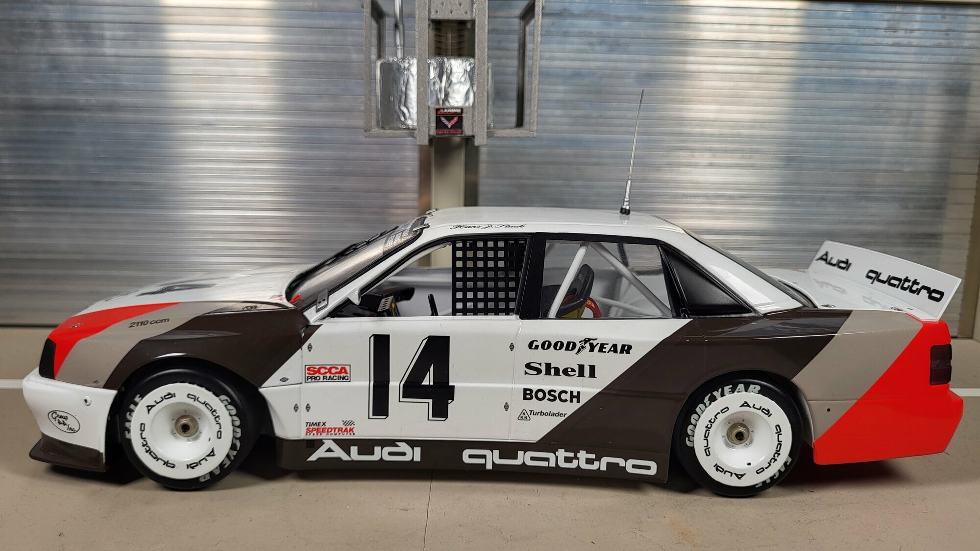 Das vorliegende Modellauto ist eine treffende Nachbildung des Audi 200 Quattro Trans-Am und überzeugt durch genaue Details. Das Fahrzeug ist in den traditionellen Farben von Audi lackiert, mit weißen, roten und braunen Akzenten, die einen schönen Kontrast bieten. Auf der Motorhaube, den Türen und dem Heck sind Sponsorenaufkleber von Shell, Goodyear und Bosch angebracht, was dem Modell eine authentische Rennoptik verleiht. Besonders auffällig sind die Audi-Logos und der Schriftzug „quattro“ auf dem hinteren Spoiler, die dem Fahrzeug einen unverwechselbaren Look verleihen.