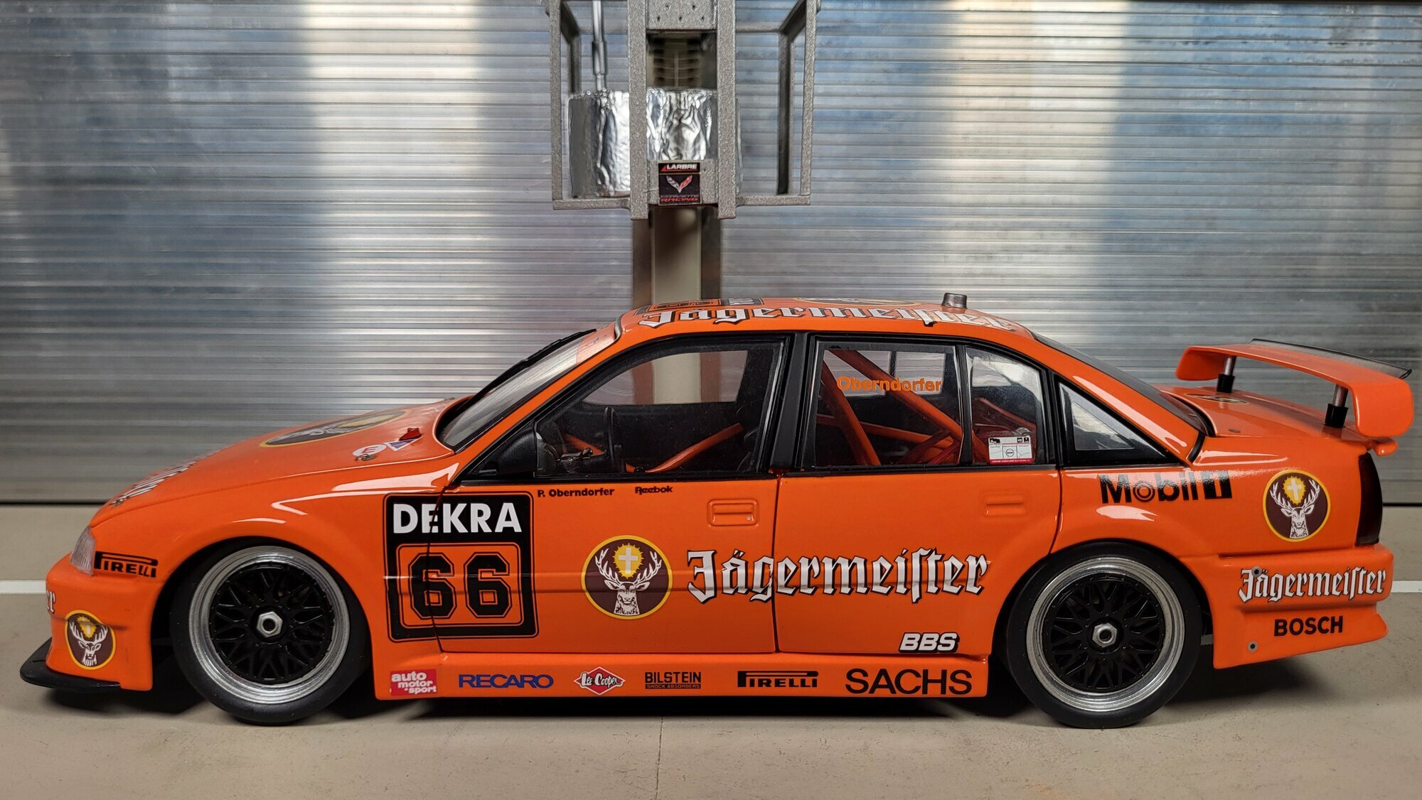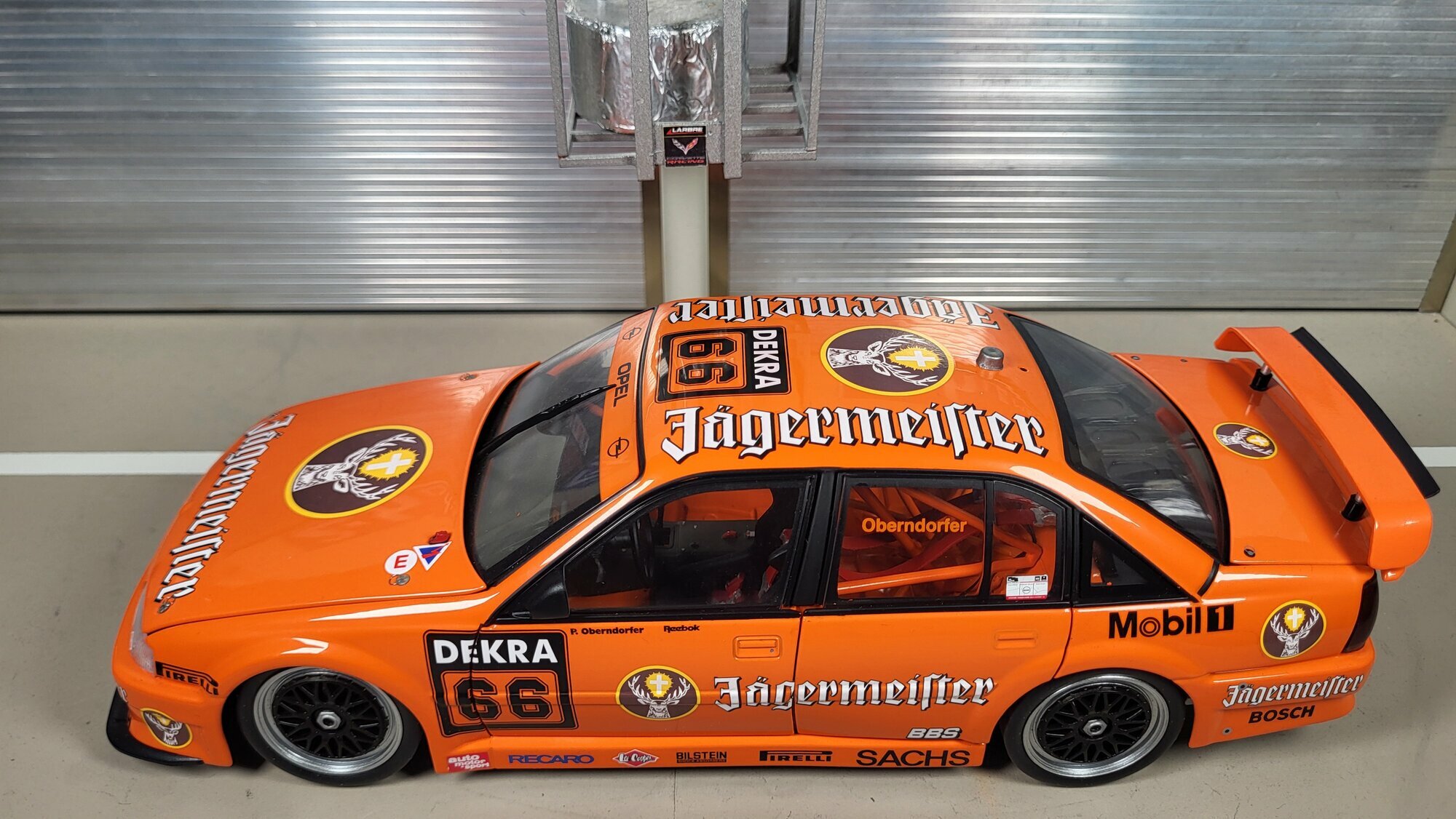 Das hier gezeigte Modellauto von Minichamps im 1:18 Maßstab ist eine detaillierte Nachbildung des Opel Omega 3000 24V. Gefertigt aus diecast-Material, zeichnet sich das Modell durch seine hohe Detailgenauigkeit und die Authentizität aus. Es zeigt die typische Farben und Formen des Rennwagens, einschließlich aller wichtigen Sponsorenaufkleber wie Jägermeister, Mobil1 und BOSCH. Diese Sponsorenaufkleber sind maßstabsgetreu und stellen eine unglaubliche Detailtreue dar.Ein interessantes Merkmal des Modells ist seine leuchtend orange Lackierung, die typisch für den Jägermeister-Rennwagen war. Die Karosserieform, einschließlich des großen Heckspoilers und der aerodynamischen Verbesserungen, ist akkurat nachgebildet. Die Details auf den Reifen und Felgen sowie der Innenraum mit Rennsitzen und Überrollkäfig nach den Originalvorlagen gestaltet.