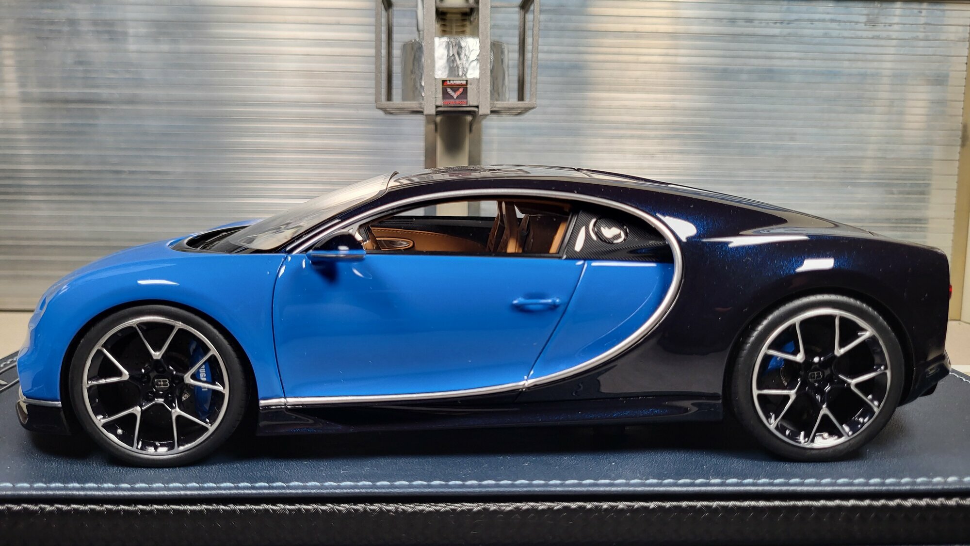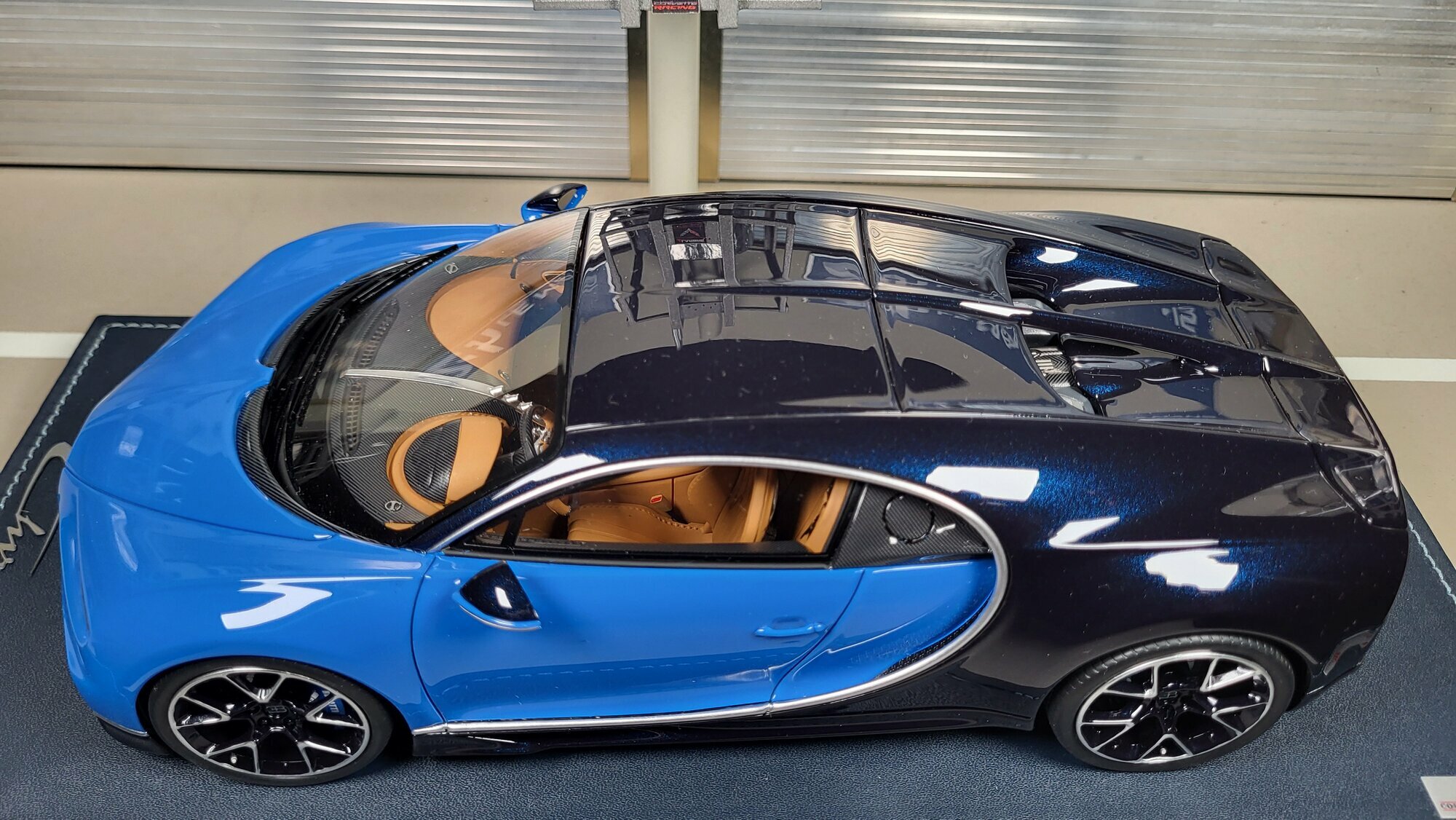 Dieses 1:18 Modellauto von MR Collection beeindruckt durch seine Detailtreue und die präzise Verarbeitung. Die Karosserie des Modellautos ist in einem auffälligen Blau und Schwarz lackiert, das perfekt die Originalfarben des Bugatti Chiron widerspiegelt. Auf dem Modell sind Räder deutlich sichtbar, die charakteristisch für den Chiron sind und vom Hersteller Bugatti produziert werden. Man kann die komplizierten Details der Felgen sowie die makellose Lackierung des Modells bewundern. Der markante C-förmige seitliche Bogen, der das Design des Chiron bestimmt, ist sorgfältig nachgebildet, was dem Modell eine authentische Erscheinung verleiht.