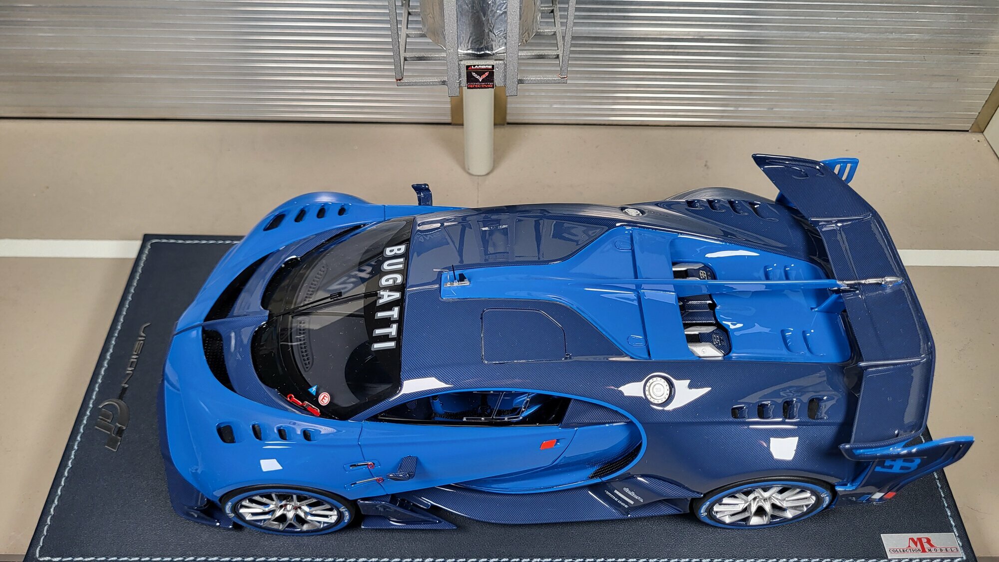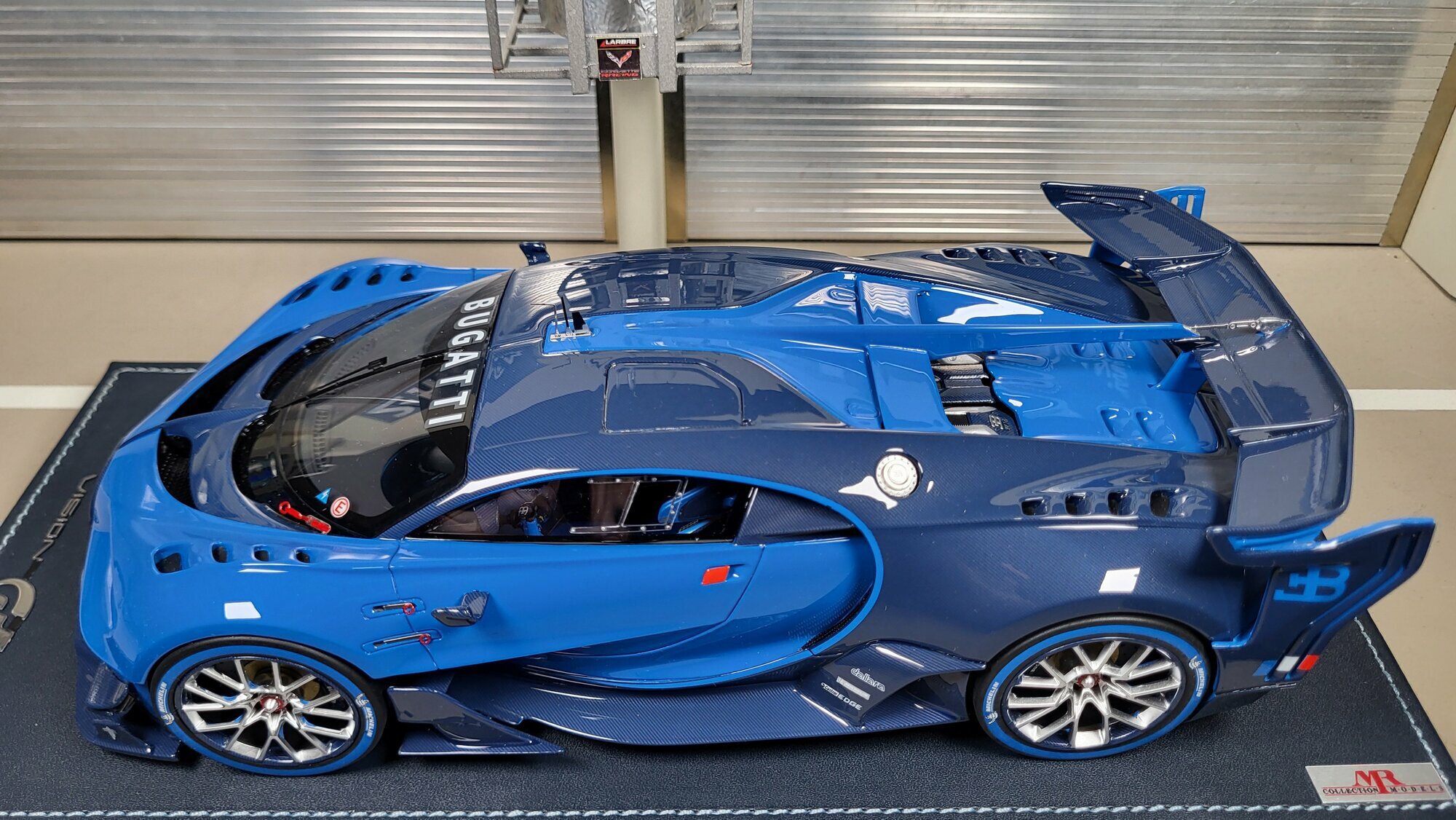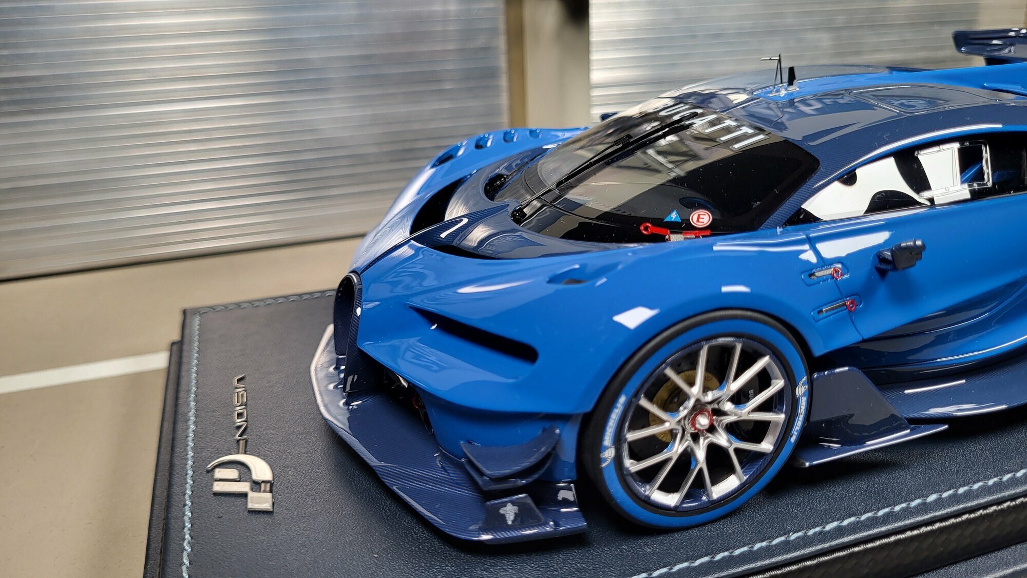 Der detailgetreue Nachbau im Maßstab 1:18 von der Firma MR Collection bildet den Bugatti Vision Gran Turismo Concept bis ins kleinste Detail ab. Modellautosammler aus aller Welt, darunter auch "Phat-T" von Modelly, schätzen die Präzision und die Handwerkskunst, die in diesem Modell stecken. Hergestellt aus hochwertigem Resin, weist dieses Modell feinste Details auf, die die Einzigartigkeit des Originals widerspiegeln. Besonders auffällig ist die exquisite Lackierung in Blau und Schwarz, welche die markante Formgebung und die dynamische Linie des Konzepts betont. Hinzu kommen die präzise nachgebildeten Felgen und die originalgetreuen Sponsoren- und Markenlogos.