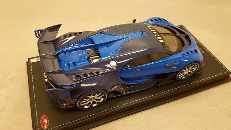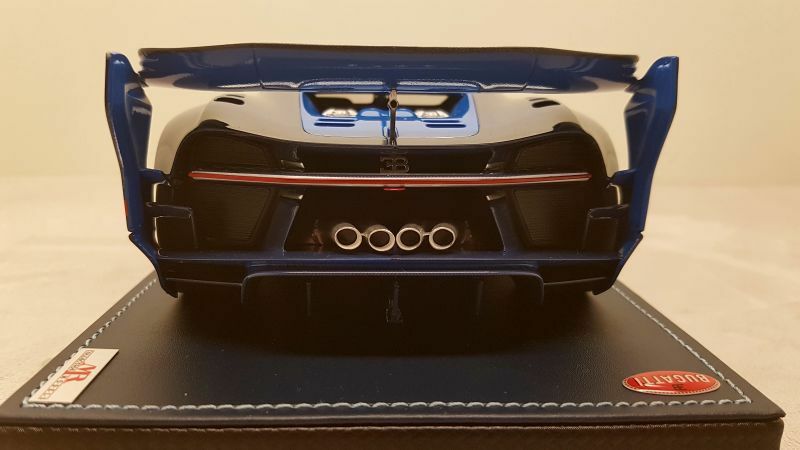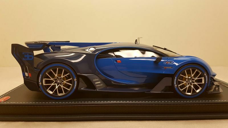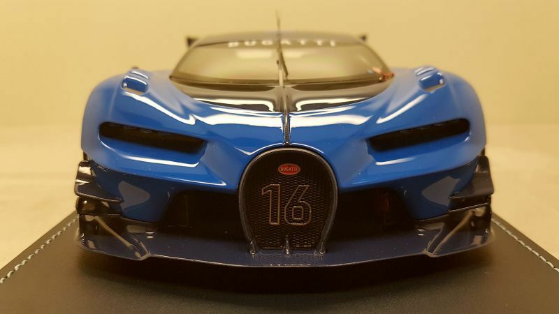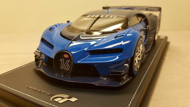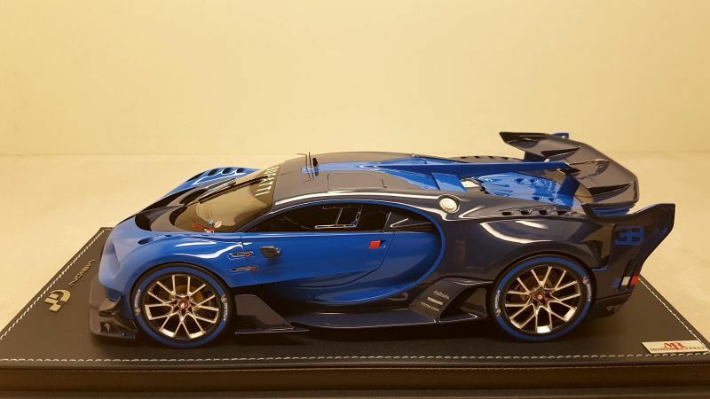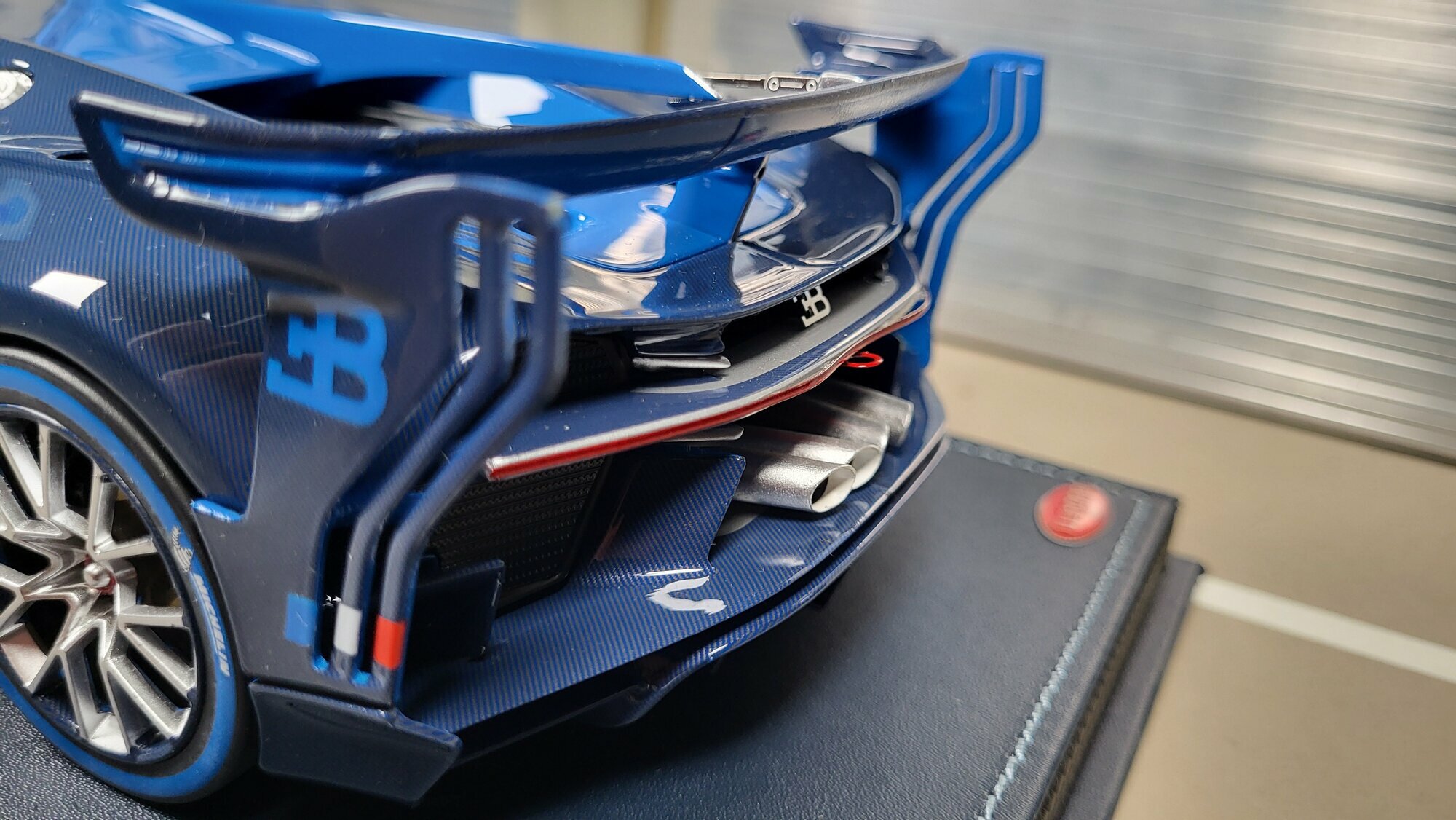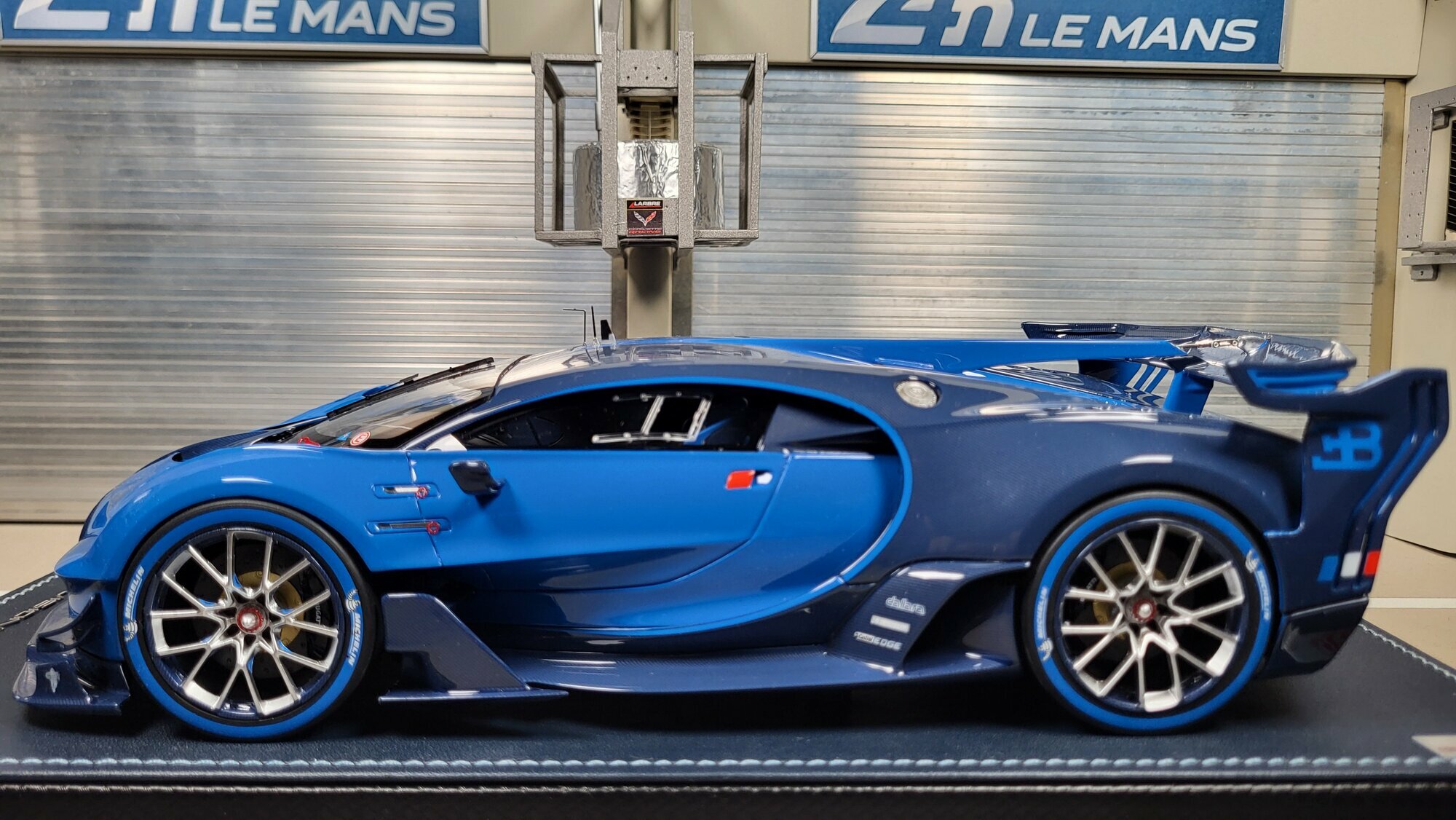 Der detailgetreue Nachbau im Maßstab 1:18 von der Firma MR Collection bildet den Bugatti Vision Gran Turismo Concept bis ins kleinste Detail ab. Modellautosammler aus aller Welt, darunter auch "Phat-T" von Modelly, schätzen die Präzision und die Handwerkskunst, die in diesem Modell stecken. Hergestellt aus hochwertigem Resin, weist dieses Modell feinste Details auf, die die Einzigartigkeit des Originals widerspiegeln. Besonders auffällig ist die exquisite Lackierung in Blau und Schwarz, welche die markante Formgebung und die dynamische Linie des Konzepts betont. Hinzu kommen die präzise nachgebildeten Felgen und die originalgetreuen Sponsoren- und Markenlogos.