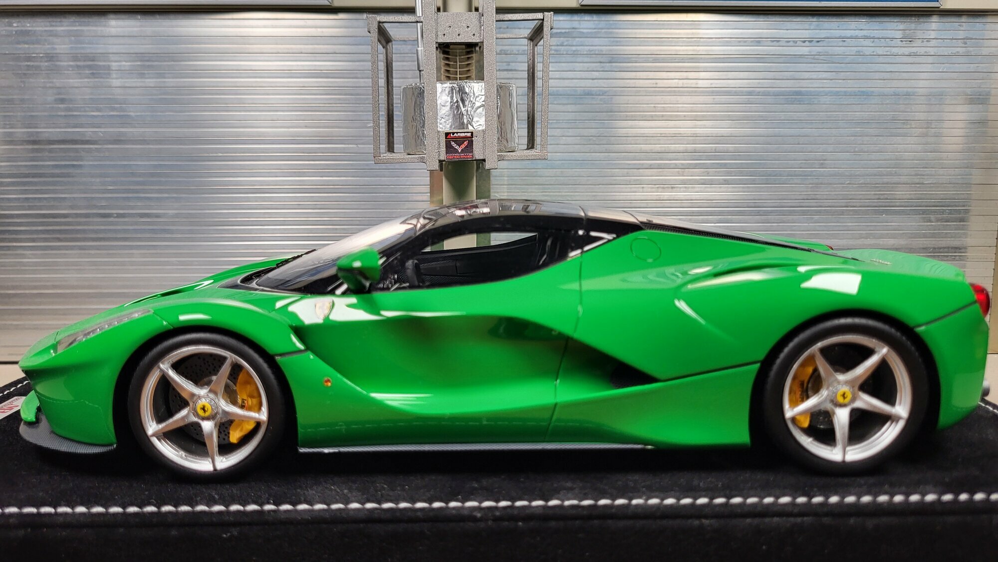 Die Miniatur des Ferrari LaFerrari, hier im 1:18 Maßstab, hergestellt von MR Collection, überzeugt durch ihre akkurate Nachbildung des Originals. Die Lackierung in einem auffälligen Grün verleiht dem Modell eine besondere Präsenz. In Bezug auf Farben und Formen zeigt das Modell detaillierte Karosserielinien und sauber ausgearbeitete Lüftungsschlitze. Auf den Photos des Sammlers "Phat-T" sind die silbernen Räder mit den markanten gelben Bremssätteln gut erkennbar, was auf die Liebe zum Detail beim Nachbilden des Originals hinweist. Die Herstellerplakette ist klar sichtbar und verleiht dem Modell zusätzliche Authentizität. Die Miniatur besitzt akkurate Badges und Logos, die den Ferrari-Charakter unterstreichen, und die Lackierung sorgt dafür, dass selbst kleinste Details gut erkennbar sind.
