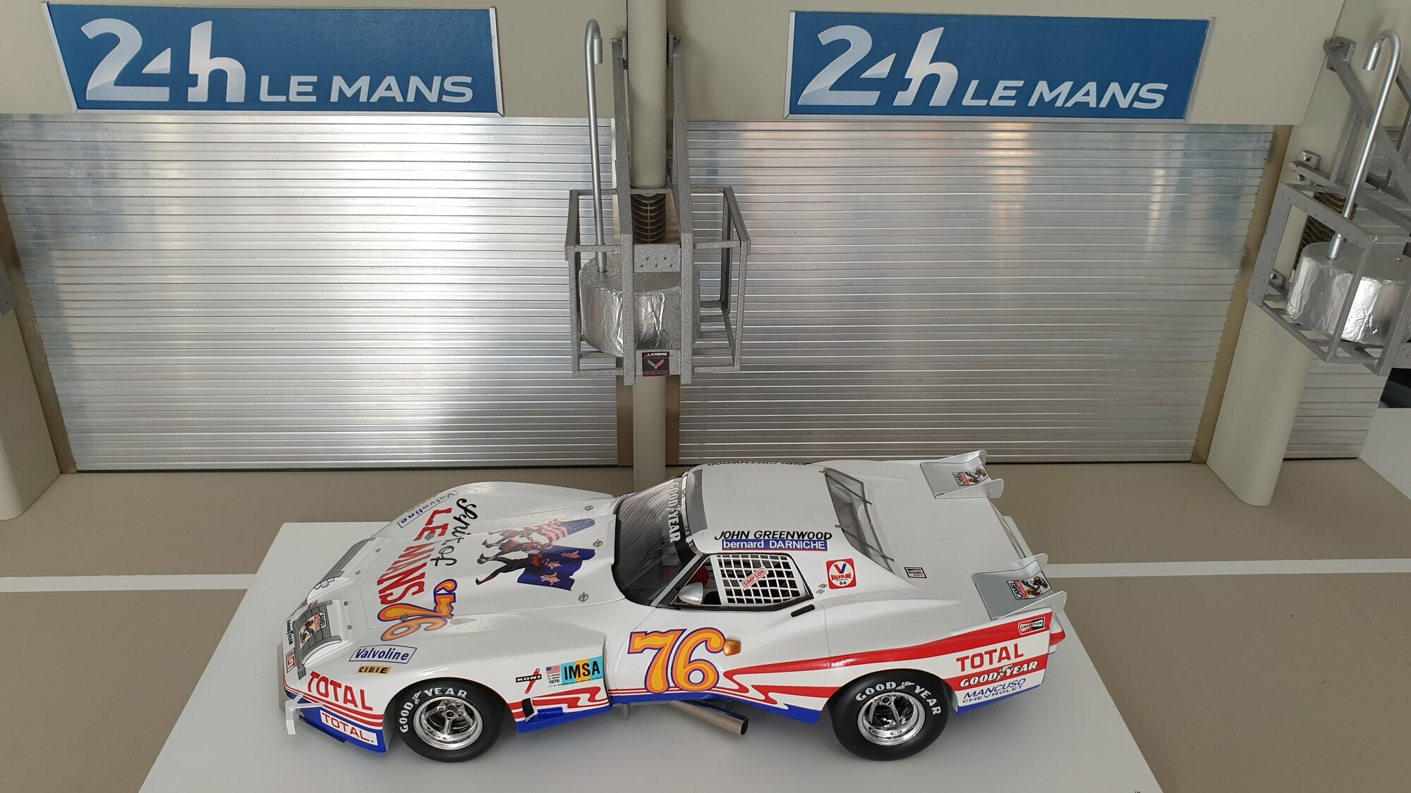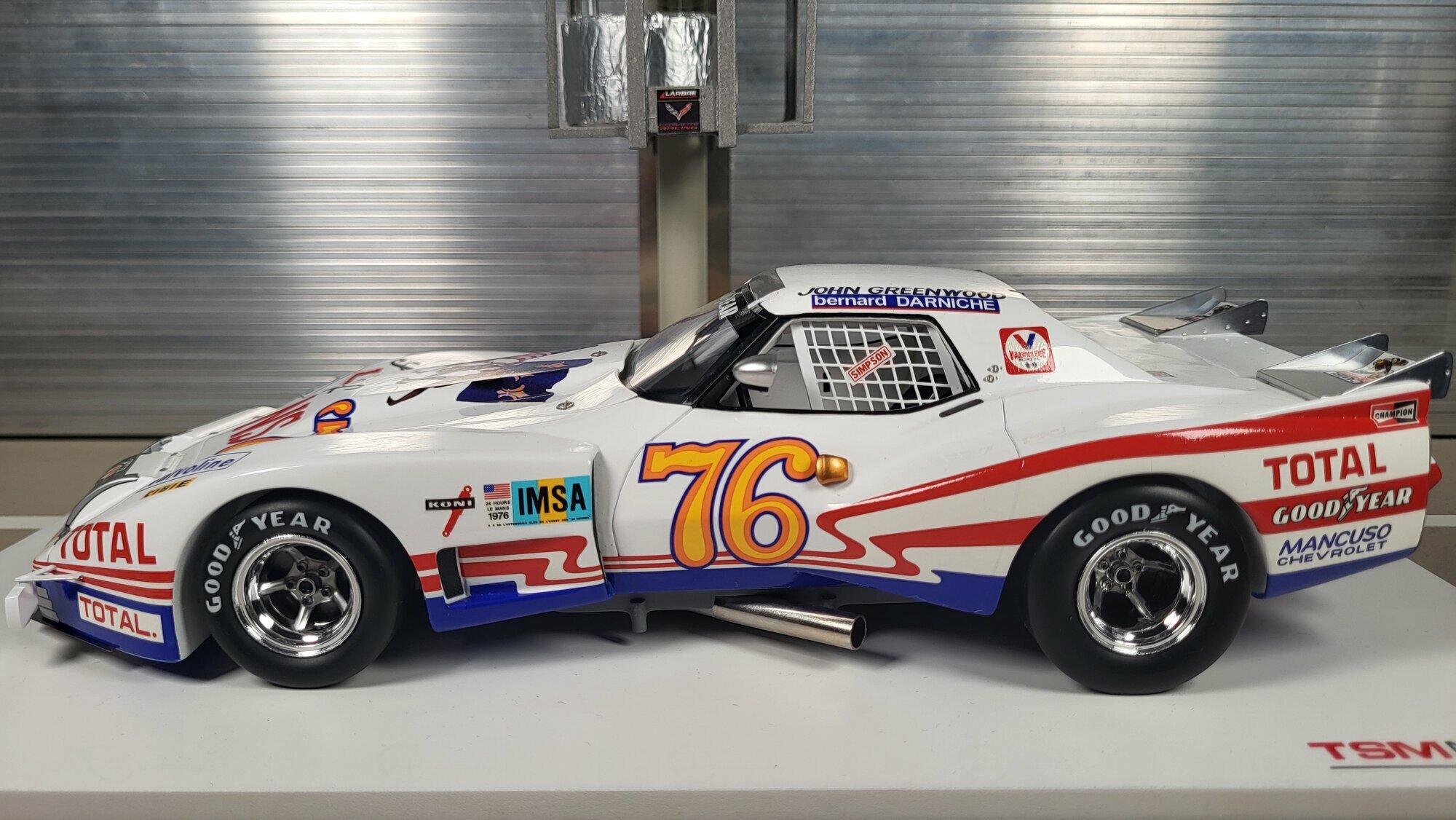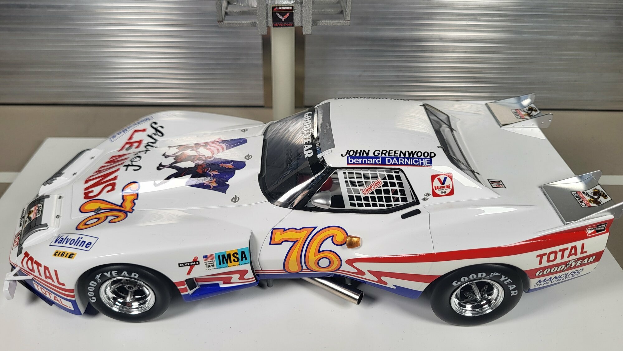 Die hier vorgestellte Miniatur im Maßstab 1:18 ist eine exakte Nachbildung der legendären Le Mans-Version der Corvette C3 Stingray von 1976. Dieses Modellauto wurde von TrueScale Miniatures hergestellt und ist aus hochwertigem Resin gefertigt, was eine hohe Detailgenauigkeit und eine besondere Robustheit ermöglicht. Die Lackierung des Modells entspricht dem Originalfahrzeug mit der Startnummer 76. Das Modell beeindruckt durch seine präzise Nachbildung der Rennlackierung, die die amerikanische Flagge und das Total-Logo sowie Aufschriften und Sponsorenaufkleber zeigt. Auf dem Dach und an den Seiten sind die Namen der Fahrer John Greenwood und Bernard Darniche gut sichtbar, was zusätzlich zur Authentizität des Modells beiträgt.