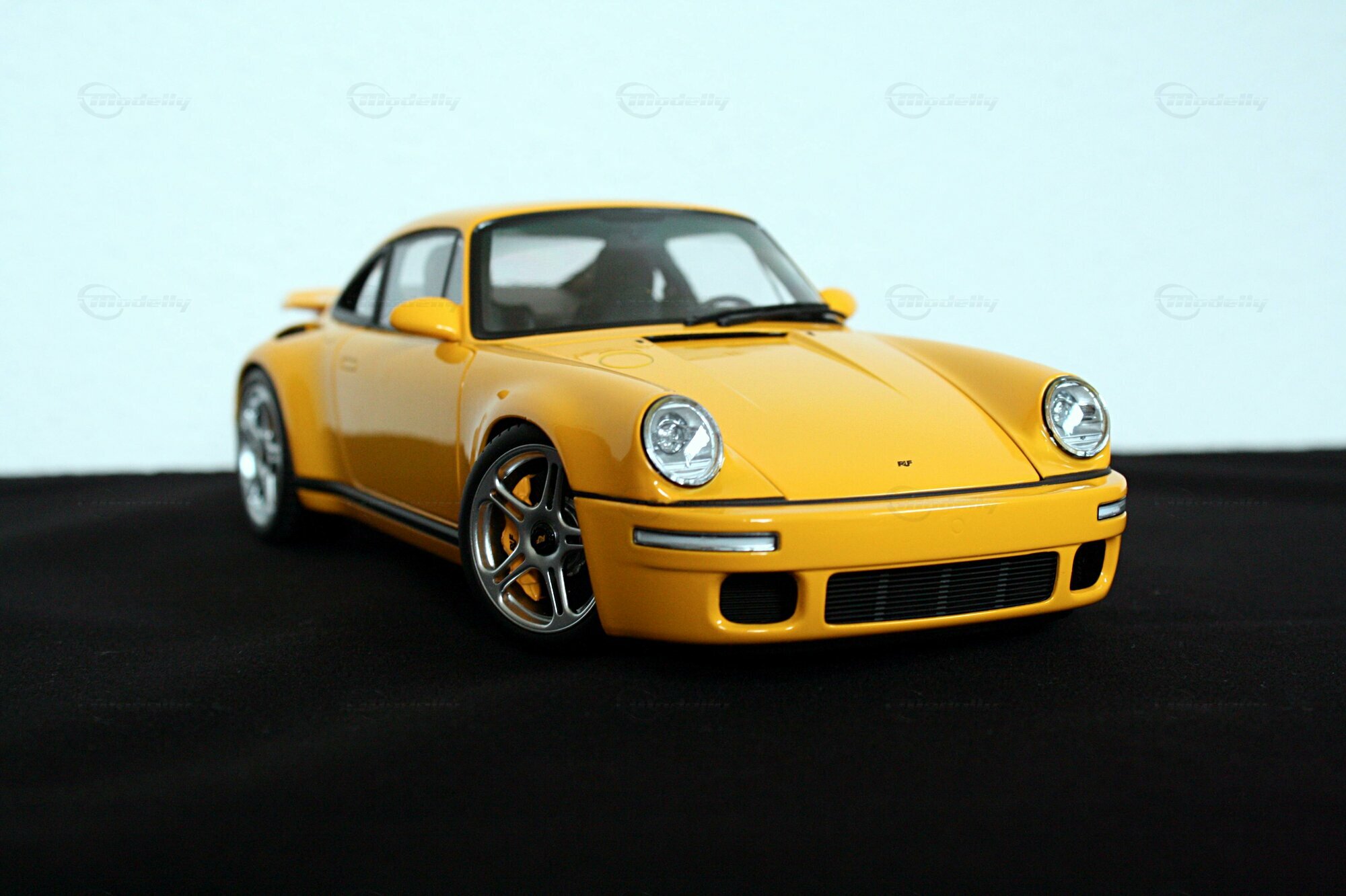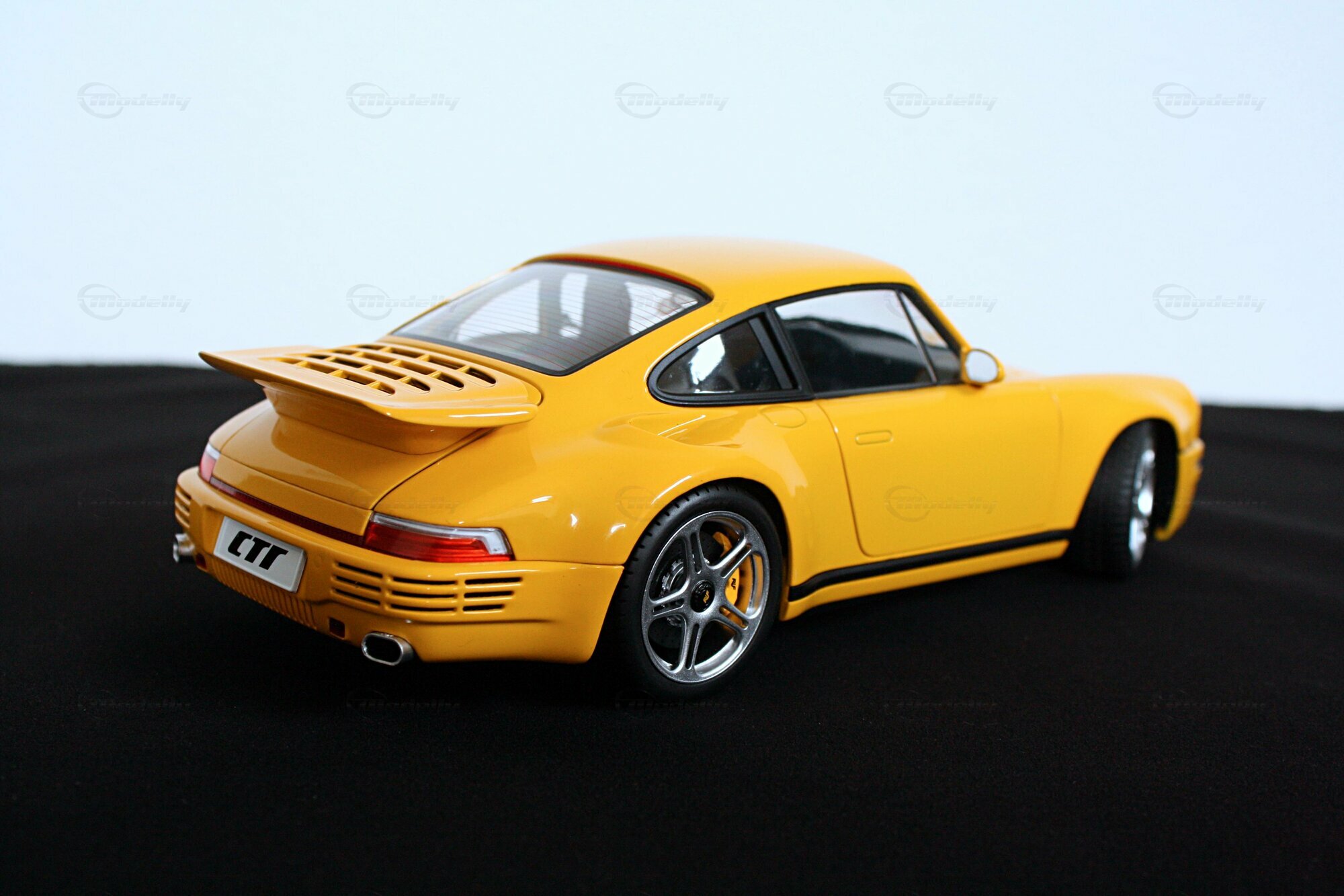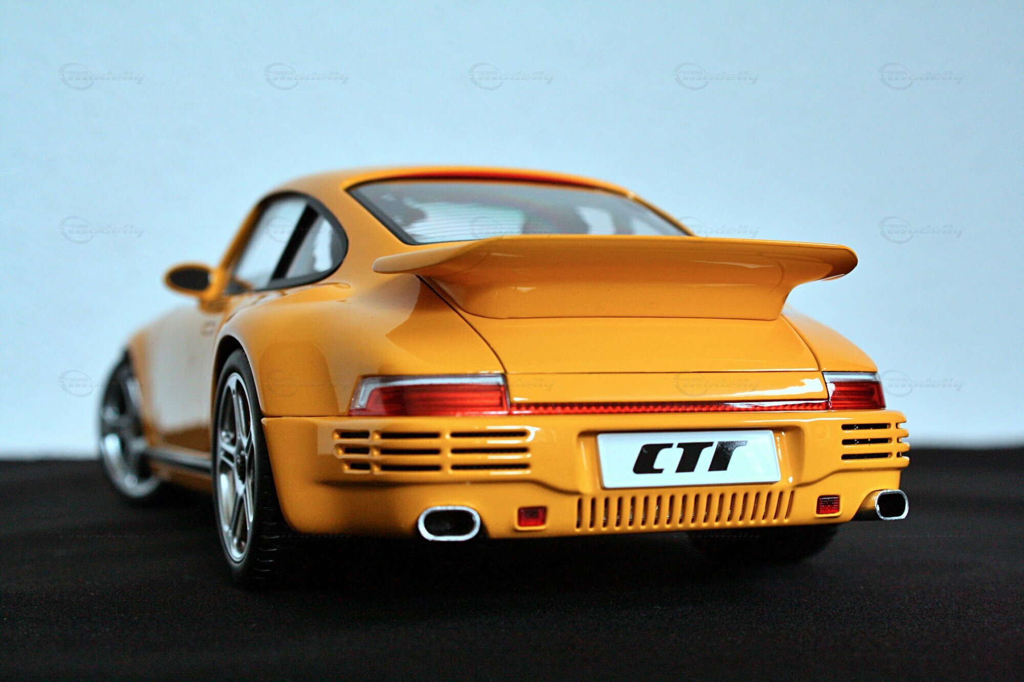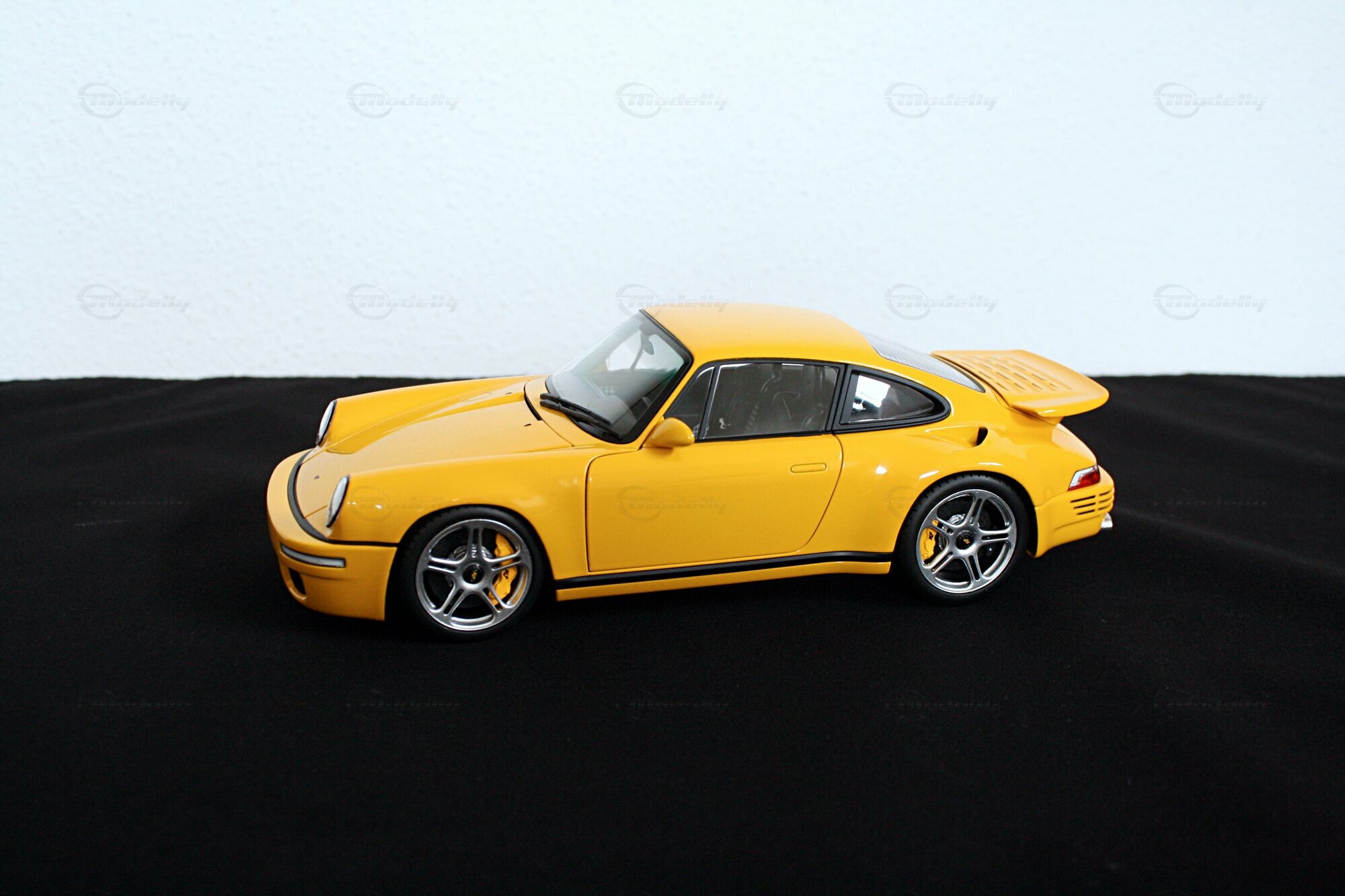 Das Originalfahrzeug, das als Grundlage für dieses 1:18-Modell diente, ist der berühmte Ruf CTR Anniversary. Der Ruf CTR Anniversary wurde anlässlich des 30-jährigen Jubiläums des Ruf CTR, besser bekannt als „Yellowbird“, entwickelt. Der Ruf CTR Anniversary stammt aus dem Jahr 2016 und ist Teil der dritten Generation des CTR. Der Ursprung des Fahrzeuges basiert auf intensiven Modifikationen und Verbesserungen des ursprünglichen Porsche 911, wobei Alois Ruf Jr. maßgeblich an der Entwicklung beteiligt war.Der Ruf CTR Anniversary ist bekannt für seinen leistungsstarken 3,6-Liter-Sechszylinder-Boxermotor, der eine beeindruckende Leistung von 700 PS erzeugt. Diese Leistung wird durch den Einsatz von zwei Turboladern erreicht. Erreicht wird damit eine Höchstgeschwindigkeit von über 360 km/h, was ihn zu einem der schnellsten Fahrzeuge seiner Zeit macht. Die Beschleunigung von 0 auf 100 km/h erfolgt in nur 3,5 Sekunden. Weitere bemerkenswerte technische Merkmale sind das Fahrwerk mit doppelten Querlenkern und ein vollständig aus Karbon gefertigtes Monocoque, das für zusätzliche Stabilität und geringes Gewicht sorgt.