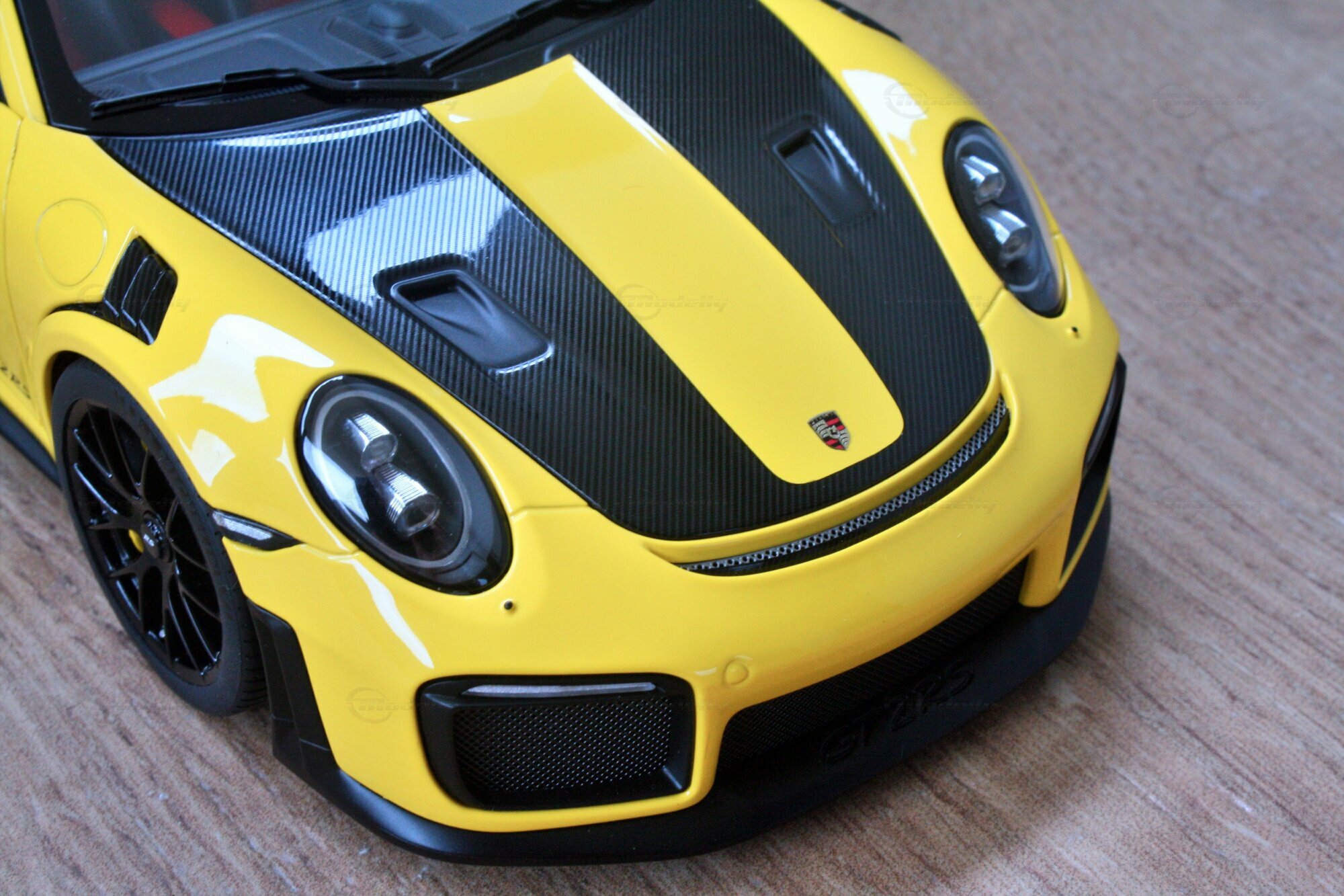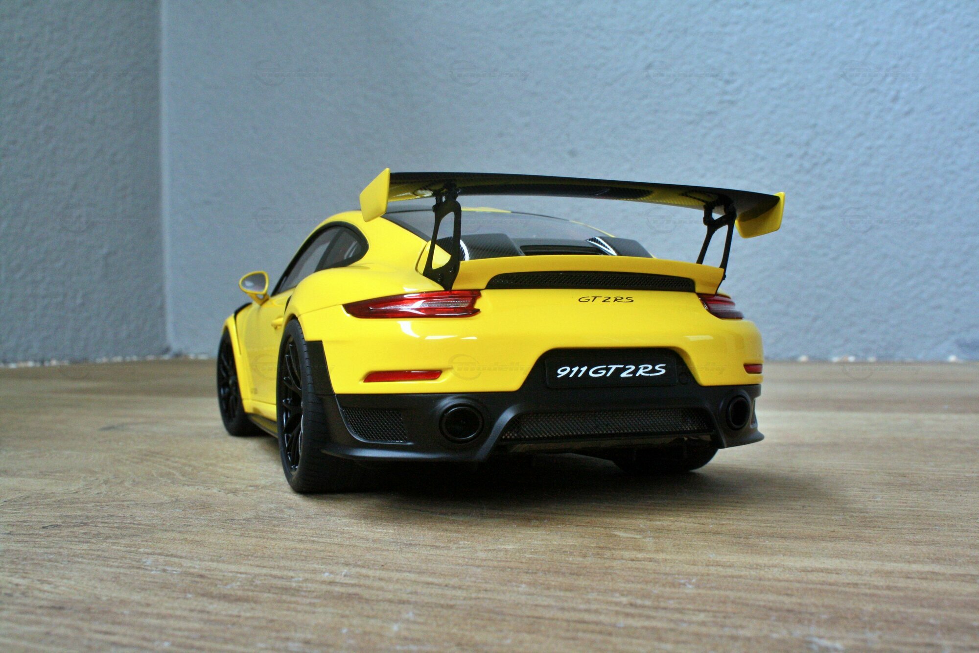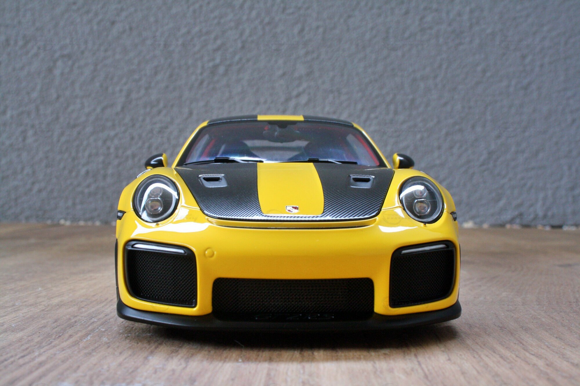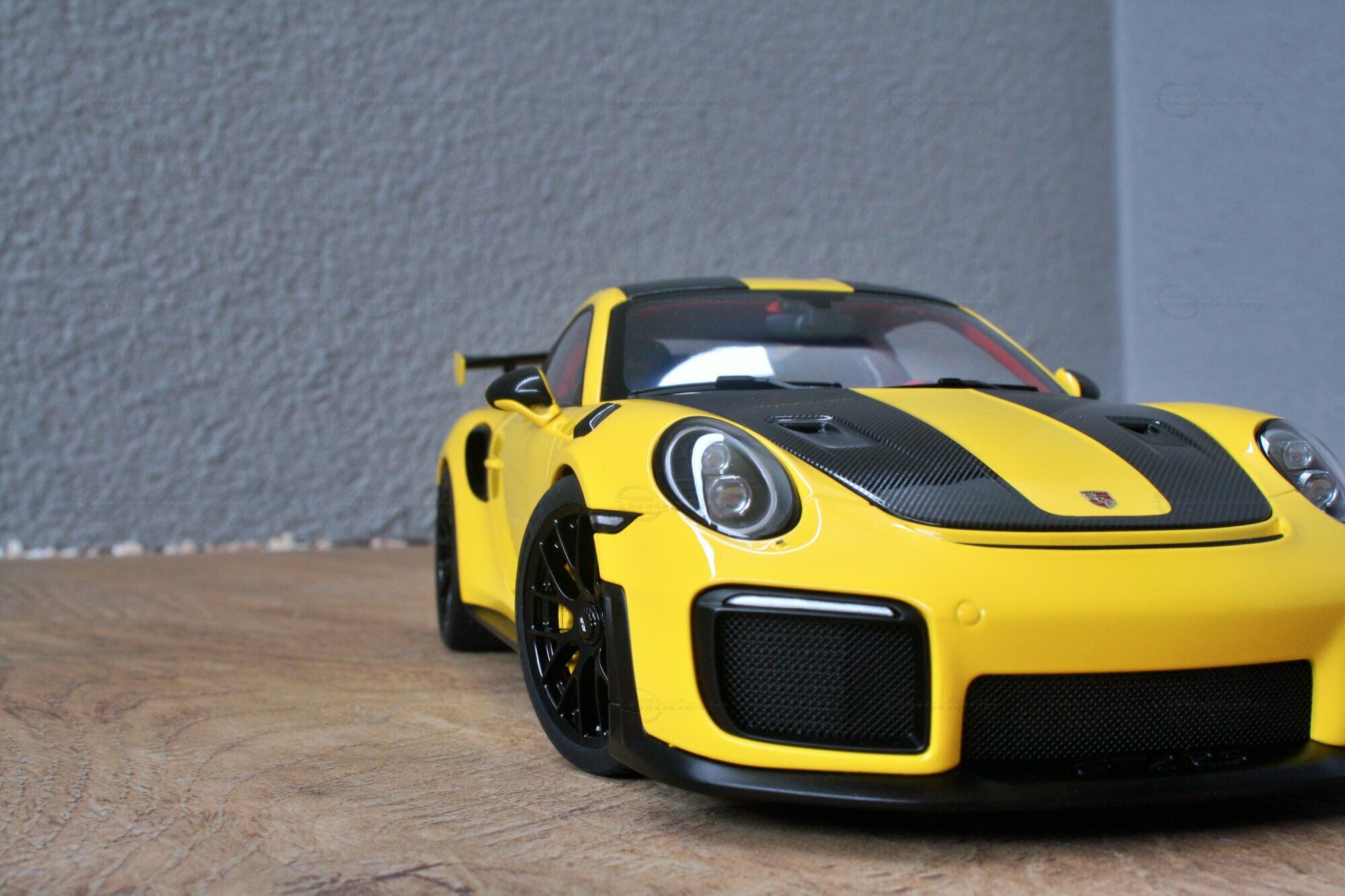 Das hier vorgestellte Modellauto im Maßstab 1:18, hergestellt von AUTOart, stellt eine exakte Nachbildung des Porsche 911 (991 II) GT2 RS dar. Dieses Modell wurde aus Kunststoff gefertigt und weist eine hohe Detailgenauigkeit auf. Die Lackierung des Modells, bestehend aus einem kräftigen Gelb mit schwarzen Akzenten, entspricht der des Originals und bringt die markante Optik des Supersportwagens perfekt zur Geltung. Bei genauer Betrachtung erkennt man die Liebe zum Detail, insbesondere bei den Scheinwerfern, den Rückleuchten und den Felgen. Die schwarzen Leichtmetallfelgen unterstreichen den sportlichen Charakter des Fahrzeugs und geben einen realistischen Eindruck der originalen Räder.