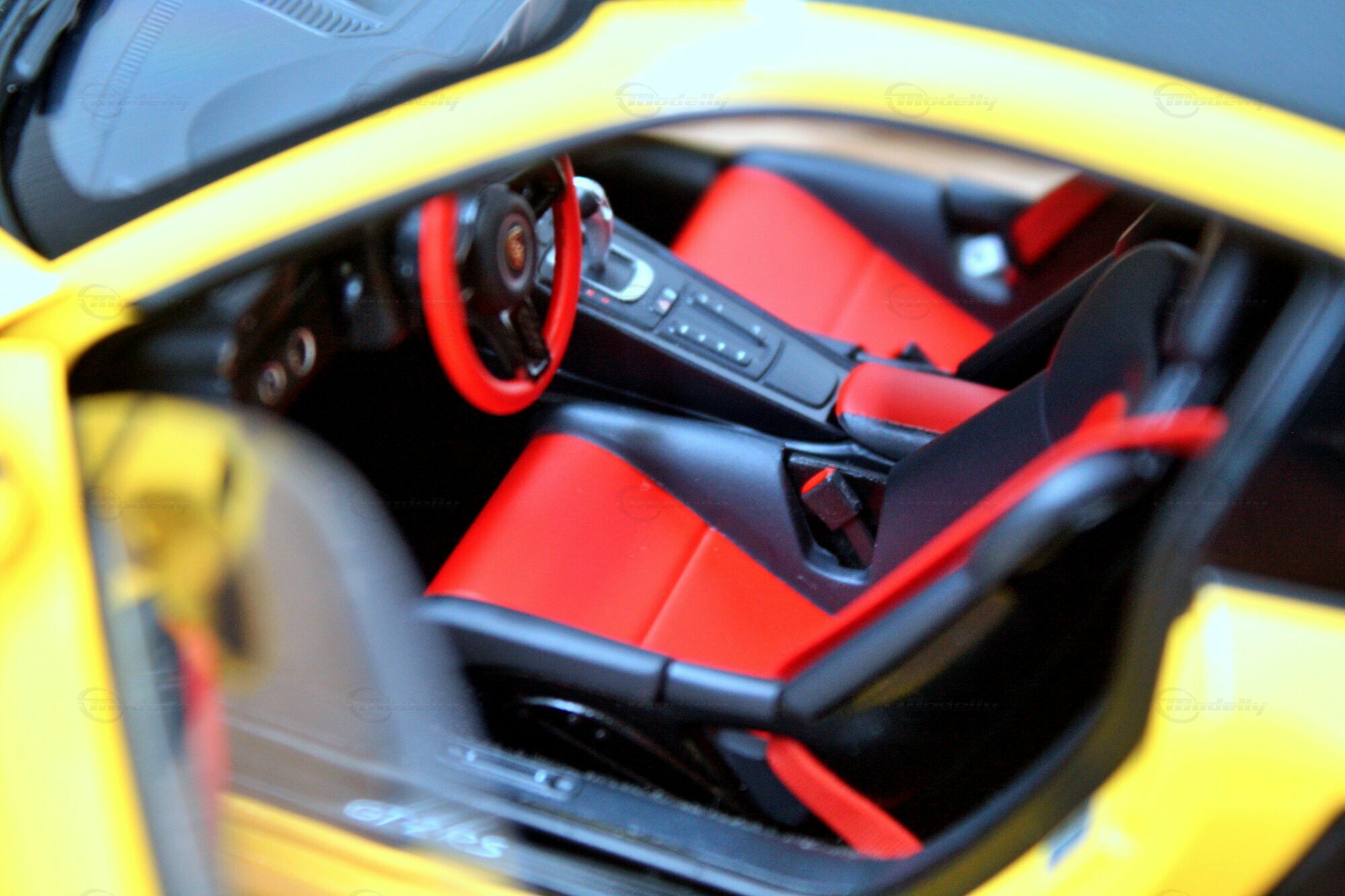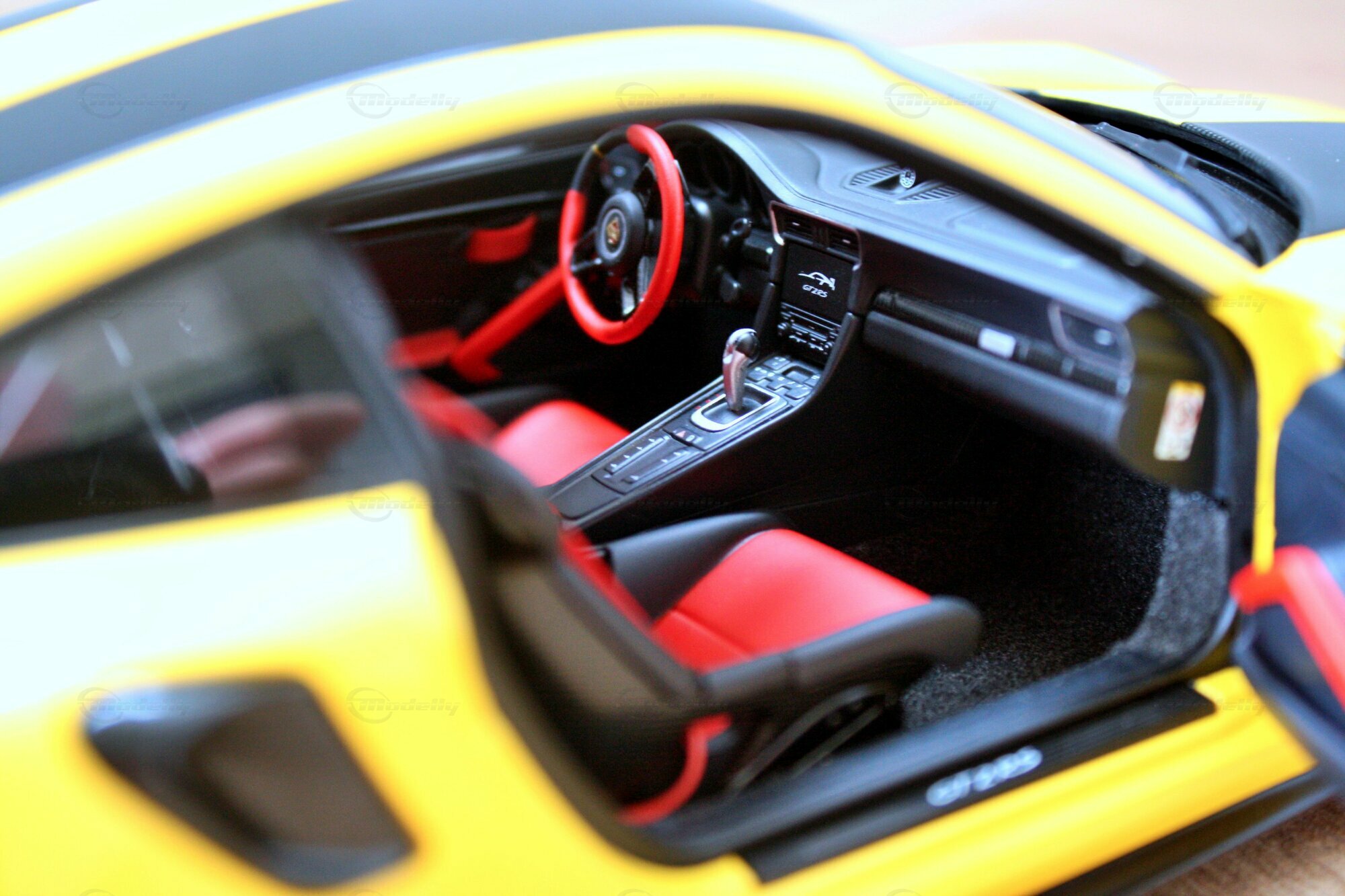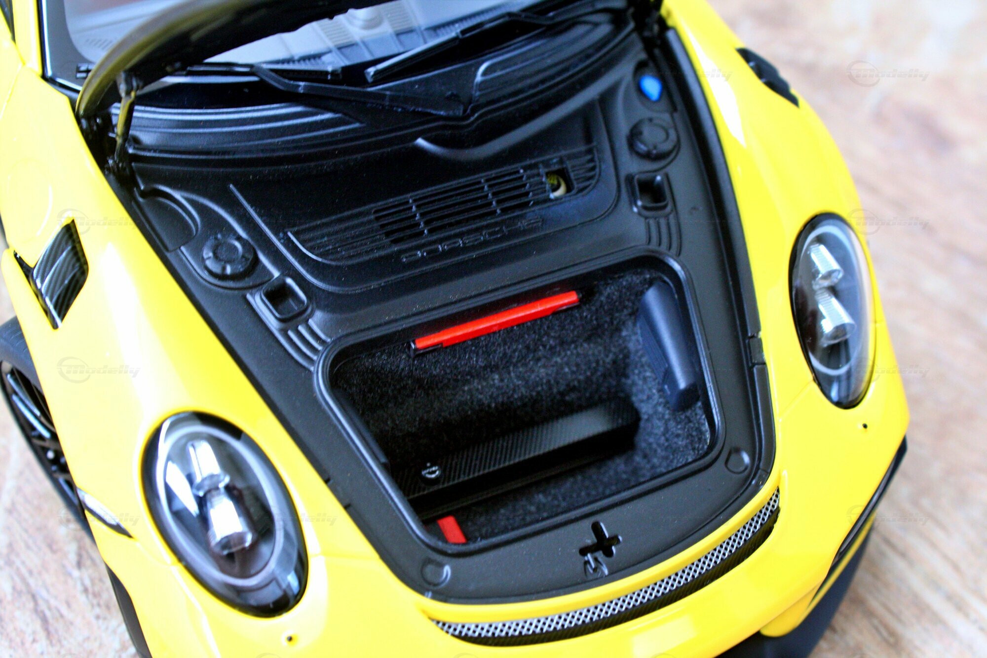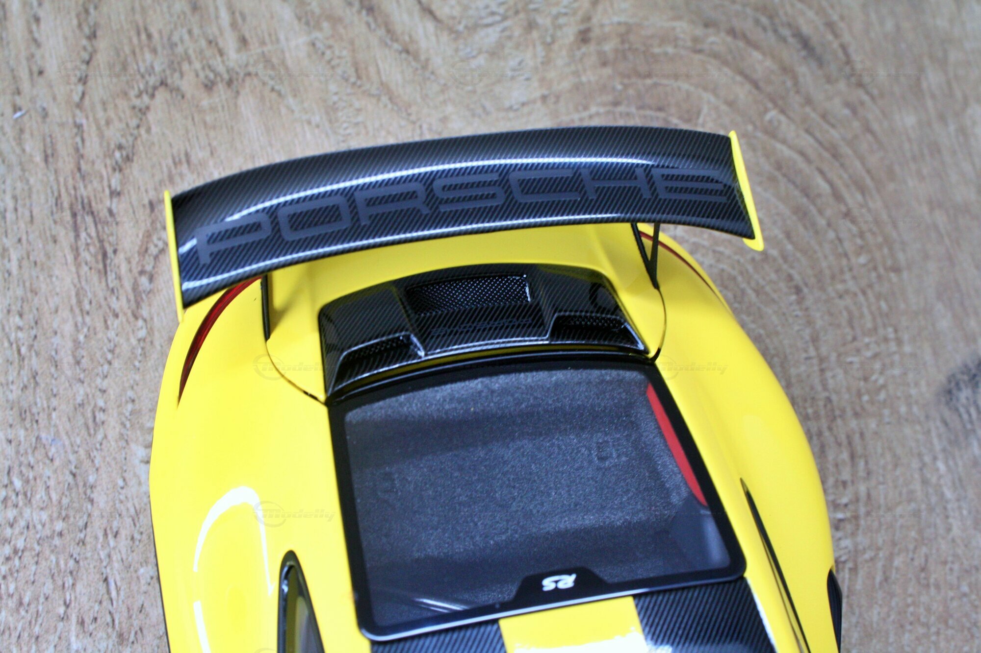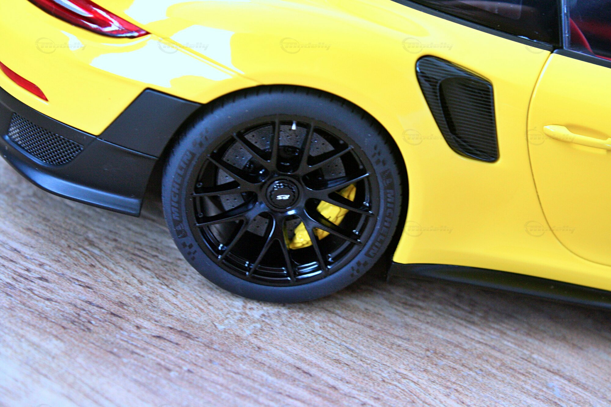 Das hier vorgestellte Modellauto im Maßstab 1:18, hergestellt von AUTOart, stellt eine exakte Nachbildung des Porsche 911 (991 II) GT2 RS dar. Dieses Modell wurde aus Kunststoff gefertigt und weist eine hohe Detailgenauigkeit auf. Die Lackierung des Modells, bestehend aus einem kräftigen Gelb mit schwarzen Akzenten, entspricht der des Originals und bringt die markante Optik des Supersportwagens perfekt zur Geltung. Bei genauer Betrachtung erkennt man die Liebe zum Detail, insbesondere bei den Scheinwerfern, den Rückleuchten und den Felgen. Die schwarzen Leichtmetallfelgen unterstreichen den sportlichen Charakter des Fahrzeugs und geben einen realistischen Eindruck der originalen Räder.