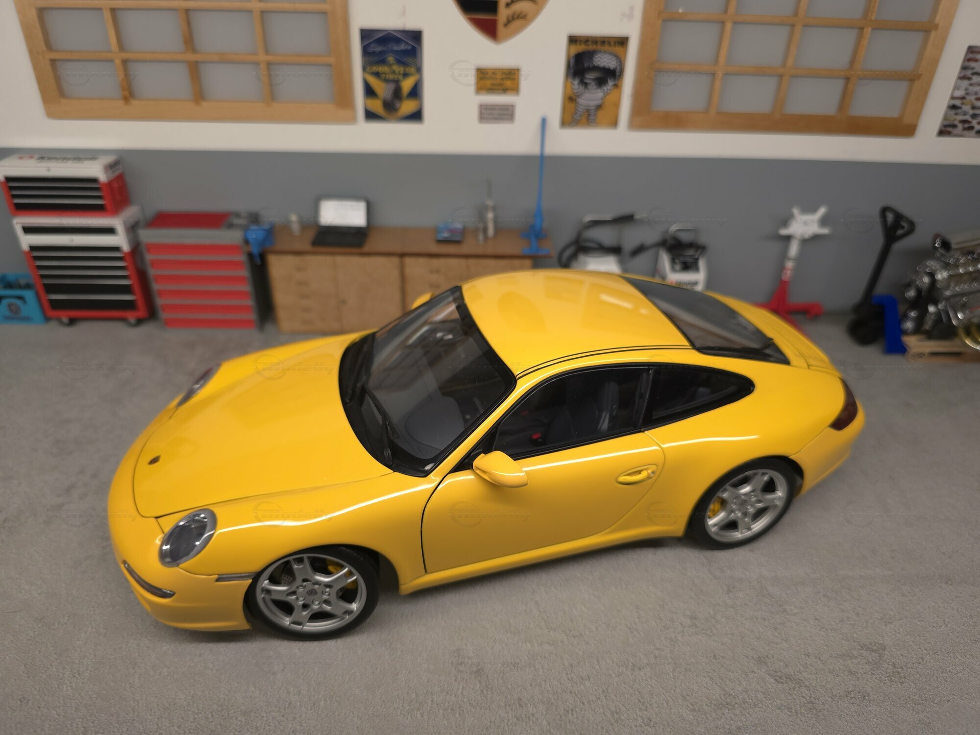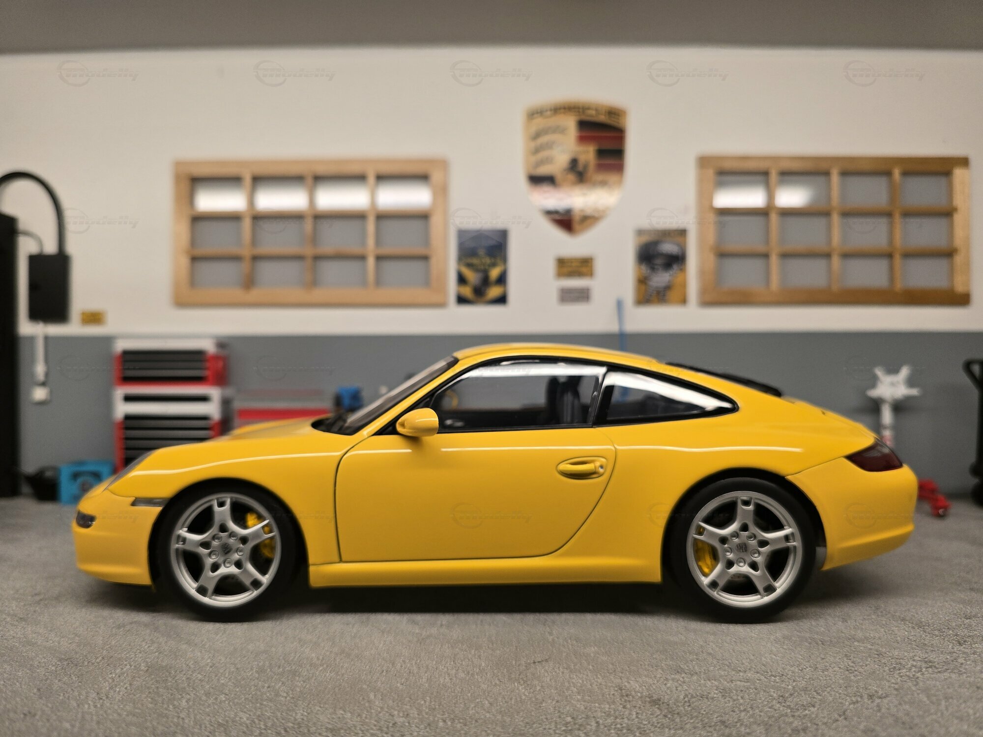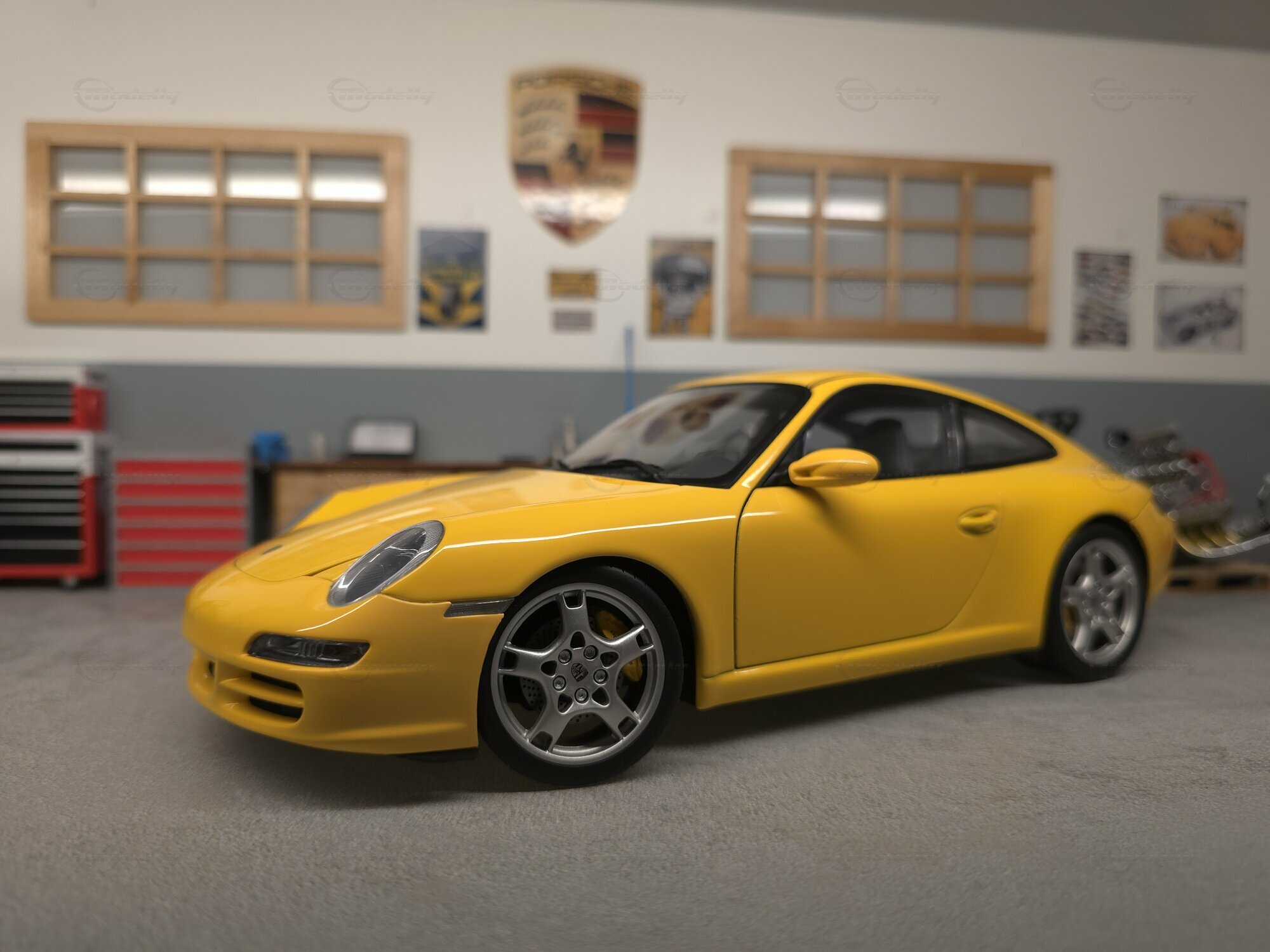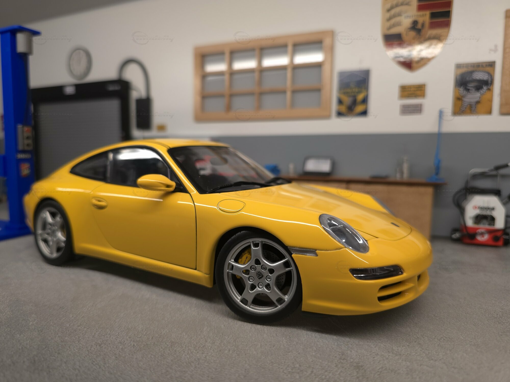 Bei dem hier gezeigten Stück handelt es sich um ein Modellauto im Maßstab 1:18, hergestellt von AUTOart, das sich in der Sammlung des Modelly-Mitglieds „Play-X“ befindet. Die Proportionen sprechen klar für den Porsche 911 (997) Carrera S: gut erkennbar sind die kompakte 911-Silhouette, die abfallende Dachlinie, die runden Frontscheinwerfer, die bündig integrierten Türgriffe und die typische Form der vorderen Kotflügel. Das Miniaturfahrzeug ist auf Basis des Materials Diecast gefertigt, was sich in der definierten Darstellung der Karosseriekanten, Türen und Anbauteile zeigt. Ebenfalls sichtbar sind silberfarbene Mehrspeichenräder mit gelochten Bremsscheiben und gelben Bremssätteln, was zur Carrera-S-Konfiguration passt. Die Außenspiegel sind in Wagenfarbe lackiert, die Fensterrahmen erscheinen dunkel ausgeführt, und auf der Fronthaube sitzt ein kleines Porsche-Wappen. Die Bilder zeigen mehrere Perspektiven des Fahrzeugs in einer Werkstattkulisse mit Hebebühne, Werkzeugwagen, Wanddekor und Porsche-bezogenen Schildern. Gerade für Sammler ist diese Präsentation interessant, weil die Form des Modells aus verschiedenen Blickwinkeln nachvollziehbar wird und die Linienführung des 997 gut sichtbar bleibt.