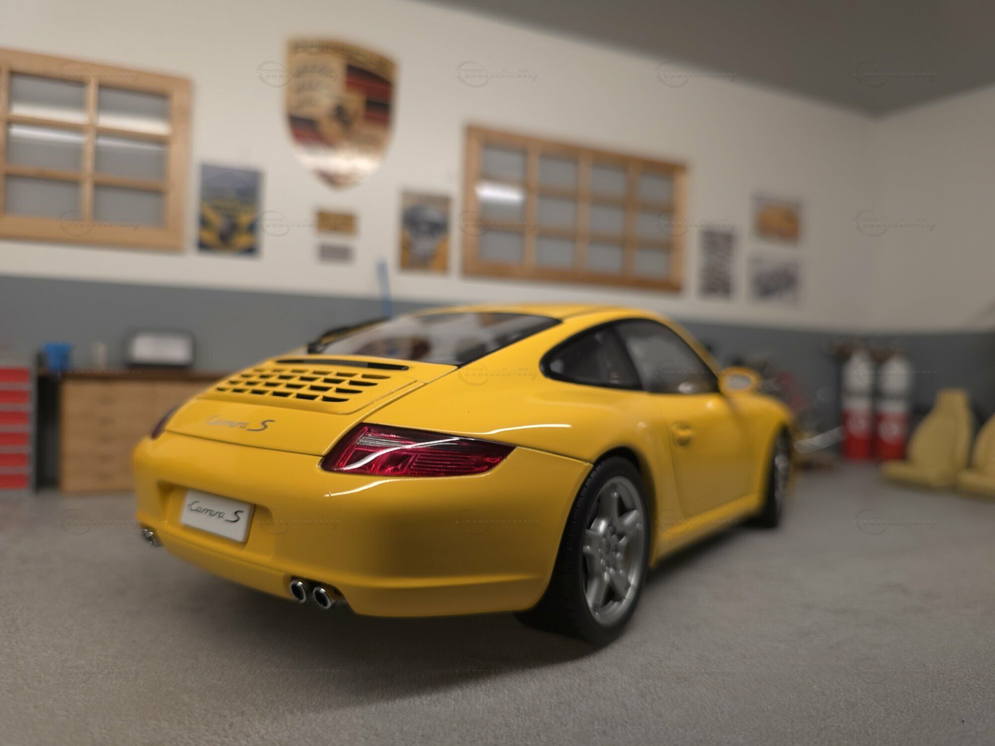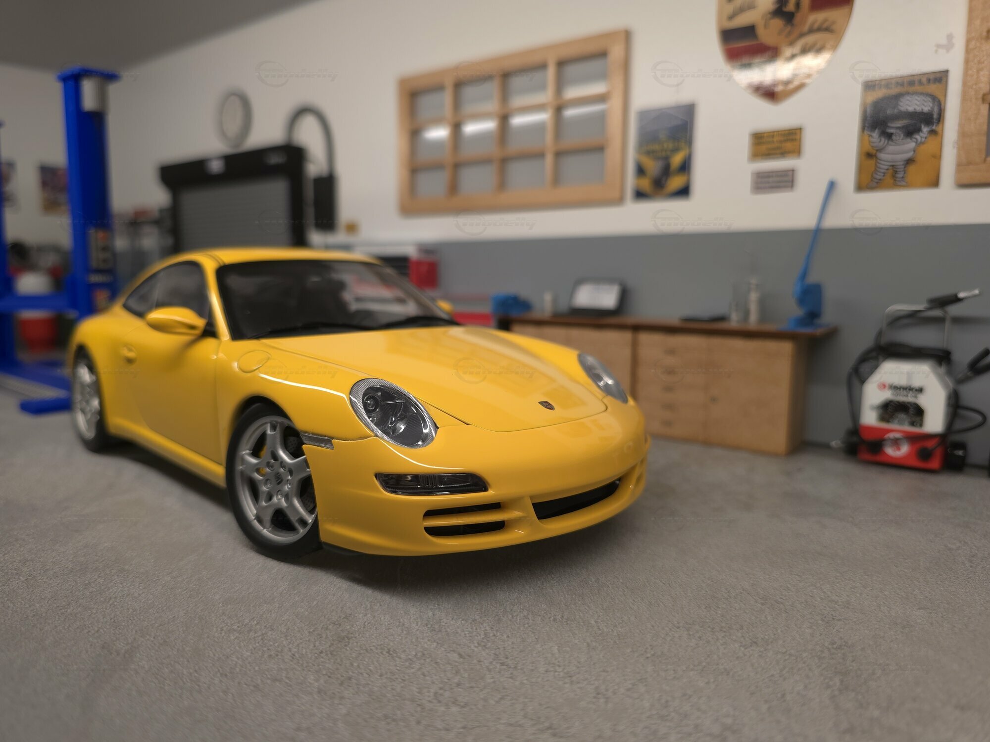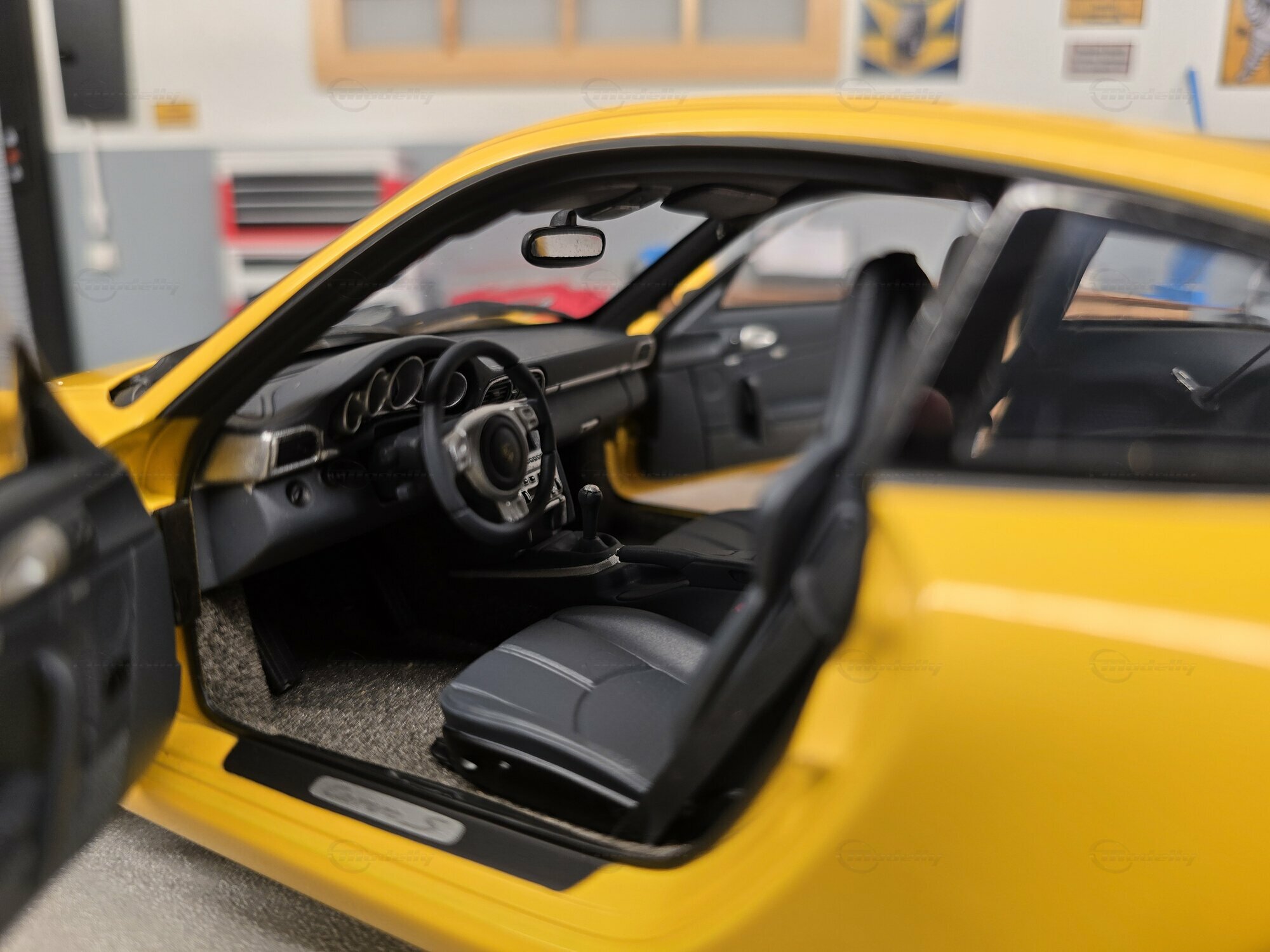 Bei dem hier gezeigten Stück handelt es sich um ein Modellauto im Maßstab 1:18, hergestellt von AUTOart, das sich in der Sammlung des Modelly-Mitglieds „Play-X“ befindet. Die Proportionen sprechen klar für den Porsche 911 (997) Carrera S: gut erkennbar sind die kompakte 911-Silhouette, die abfallende Dachlinie, die runden Frontscheinwerfer, die bündig integrierten Türgriffe und die typische Form der vorderen Kotflügel. Das Miniaturfahrzeug ist auf Basis des Materials Diecast gefertigt, was sich in der definierten Darstellung der Karosseriekanten, Türen und Anbauteile zeigt. Ebenfalls sichtbar sind silberfarbene Mehrspeichenräder mit gelochten Bremsscheiben und gelben Bremssätteln, was zur Carrera-S-Konfiguration passt. Die Außenspiegel sind in Wagenfarbe lackiert, die Fensterrahmen erscheinen dunkel ausgeführt, und auf der Fronthaube sitzt ein kleines Porsche-Wappen. Die Bilder zeigen mehrere Perspektiven des Fahrzeugs in einer Werkstattkulisse mit Hebebühne, Werkzeugwagen, Wanddekor und Porsche-bezogenen Schildern. Gerade für Sammler ist diese Präsentation interessant, weil die Form des Modells aus verschiedenen Blickwinkeln nachvollziehbar wird und die Linienführung des 997 gut sichtbar bleibt.