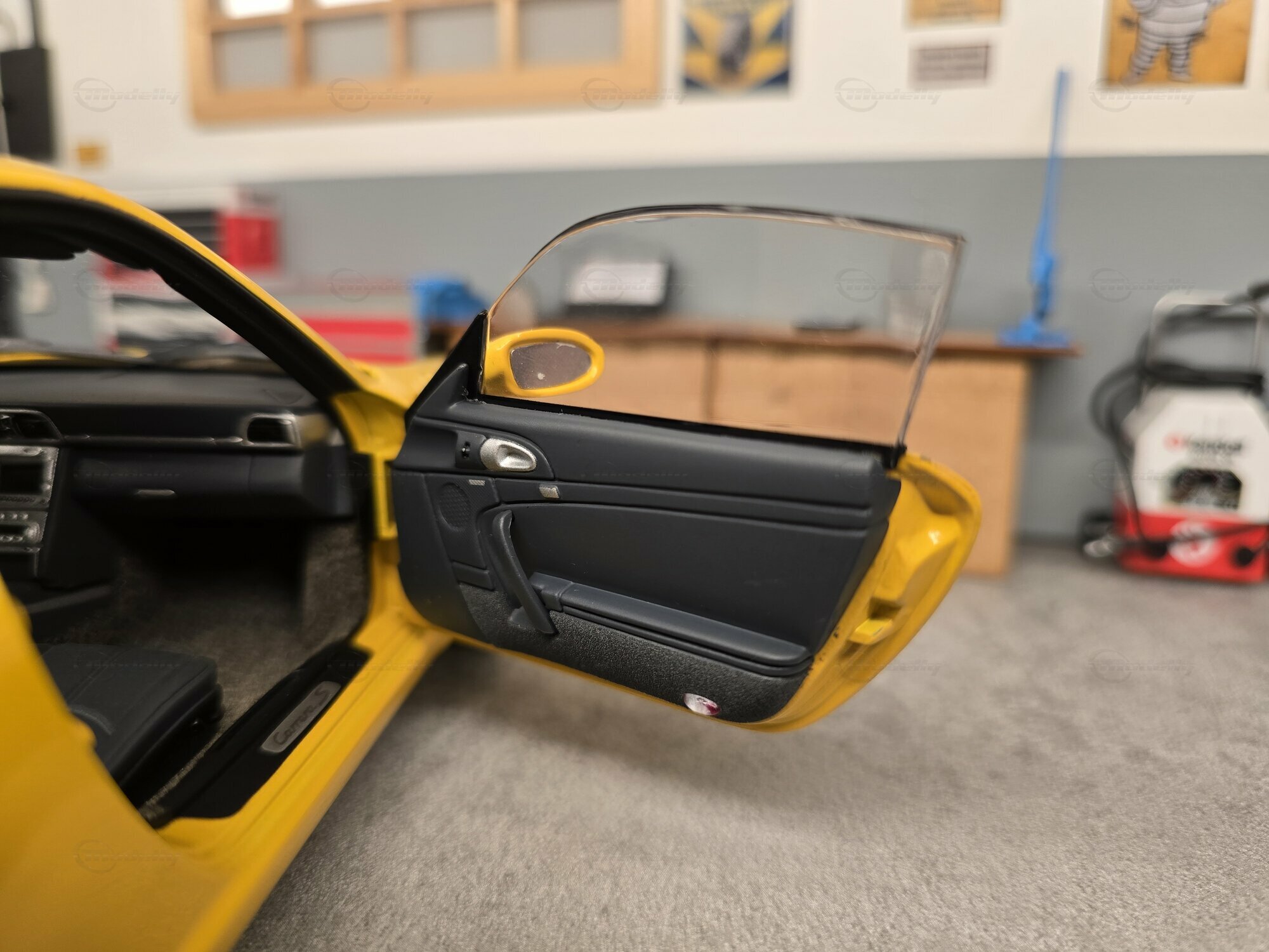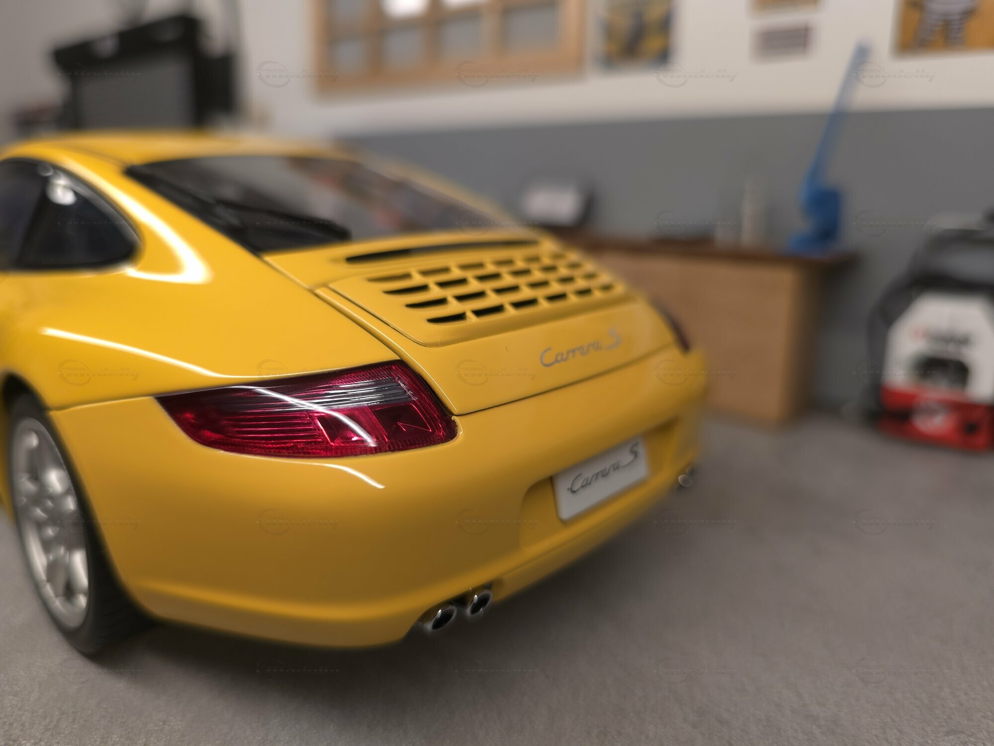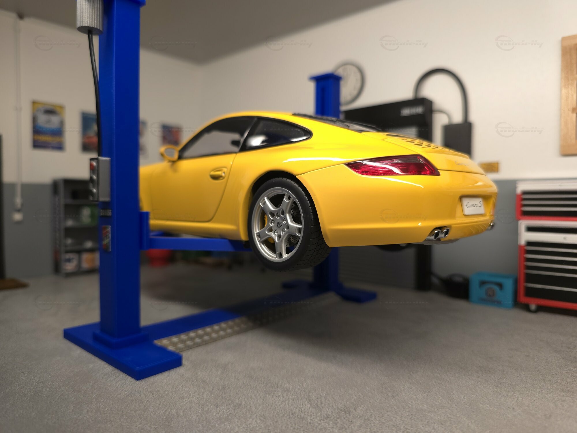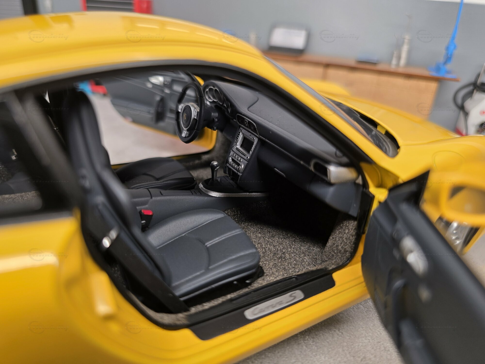Bei dem hier gezeigten Stück handelt es sich um ein Modellauto im Maßstab 1:18, hergestellt von AUTOart, das sich in der Sammlung des Modelly-Mitglieds „Play-X“ befindet. Die Proportionen sprechen klar für den Porsche 911 (997) Carrera S: gut erkennbar sind die kompakte 911-Silhouette, die abfallende Dachlinie, die runden Frontscheinwerfer, die bündig integrierten Türgriffe und die typische Form der vorderen Kotflügel. Das Miniaturfahrzeug ist auf Basis des Materials Diecast gefertigt, was sich in der definierten Darstellung der Karosseriekanten, Türen und Anbauteile zeigt. Ebenfalls sichtbar sind silberfarbene Mehrspeichenräder mit gelochten Bremsscheiben und gelben Bremssätteln, was zur Carrera-S-Konfiguration passt. Die Außenspiegel sind in Wagenfarbe lackiert, die Fensterrahmen erscheinen dunkel ausgeführt, und auf der Fronthaube sitzt ein kleines Porsche-Wappen. Die Bilder zeigen mehrere Perspektiven des Fahrzeugs in einer Werkstattkulisse mit Hebebühne, Werkzeugwagen, Wanddekor und Porsche-bezogenen Schildern. Gerade für Sammler ist diese Präsentation interessant, weil die Form des Modells aus verschiedenen Blickwinkeln nachvollziehbar wird und die Linienführung des 997 gut sichtbar bleibt.