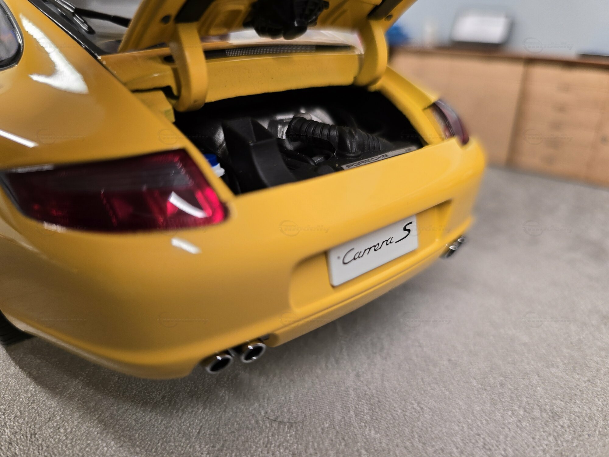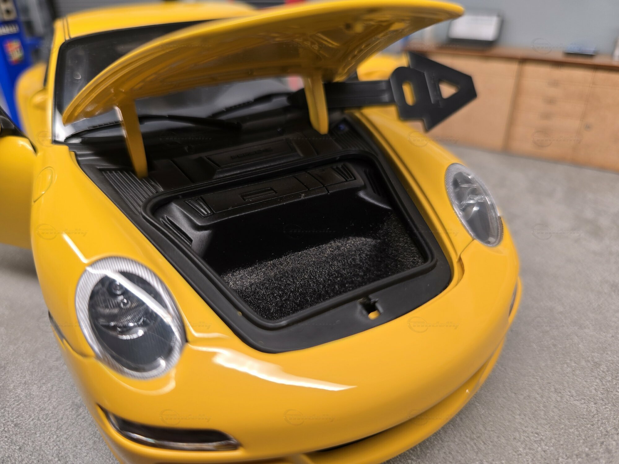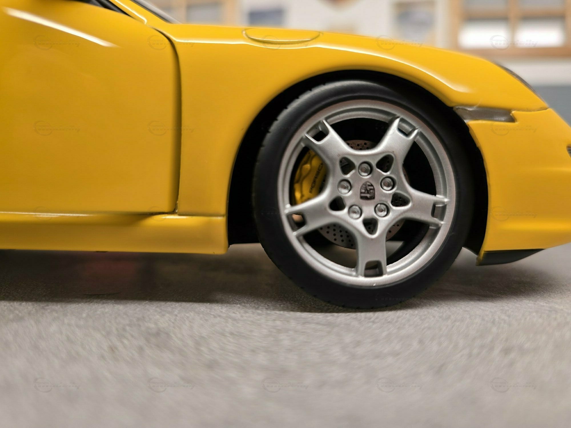 Die Lackierung des Modells erscheint in Gelb, angelehnt an einen klassischen Porsche-Farbton aus dem Serienprogramm. Die Oberfläche wirkt gleichmäßig, mit klaren Lichtreflexen auf Haube, Dach und Flanken. Dadurch lassen sich die gewölbten Formen des Porsche 911 (997) Carrera S gut erkennen: die vorn ansteigenden Kotflügel, die sanft modellierte Fronthaube und die fließende Seitenlinie bis zum Heck. An der Front sind die ovalen Scheinwerfereinheiten mit innerer Struktur sichtbar, ebenso die schmalen Leuchten in der Stoßfängerzone und die horizontalen Öffnungen im unteren Lufteinlassbereich. Die Seitenansicht zeigt die kompakte Kabine, das kleine hintere Seitenfenster und die klassische 2+2-Coupé-Form. Die Felgen lassen sich auf den Fotos nicht mit letzter Sicherheit einem bestimmten Zubehörhersteller oder einer Tuningmarke zuordnen; sie entsprechen optisch jedoch dem Stil seriennaher Porsche-Carrera-S-Räder. Hinweise auf eine eindeutig identifizierbare Tuningfirma sind an dem gezeigten Fahrzeug nicht erkennbar. Das trägt dazu bei, dass das Modell einen seriennahen Eindruck vermittelt, der für viele 911-Sammler relevant ist. Auch die Innenraumansicht bleibt dezent, mit dunkler Farbgebung, passend zu einem straßennah konfigurierten Porsche 911 (997) Carrera S.