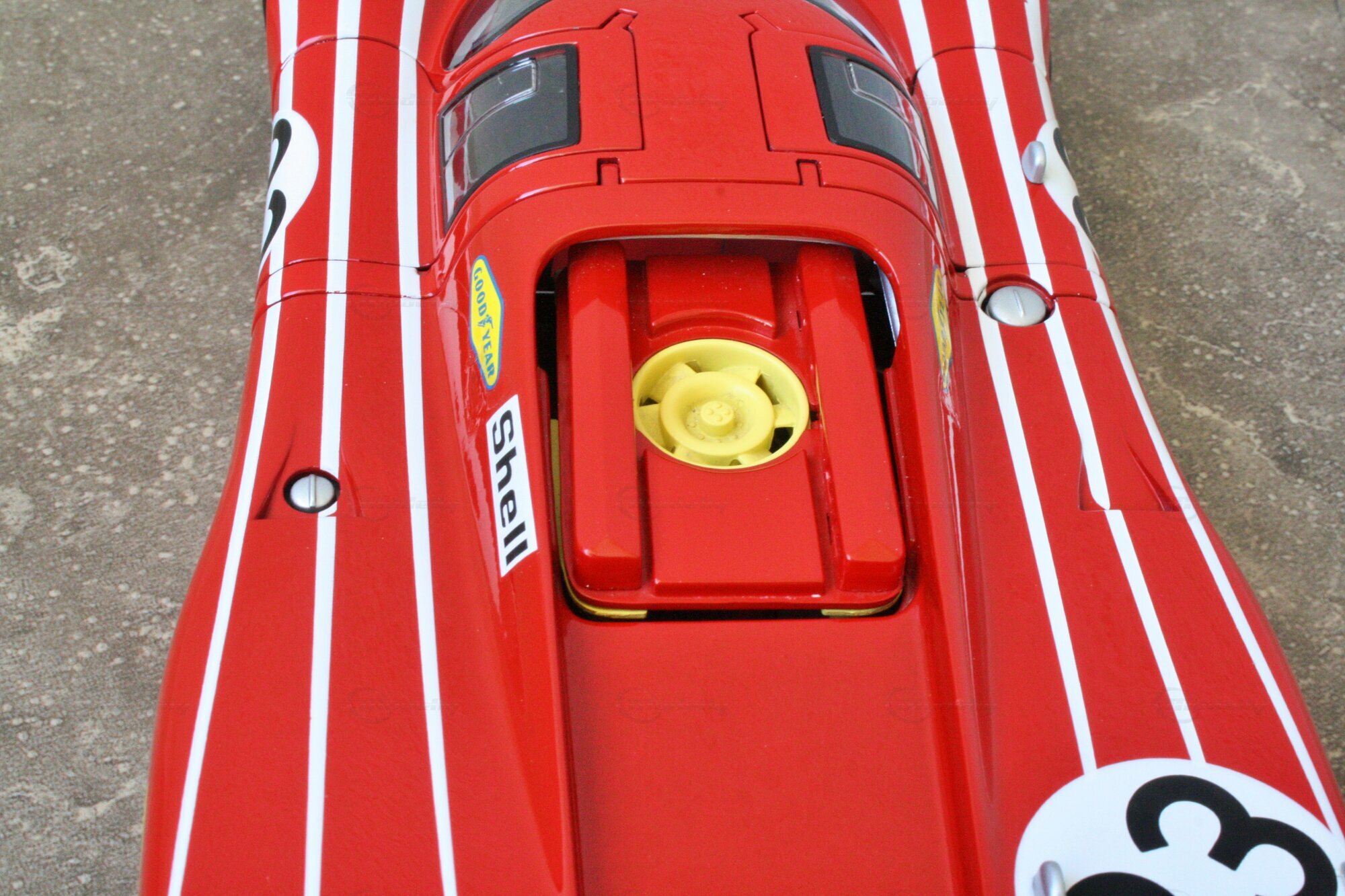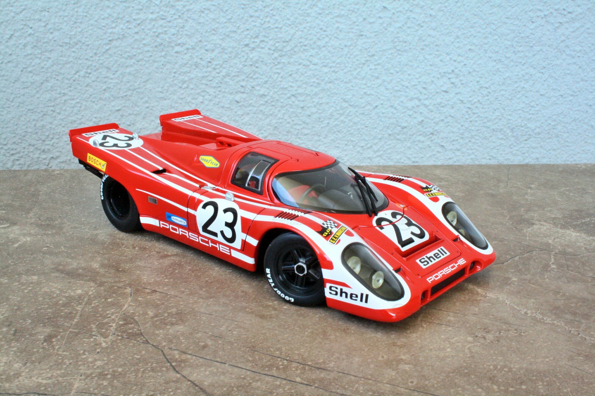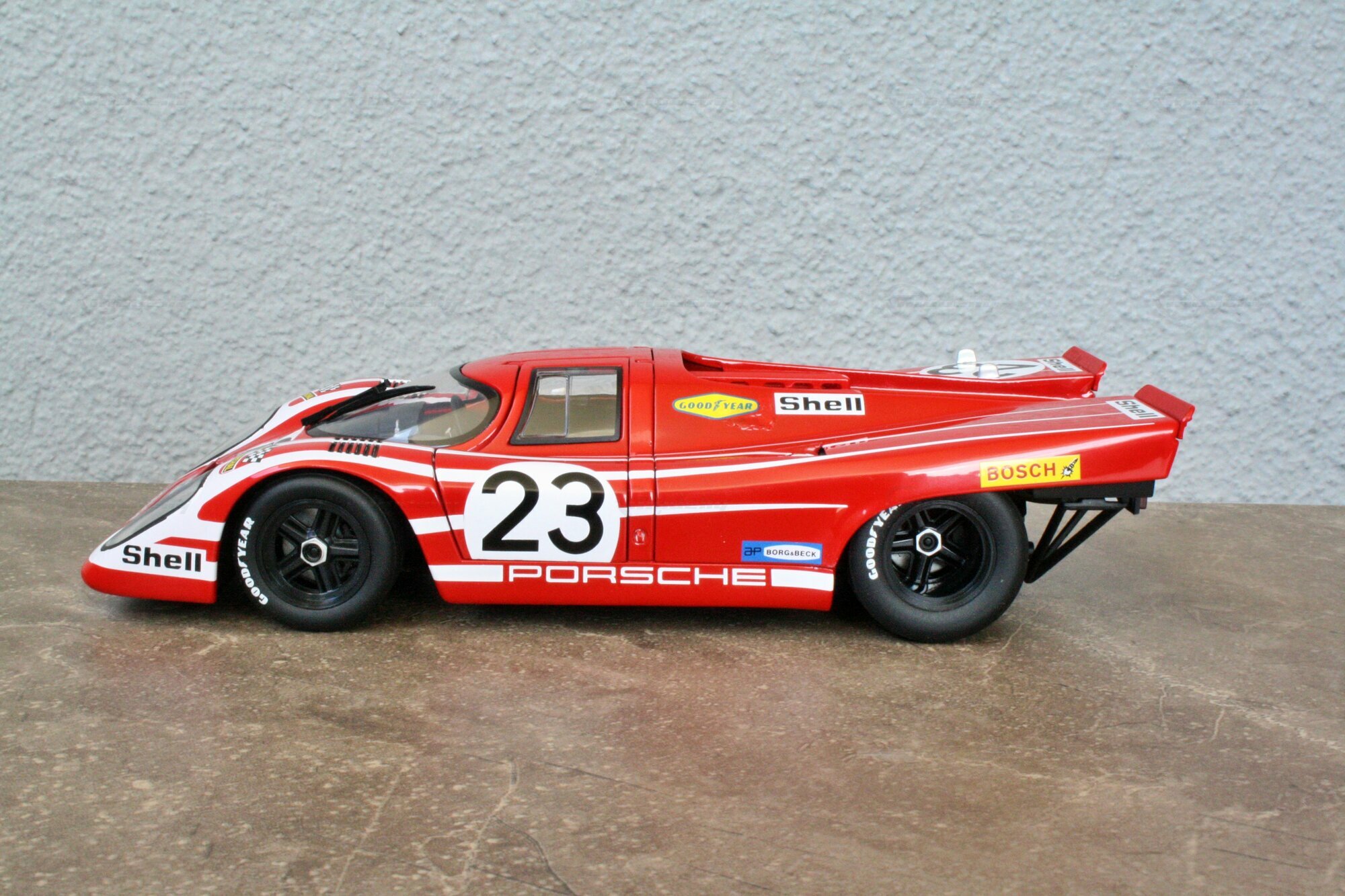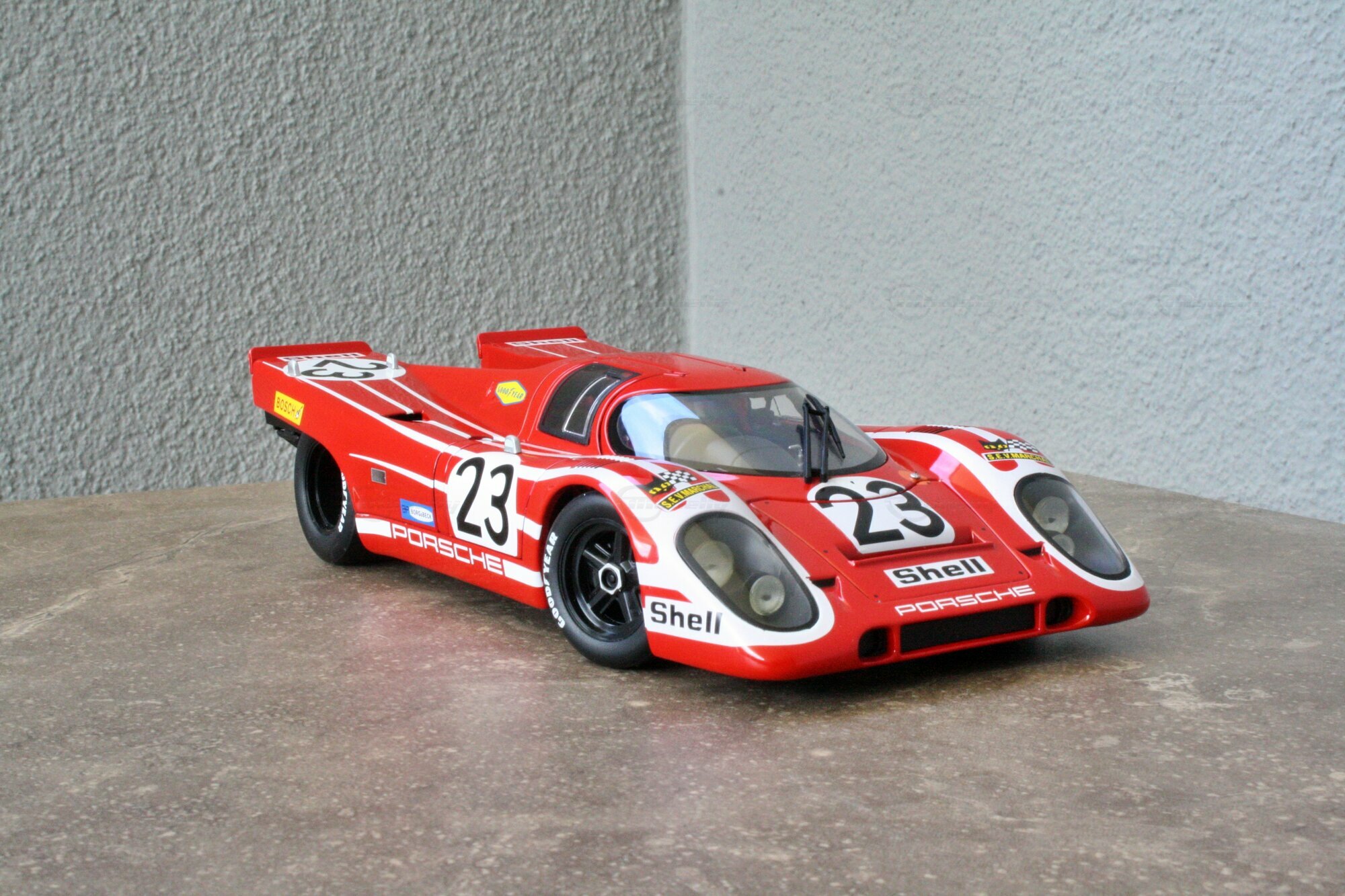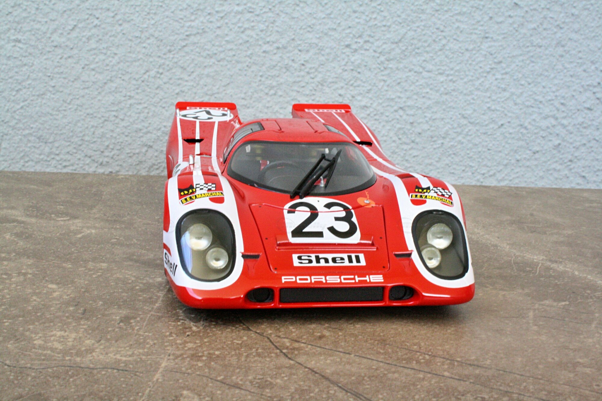 Das hier gezeigte Modell des Porsche 917 K im Maßstab 1:18 stammt vom angesehenen Hersteller AUTOart und ist aus hochwertigem Diecast-Material gefertigt. Das Modell ist Teil der Sammlung von Modelly-Mitglied "Play-X" und zeigt alle markanten Details des Originals wie die aerodynamische Form, die speziellen Scheinwerfer und die typischen Sponsorenlogos. Auffällig ist die Lackierung in Rot-Weiß mit der Startnummer „23“ sowie den Sponsorenlogos von unter anderem Shell und Goodyear. Das Modell fängt den Geist und die Details des historischen Rennwagens auf bemerkenswerte Weise ein.