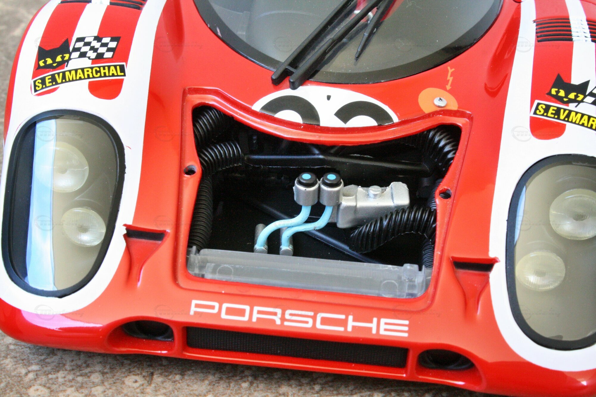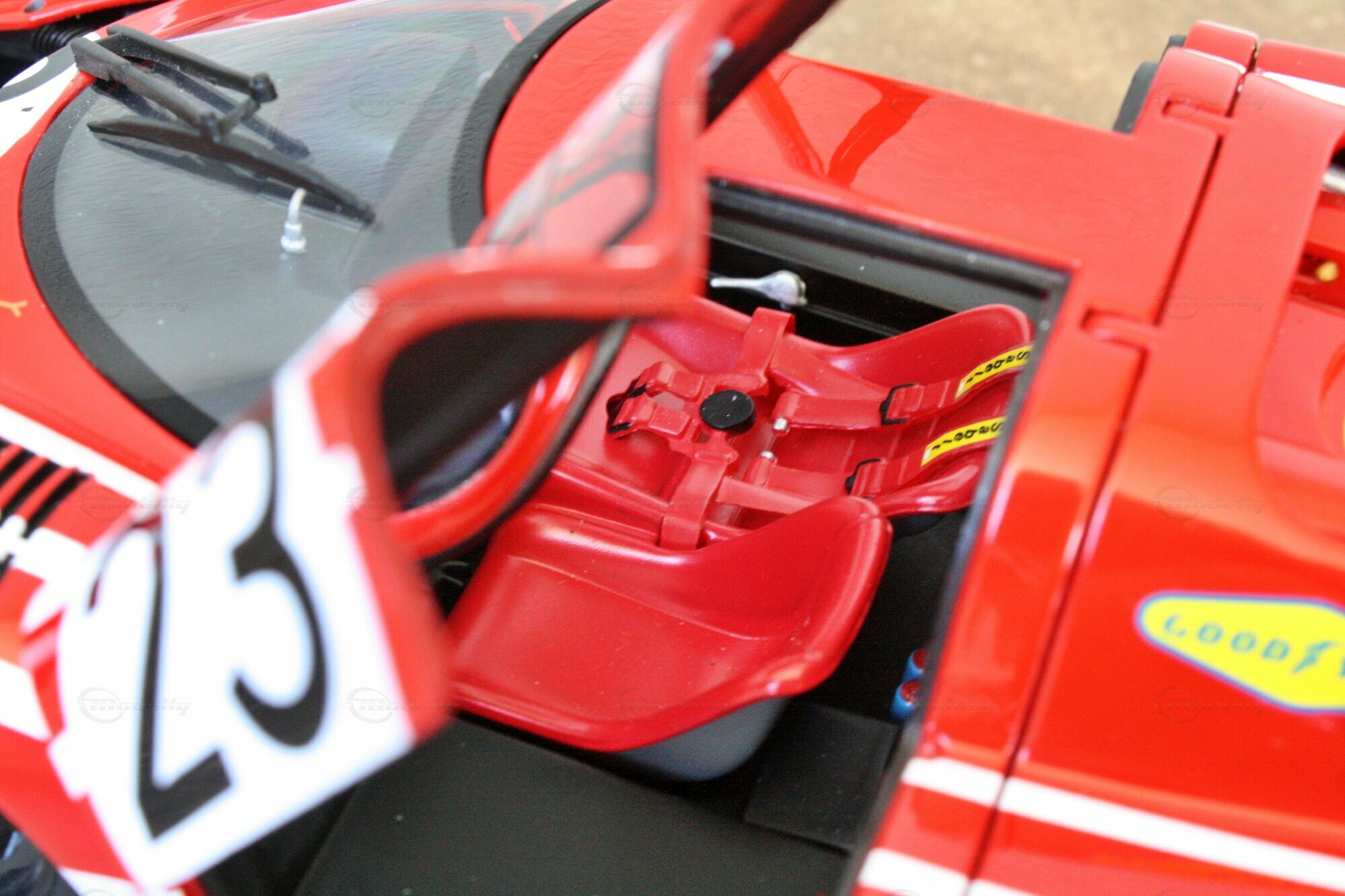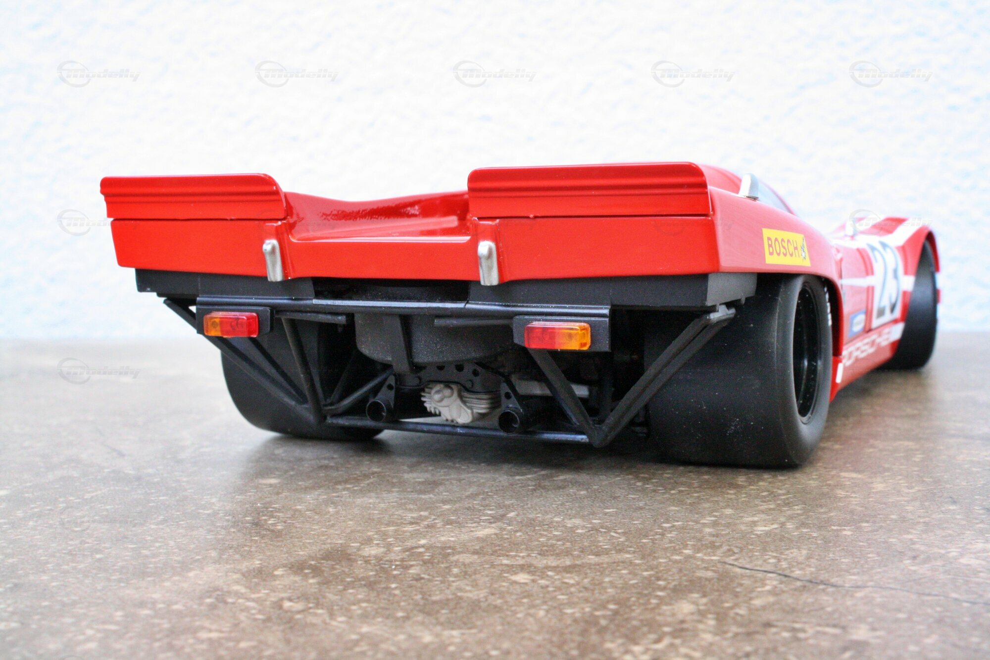 Dieses Modell des AUTOart Porsche 917 K im Maßstab 1:18 glänzt durch seine präzise Nachbildung und die authentischen Details. Die Lackierung in leuchtendem Rot, die mit weißen Streifen und den deutlich sichtbaren Sponsorenlogos versehen ist, ist präzise ausgeführt und verleiht dem Modell eine hohe Authentizität. Die Startnummer „23“ ist ein markantes Merkmal, ebenso wie die sorgfältig nachgebildeten Details des Innenraums. Die Reifen mit Goodyear-Logo, die feinen Lüftungsschlitze und die exakt nachempfundenen Lufteinlässe machen dieses Modell zu einem besonderen Highlight für Sammler und Fans historischer Rennboliden.