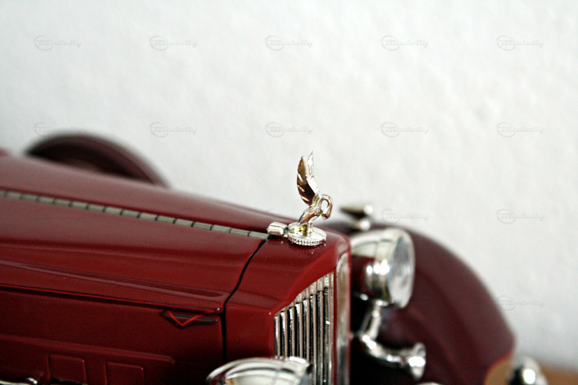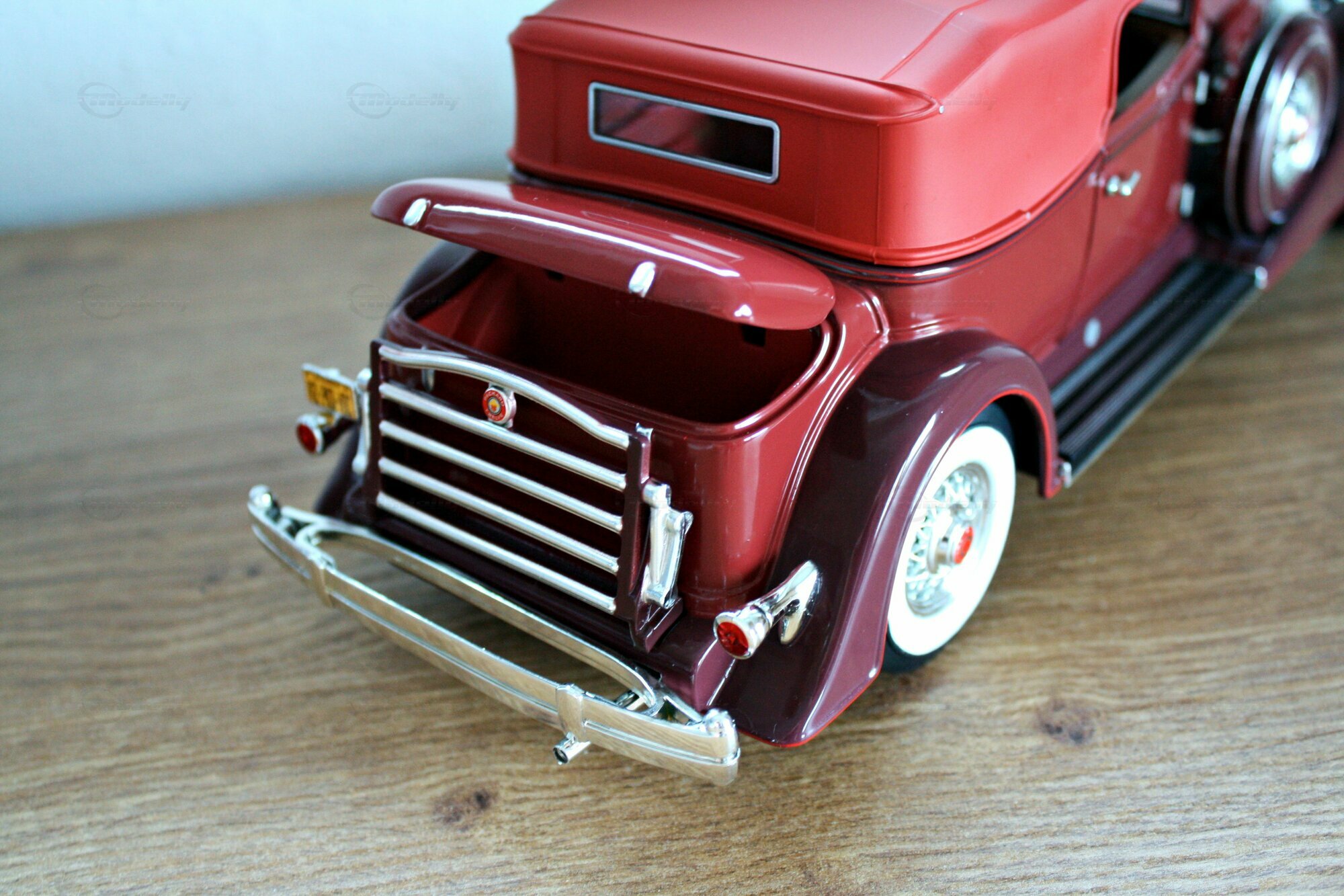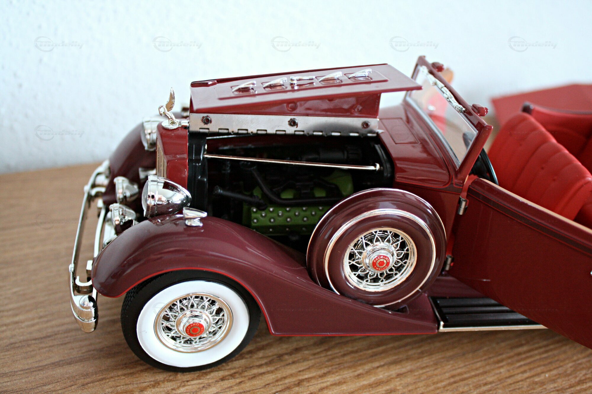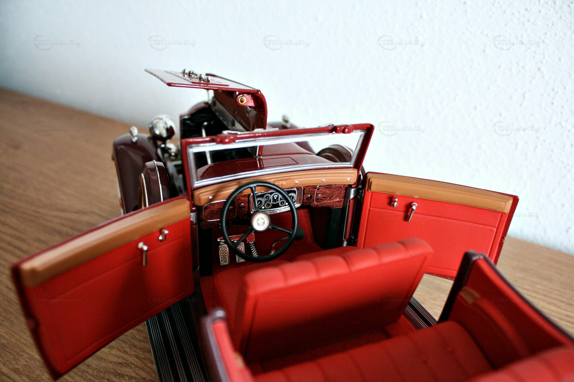 Das Farbschema des Modells entspricht dem tiefen Bordeauxrot des Originals. Besonders hervorzuheben sind die Weißwandreifen und die verchromten Radkappen, die perfekt nachgebildet wurden. Jedes Detail, von den Scheinwerfern über die markanten Kühlergrillstreifen bis hin zur detaillierten Inneneinrichtung, wurde originalgetreu umgesetzt. Spezielle Merkmale wie der rot lackierte Stoff-Cabriodach und die filigranen Seitenspiegel runden das Bild eines absolut realistischen Miniaturmodells ab.