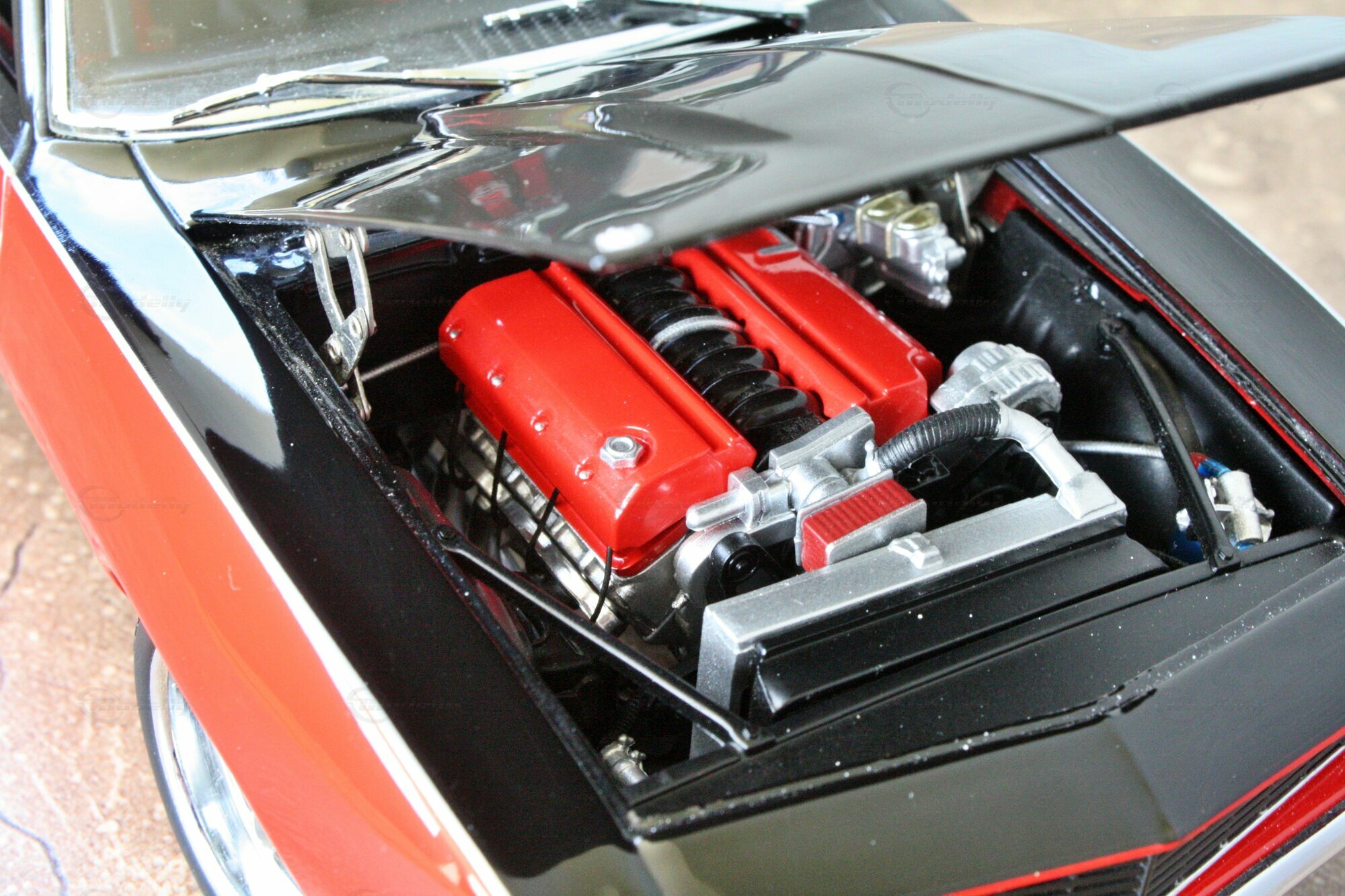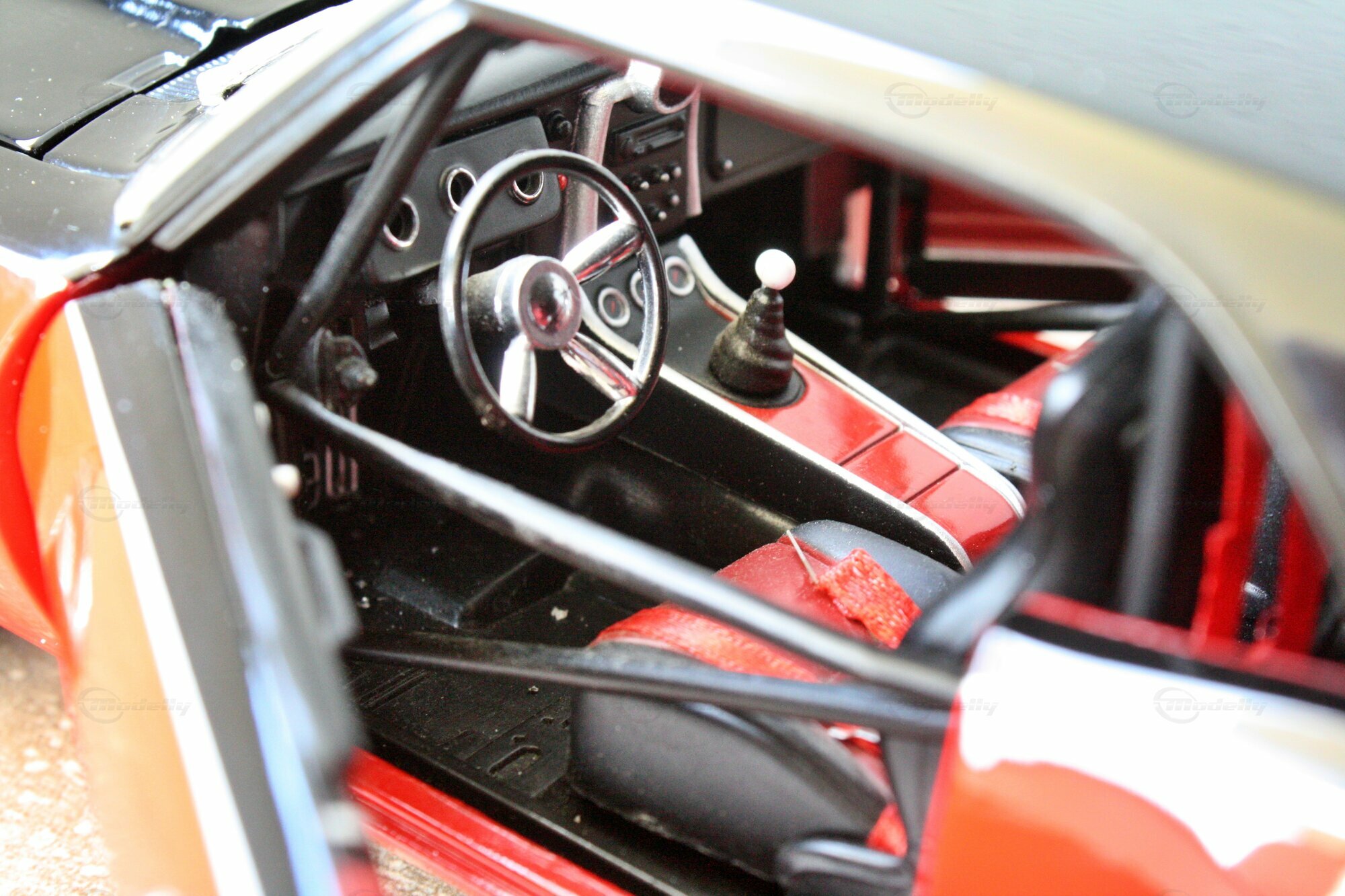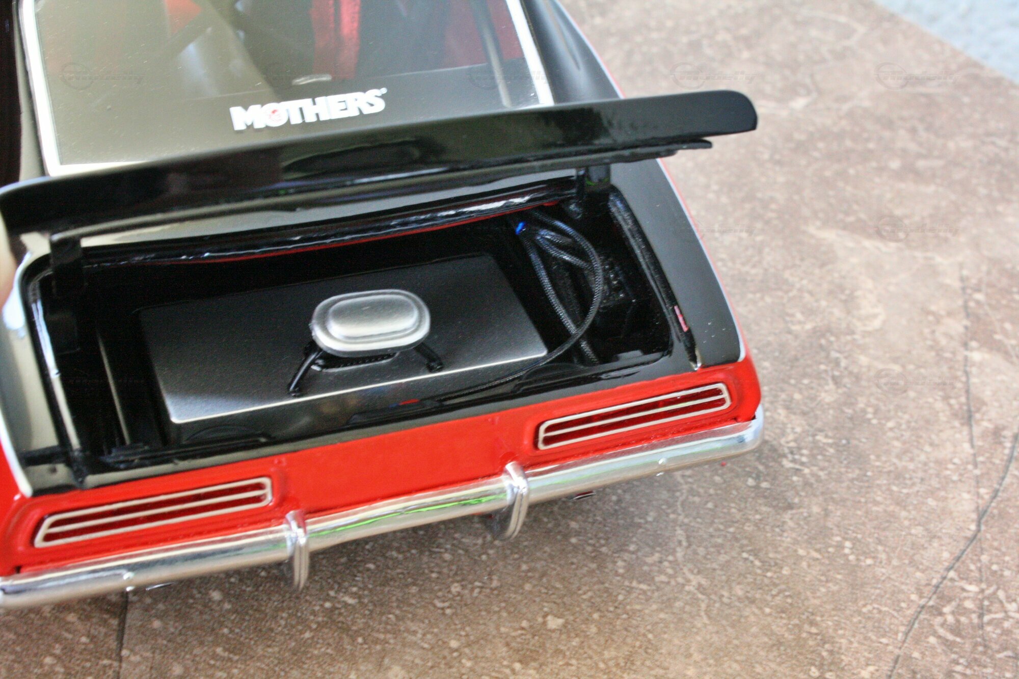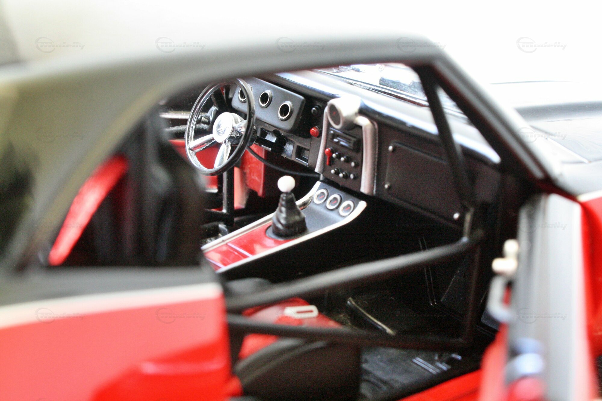 Die Lackierung des Modellautos bleibt unverwechselbar. Das auffällige Zwei-Farben-Design in Schwarz und Rot verleiht dem Modell eine sportliche und aggressive Optik. Die schwarzen Akzente auf der Motorhaube und dem Dach heben sich stark vom Rest des Fahrzeugs ab und geben dem Modell einen interessanten Kontrast. Auf der Motorhaube ist außerdem ein dezentes Badge zu sehen, das das Gesamtbild vervollständigt. In Kombination mit den silbernen Akzenten und Chromdetails lässt dies das Modell noch realistischer wirken. Das Modell besticht zudem durch seine akkurate, detailgetreue Umsetzung der Karosserie und der Formgebung des Originals. Alle Details wie Türgriffe, Spiegel und Lüftungsschlitze sind präzise nachgebildet. Dieses Modell ist für Sammler, die Wert auf Authentizität und Detailreichtum legen, besonders interessant. Als Teil einer limitierten Serie von nur 996 Stücken weltweit bietet es ein hohes Maß an Exklusivität und Sammelwert.
