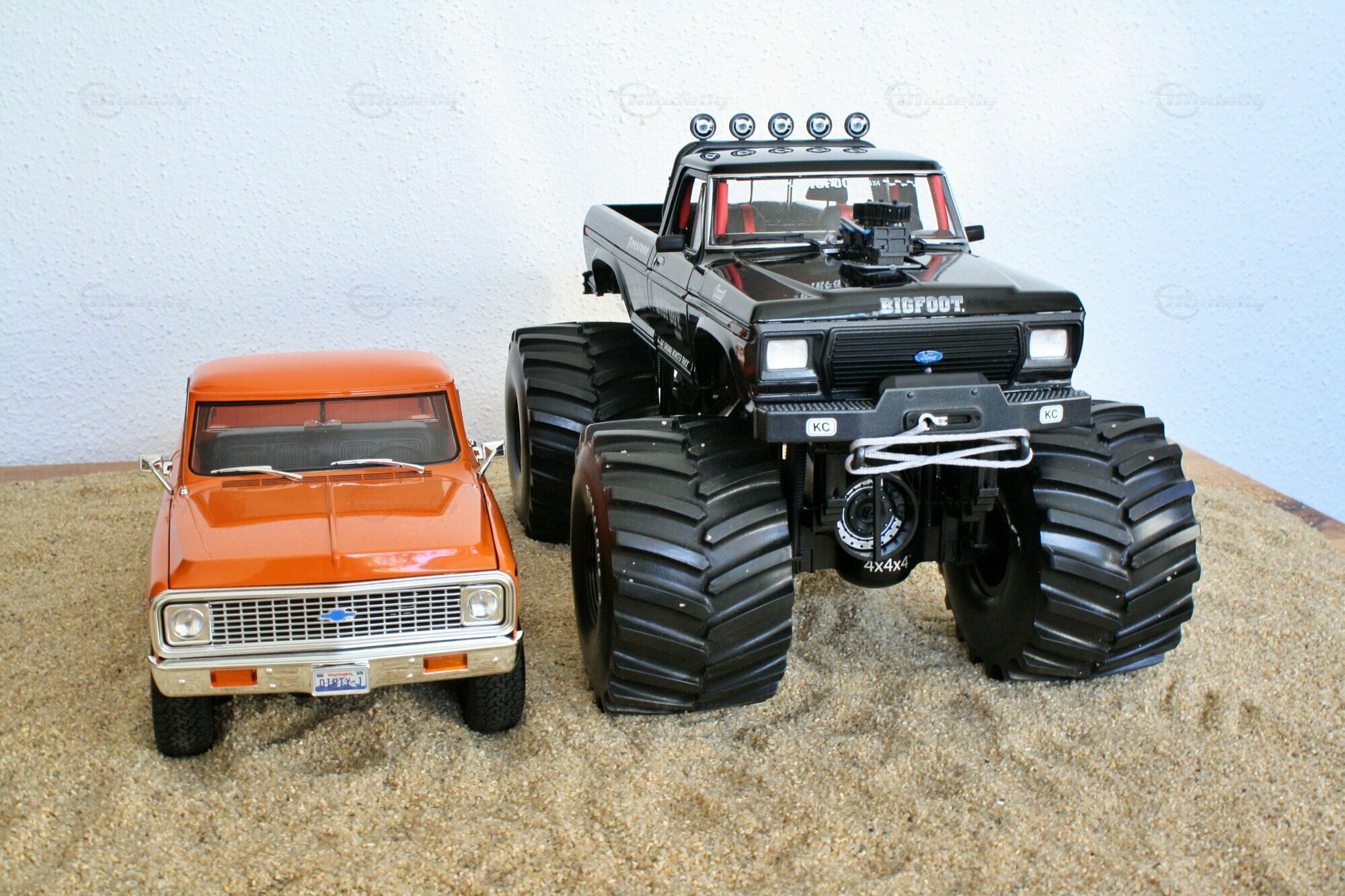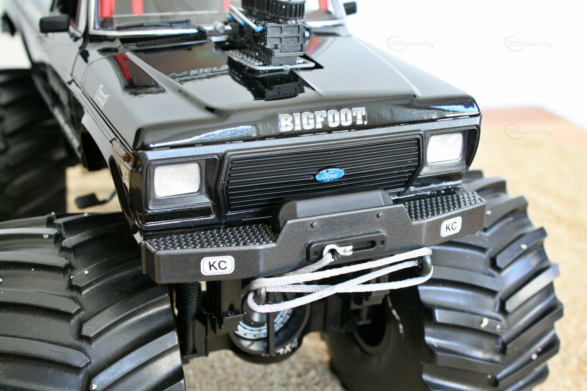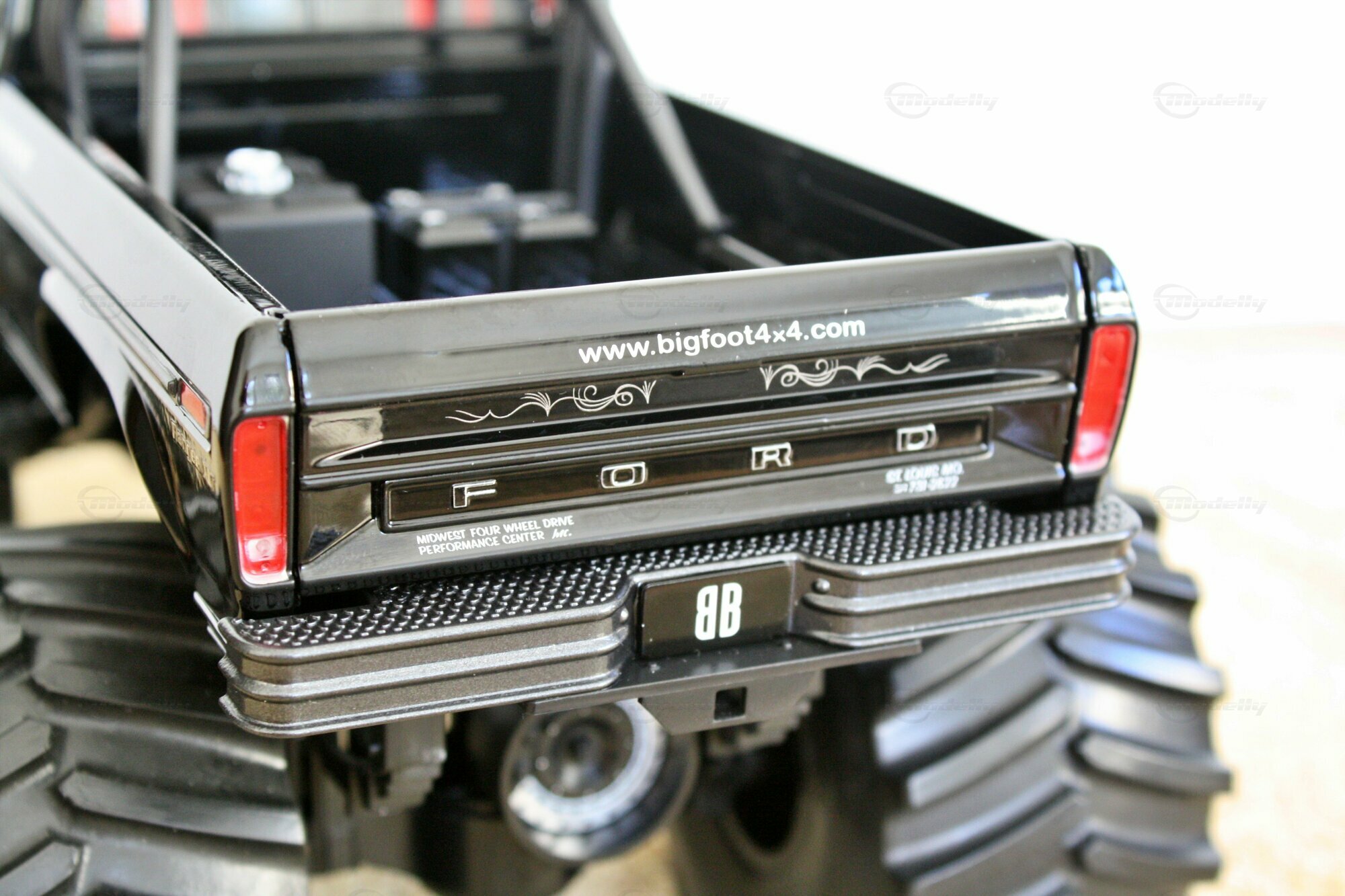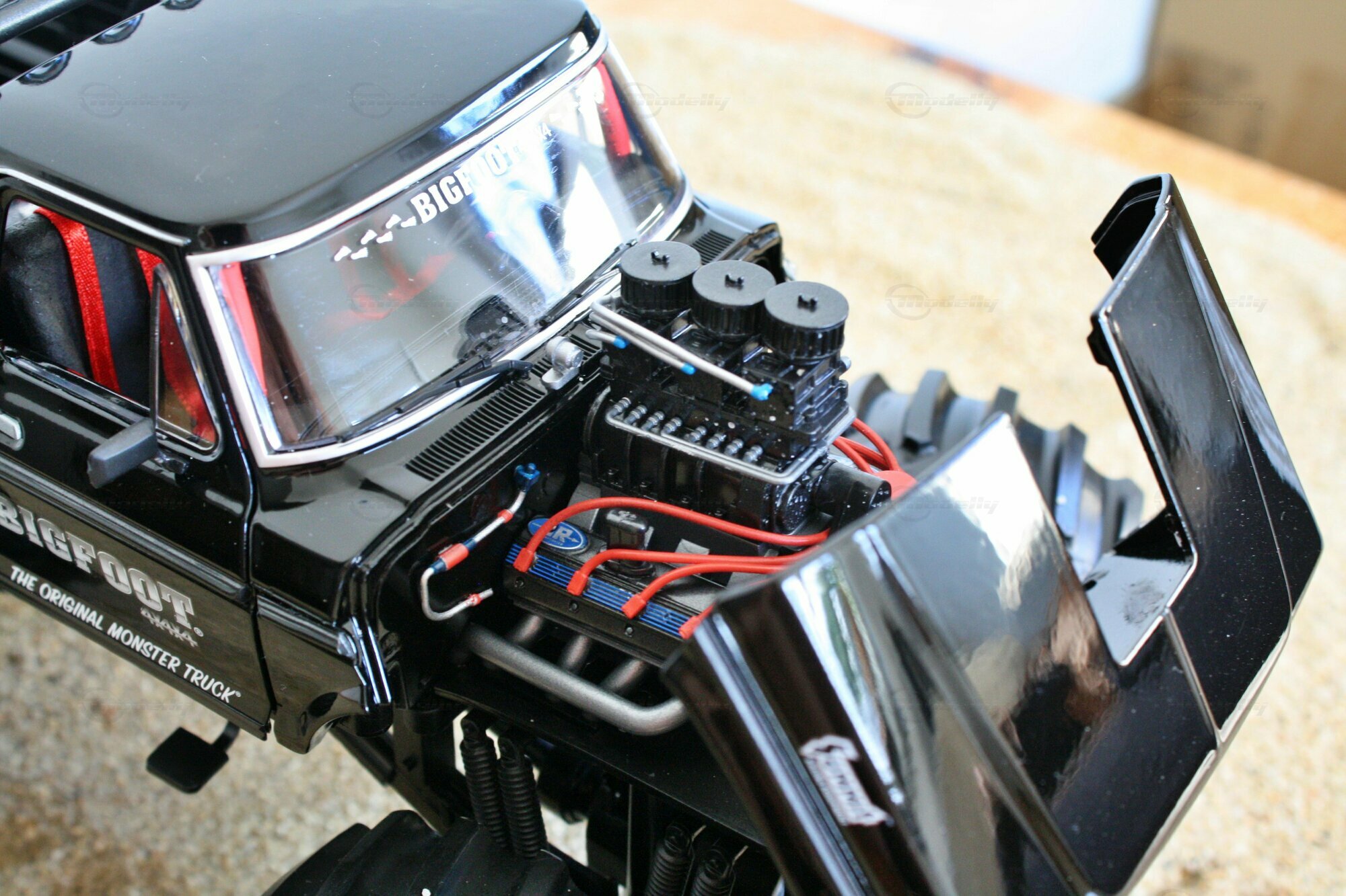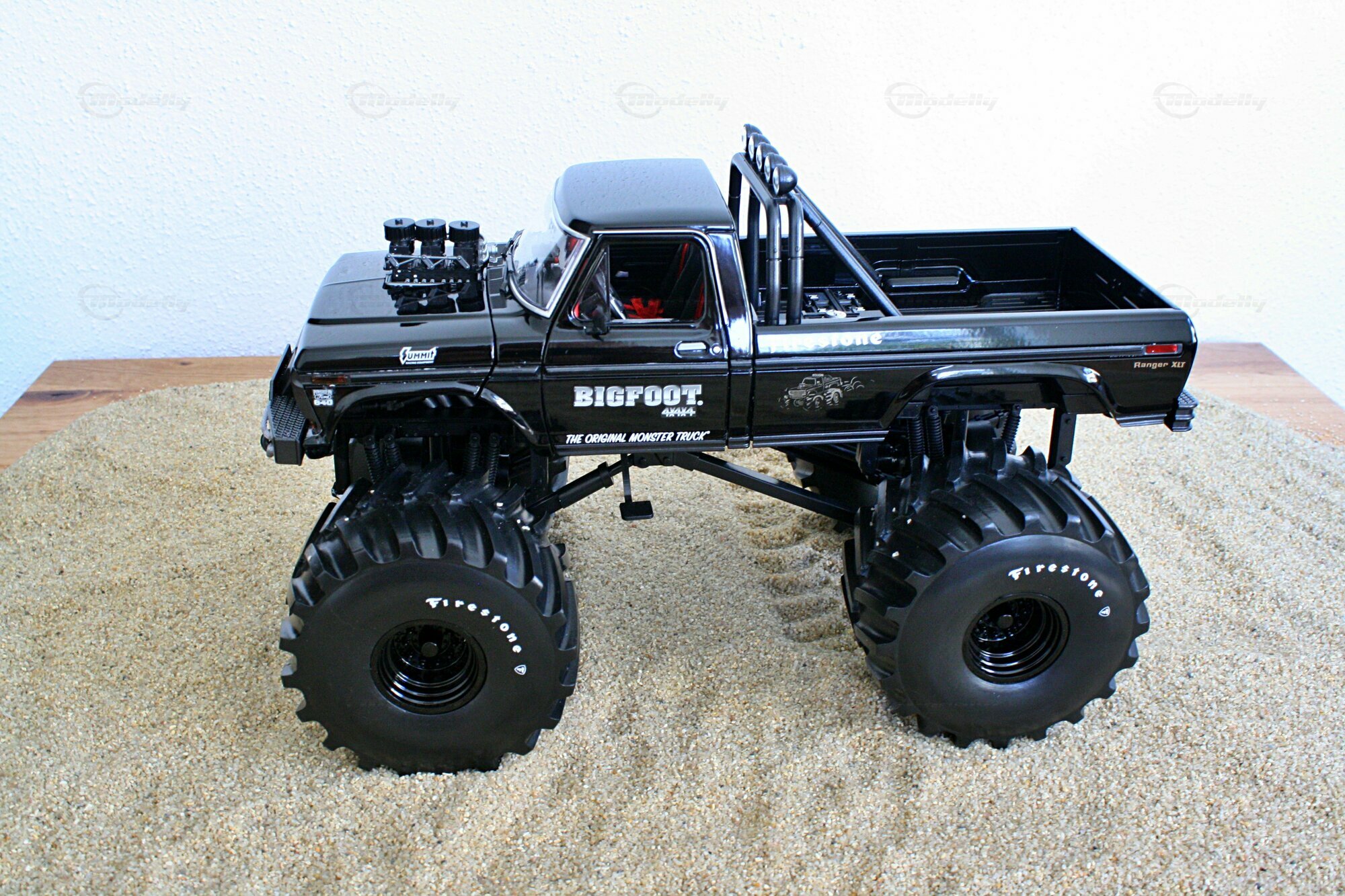 Die Modifikationen beinhalten markante Veränderungen an der Karosserie, die im Vergleich zum Original auffallen. Insbesondere die großen Offroad-Reifen und die zusätzlichen Lichtbalken auf dem Dach heben das Modell hervor. Solche Anpassungen sind typisch für Enthusiasten, die ihren Modellen einen persönlichen Touch verleihen möchten. Diese spezielle Version des Modellautos ist zudem in einem tiefschwarzen Glanzlack gehalten, was die robuste und dennoch elegante Erscheinung des Fahrzeugs betont. Der Schriftzug "Bigfoot" auf der Motorhaube und an den Seiten gibt dem Modell eine zusätzliche Note von Individualität und Authentizität.
