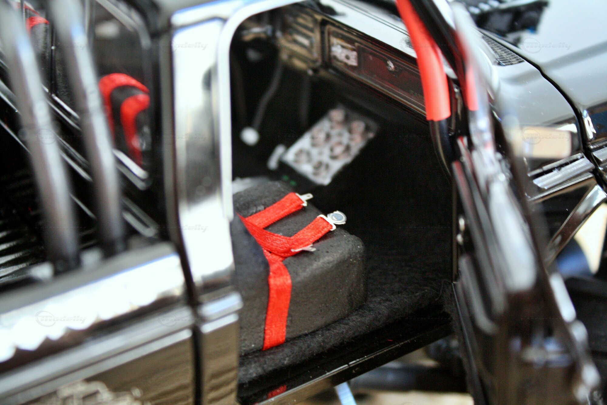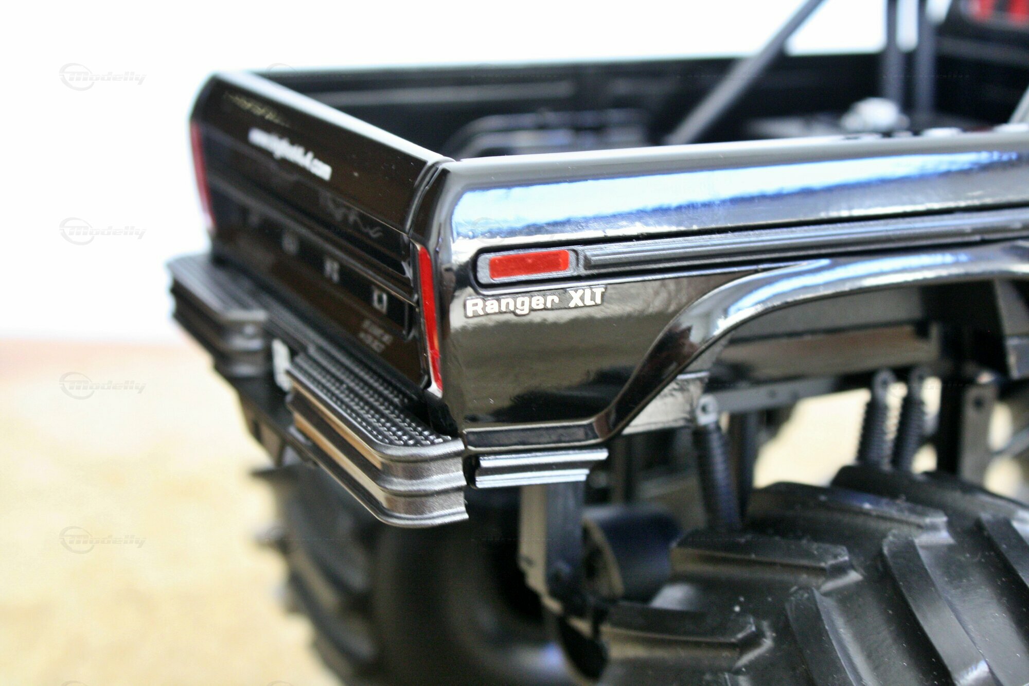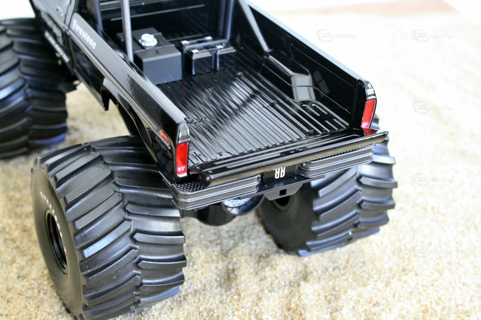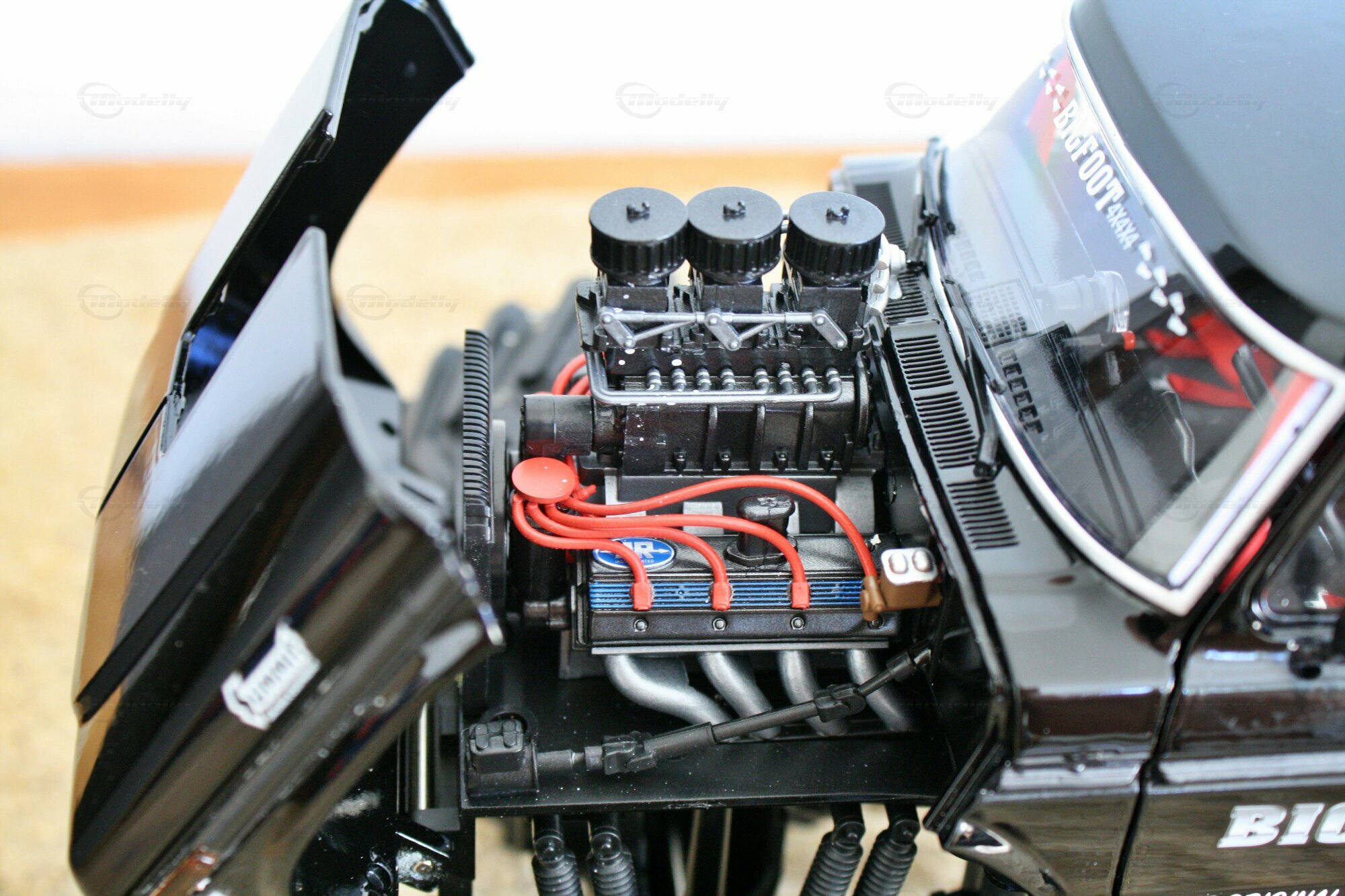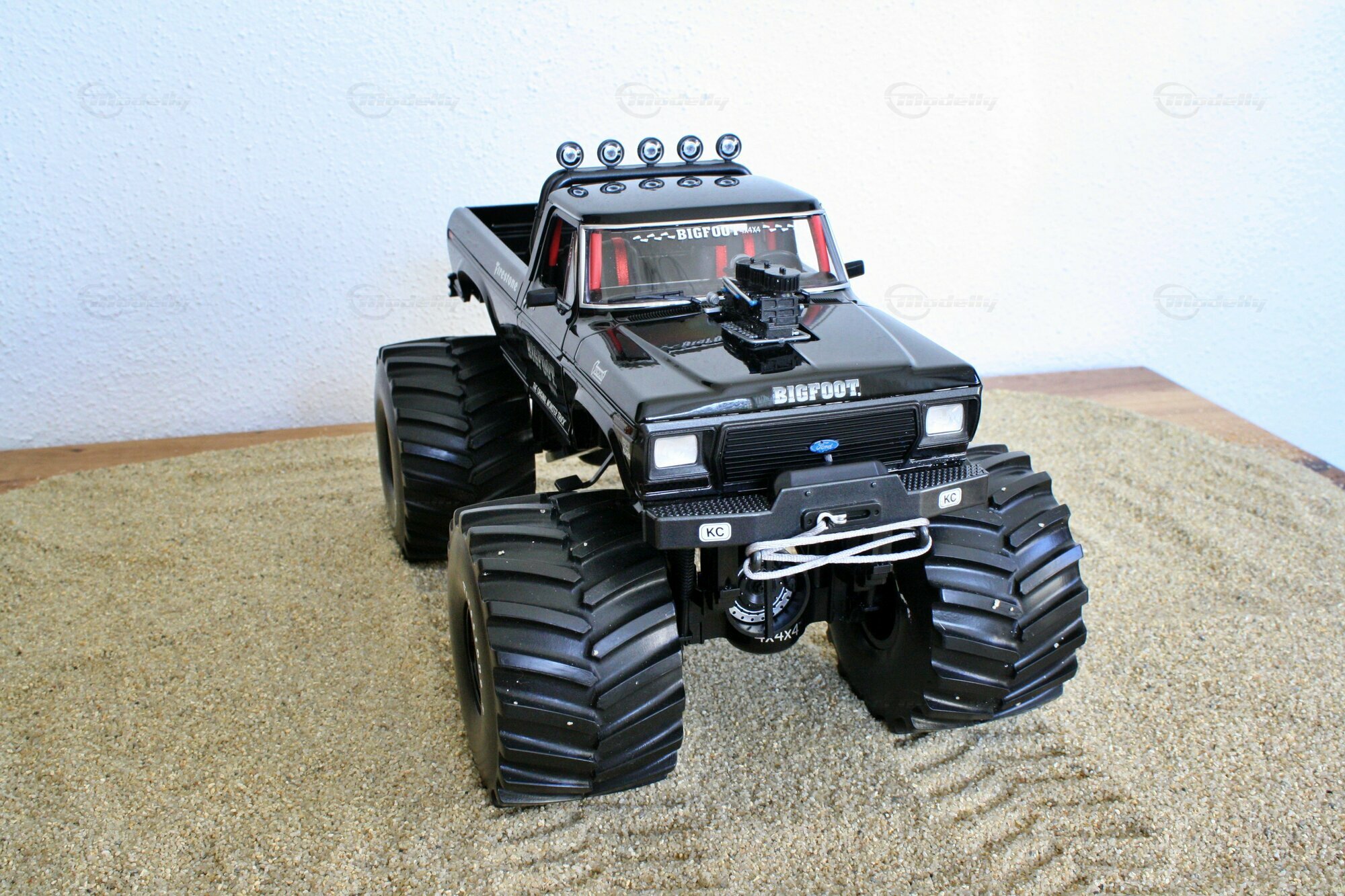 Die Modifikationen beinhalten markante Veränderungen an der Karosserie, die im Vergleich zum Original auffallen. Insbesondere die großen Offroad-Reifen und die zusätzlichen Lichtbalken auf dem Dach heben das Modell hervor. Solche Anpassungen sind typisch für Enthusiasten, die ihren Modellen einen persönlichen Touch verleihen möchten. Diese spezielle Version des Modellautos ist zudem in einem tiefschwarzen Glanzlack gehalten, was die robuste und dennoch elegante Erscheinung des Fahrzeugs betont. Der Schriftzug "Bigfoot" auf der Motorhaube und an den Seiten gibt dem Modell eine zusätzliche Note von Individualität und Authentizität.
