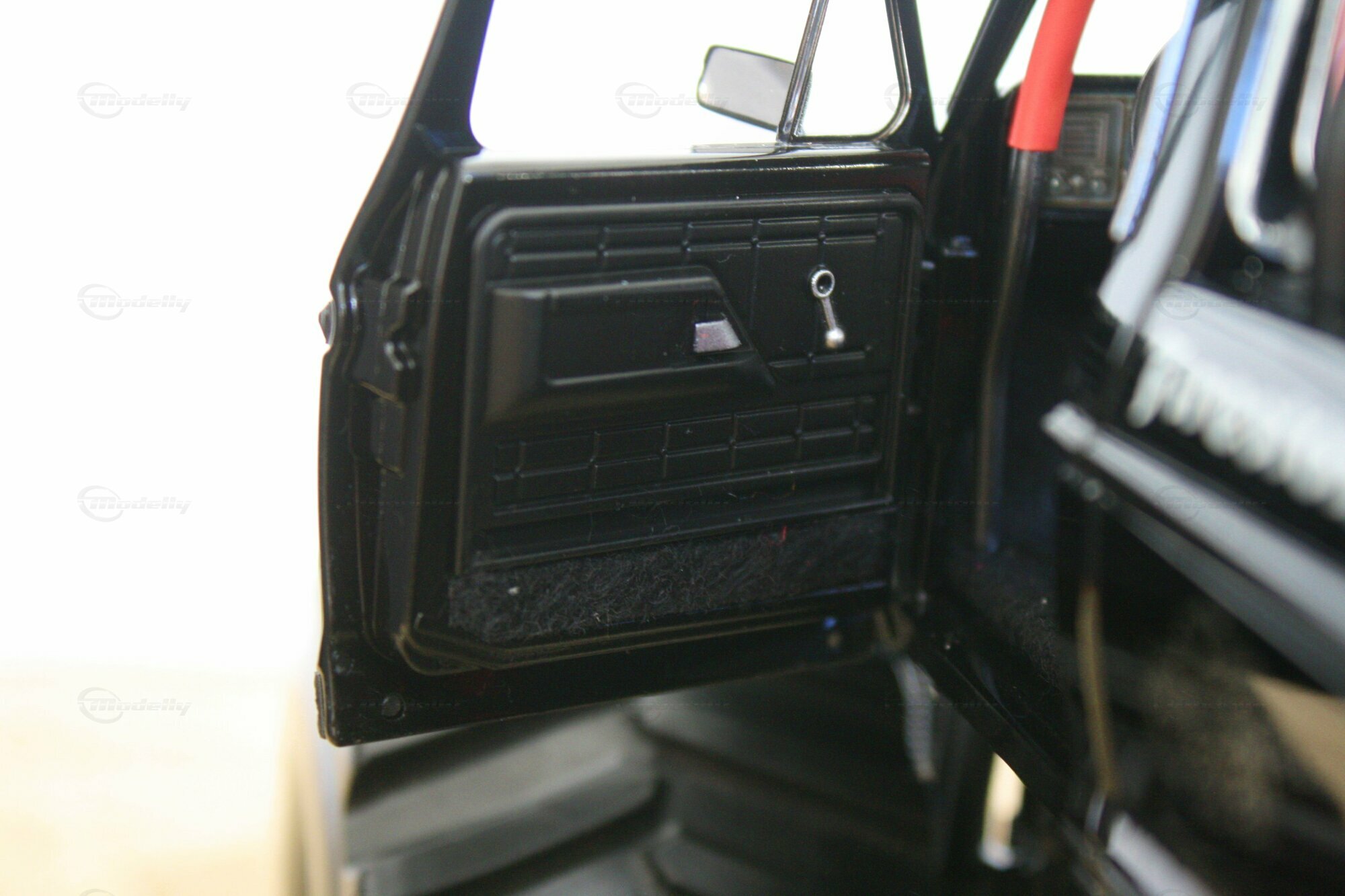 Die Detailgenauigkeit des Greenlight Modells im Maßstab 1:18 ist bemerkenswert. Es verfügt über ein detailliertes Cockpit mit realistischen Instrumenten, verstellbare Sitzreihen und eine nachgebildete Motorhaube, die den Zugang zum Motorblock ermöglicht. Die auf den Fotos sichtbaren Reifen, gefertigt von Firestone, unterstreichen die Offroad-Fähigkeiten des Fahrzeugs und verleihen dem Modell eine beeindruckende Präsenz. Weitere bemerkenswerte Details sind die nachgebildeten Türen, die sich öffnen lassen, sowie der sichtbar nachgebaute Motorraum, der die inneren mechanischen Details des Originals exzellent repliziert.