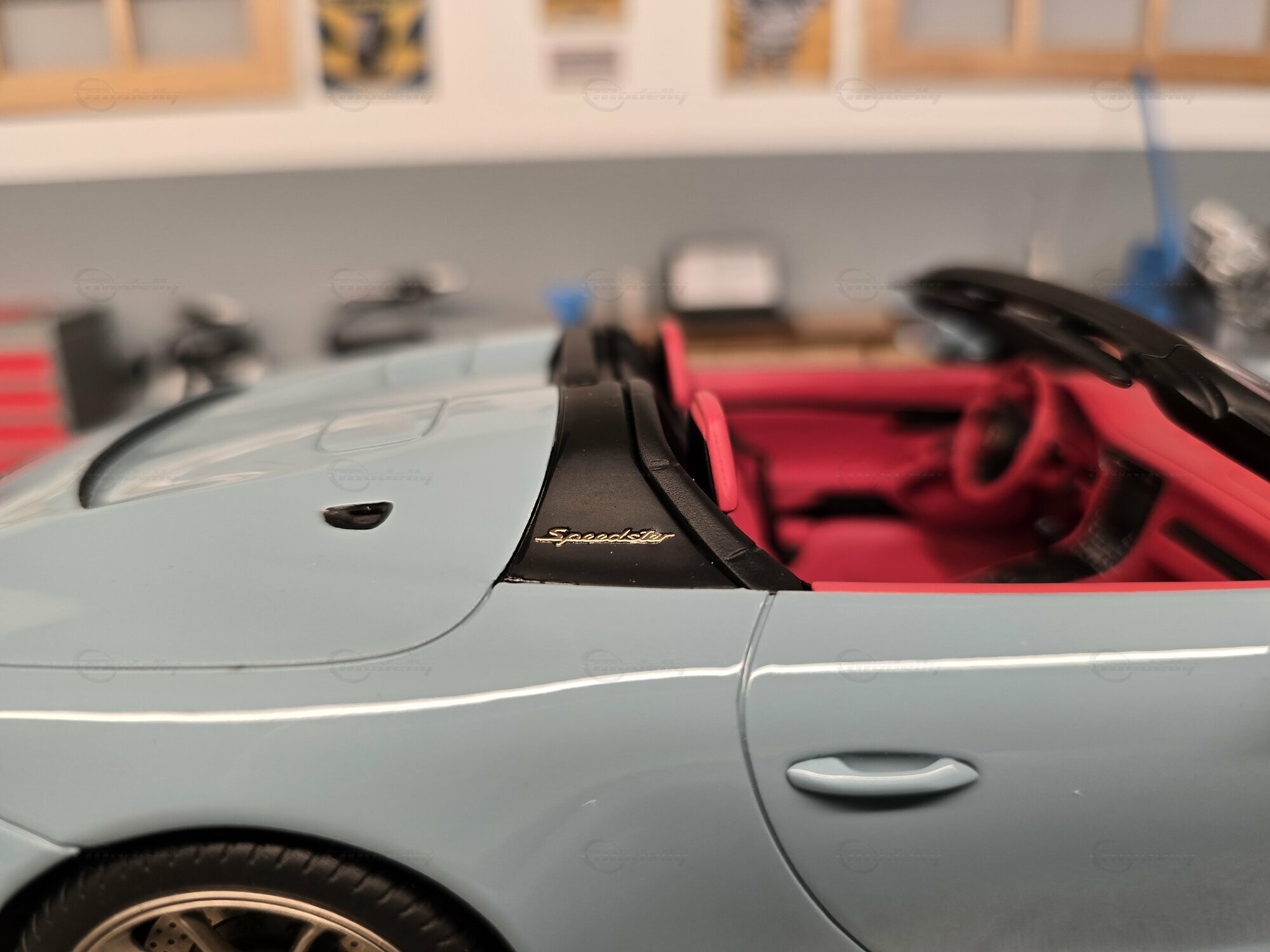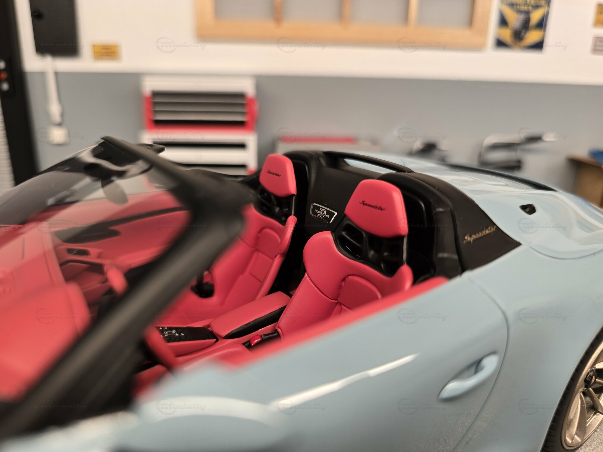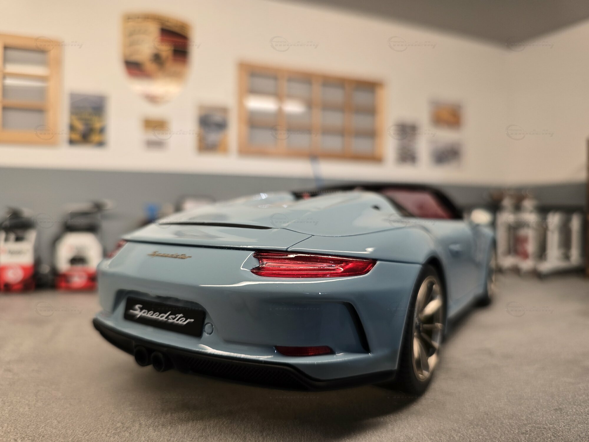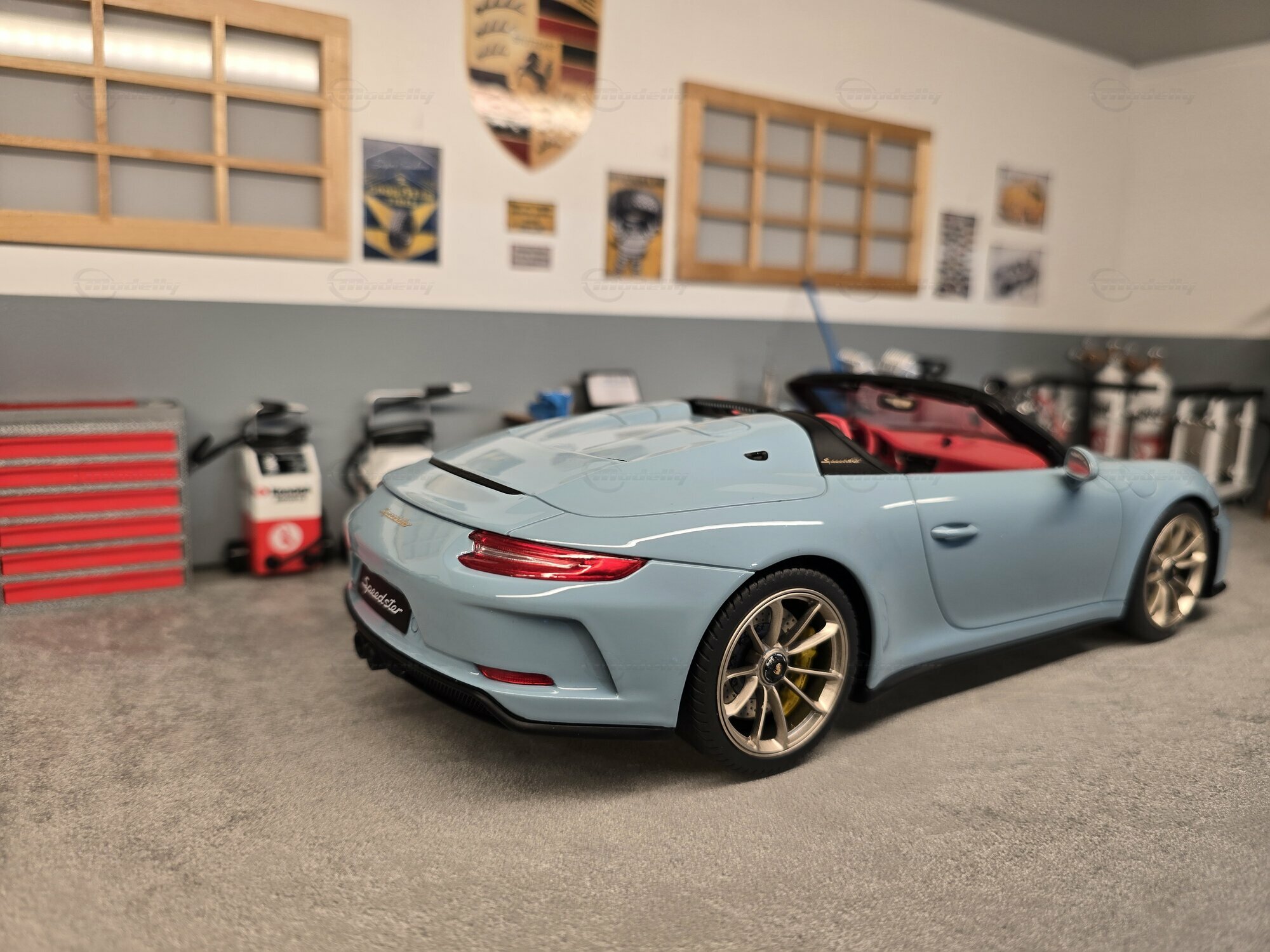 Der Porsche 911 (991.2) Speedster wurde 2018 auf der „70 Jahre Porsche Sportwagen“-Feier als Concept gezeigt und 2019 in Serie gebracht. Das Serienfahrzeug war auf 1948 Exemplare begrenzt – die Zahl verweist auf das Gründungsjahr der Sportwagenmarke. Im Fahrwerk nutzt der Porsche 911 (991.2) Speedster adaptive Dämpfer (PASM), eine Mischbereifung und ein mechanisches Sperrdifferenzial; das 6‑Gang-Getriebe besitzt eine rev-match‑Funktion. Das Leergewicht liegt, je nach Ausstattung, bei rund 1465 kg. Die Abgasanlage ist aus Edelstahl mit partiellem Titananteil, die Heckabdeckung aus kohlefaserverstärktem Kunststoff. Die Karosseriemodifikationen gegenüber dem 911 Cabriolet – gekürzte Frontscheibe und reduzierte Seitenscheiben – verringern die Stirnfläche. Hinter dem Projekt stehen neben Michael Mauer im Design die Ingenieure der Porsche‑GT‑Abteilung unter Leitung von Andreas Preuninger. Für Sammler liefert das hier gezeigte GT Spirit-Modell praktische Vorteile: Durch den Resinaufbau bleibt die Form mit den scharfen Kanten der Heckhutzen stabil, und filigrane Bauteile wie Spiegelfüße oder Lufteinlässe können dünnwandig umgesetzt werden. Die in diesem Beitrag gezeigte Miniatur ist Teil einer auf 1:18 skalierten Sammlung und bildet durch die Limitierung: 1 von 1500 weltweit einen klar definierten Serienplatz. Für Vitrinenfreundinnen und -freunde wirkt das helle Blau neben roten Werkzeugwagen und dem Porsche‑Wappenschild im Diorama ausgewogen; es lässt die Linien des Porsche 911 (991.2) Speedster gut erkennen und macht die Besonderheiten wie die Porsche 20-Zoll Zentralverschluss-Felgen und die Doppelhutze nachvollziehbar. Dieses Modellauto aus Resin von GT Spirit ergänzt die Sammlung von „Play-X“ somit als präzise Miniatur eines späten 991‑Derivats.