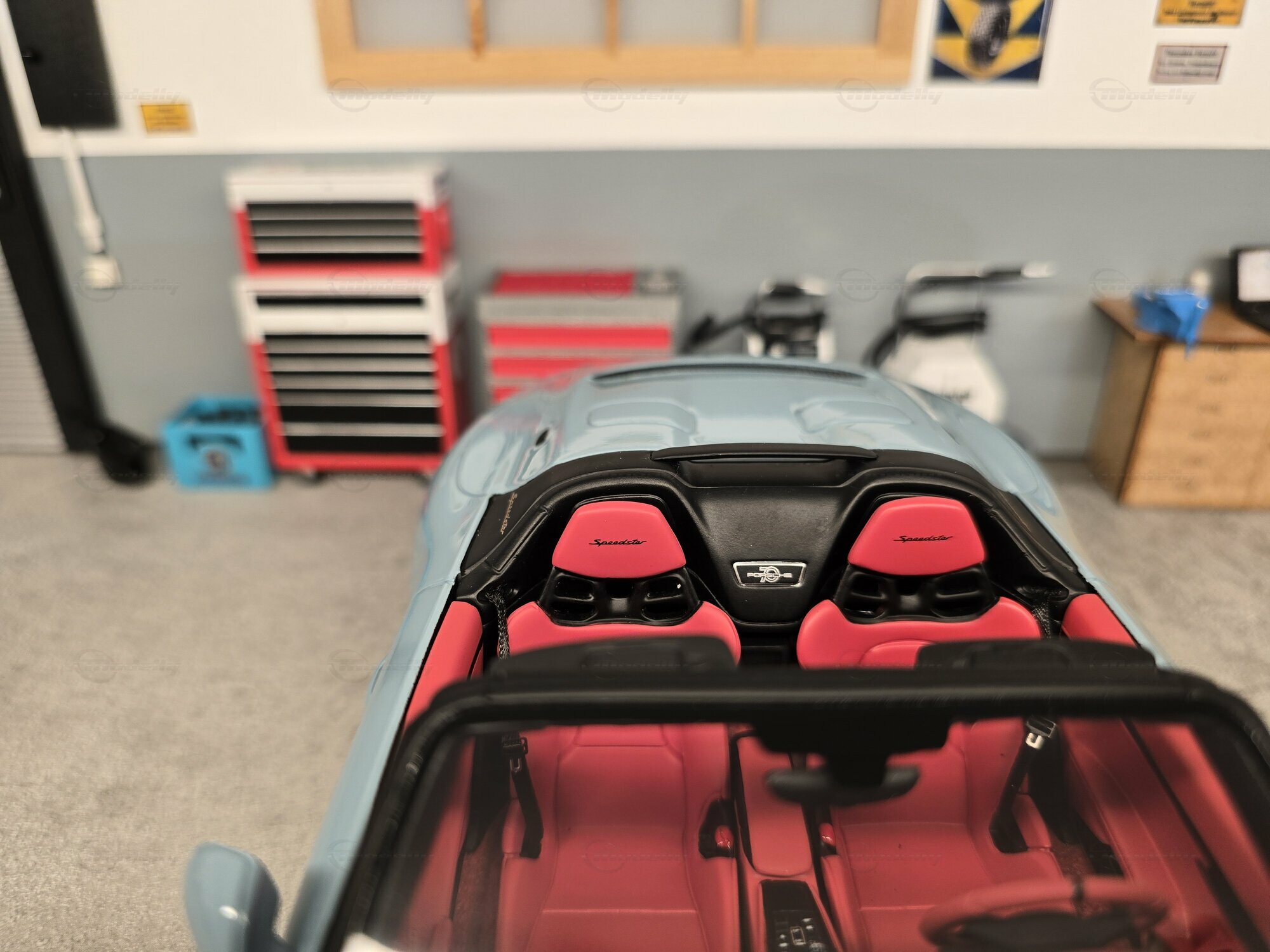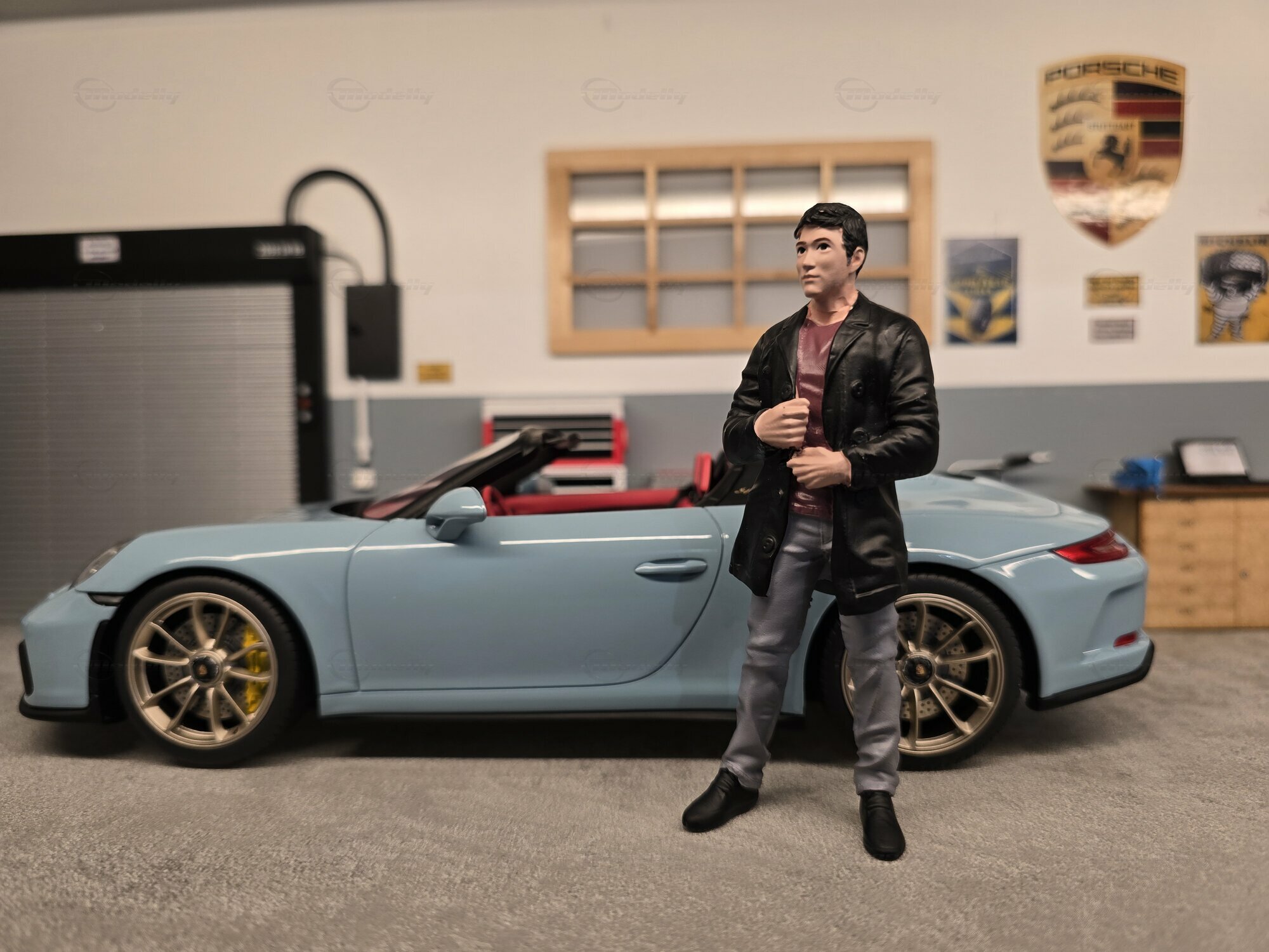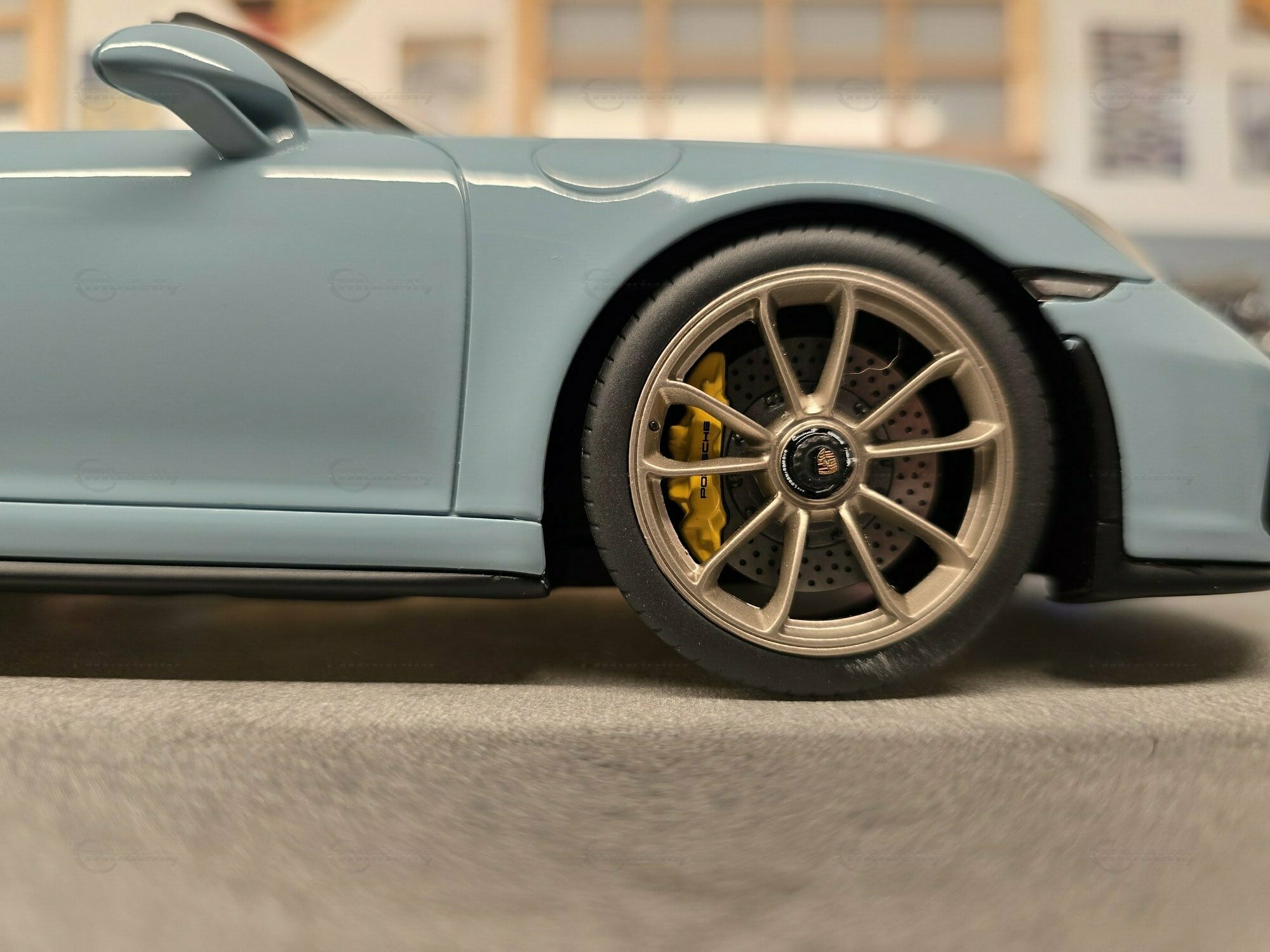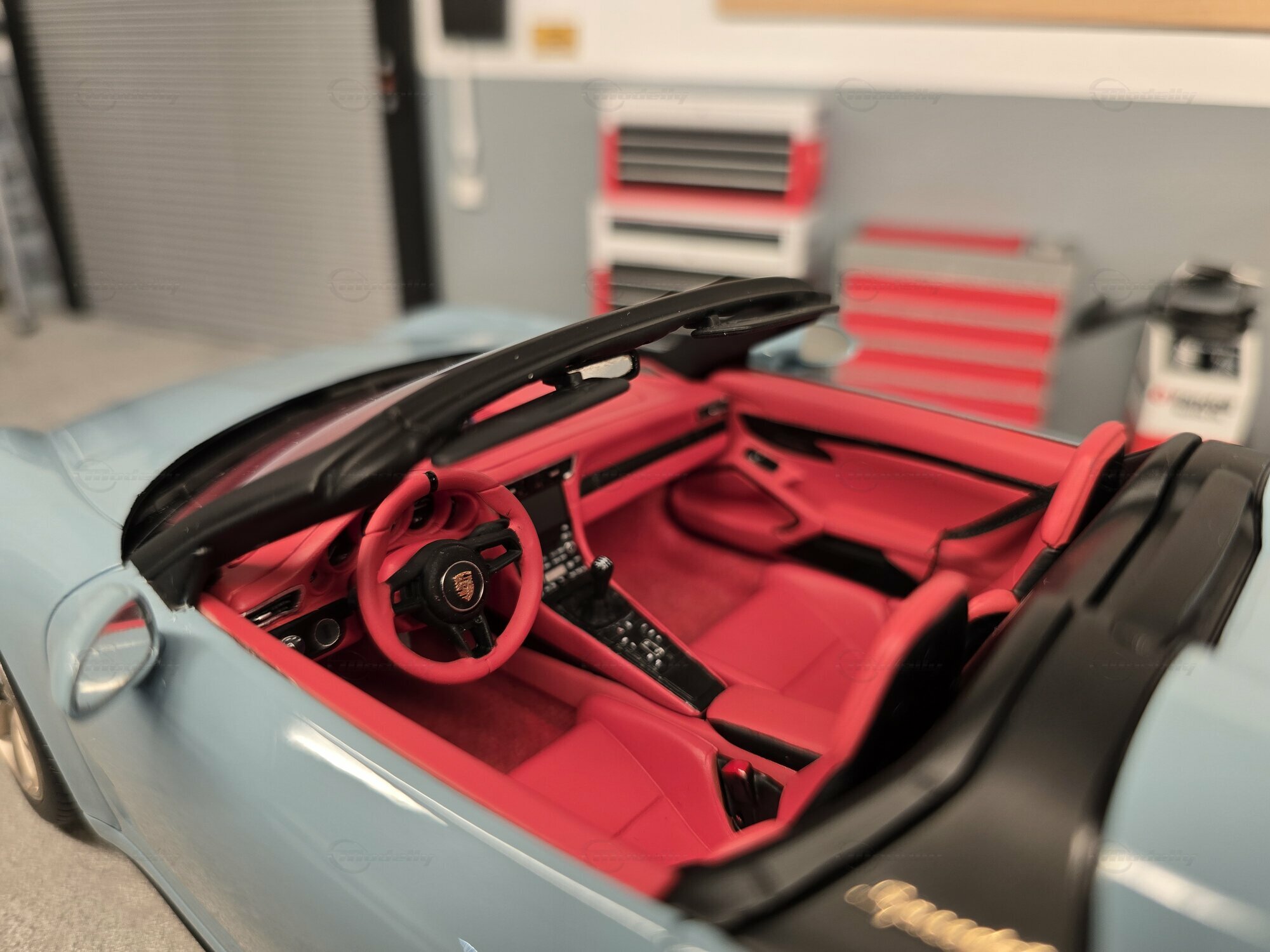 Der Porsche 911 (991.2) Speedster wurde 2018 auf der „70 Jahre Porsche Sportwagen“-Feier als Concept gezeigt und 2019 in Serie gebracht. Das Serienfahrzeug war auf 1948 Exemplare begrenzt – die Zahl verweist auf das Gründungsjahr der Sportwagenmarke. Im Fahrwerk nutzt der Porsche 911 (991.2) Speedster adaptive Dämpfer (PASM), eine Mischbereifung und ein mechanisches Sperrdifferenzial; das 6‑Gang-Getriebe besitzt eine rev-match‑Funktion. Das Leergewicht liegt, je nach Ausstattung, bei rund 1465 kg. Die Abgasanlage ist aus Edelstahl mit partiellem Titananteil, die Heckabdeckung aus kohlefaserverstärktem Kunststoff. Die Karosseriemodifikationen gegenüber dem 911 Cabriolet – gekürzte Frontscheibe und reduzierte Seitenscheiben – verringern die Stirnfläche. Hinter dem Projekt stehen neben Michael Mauer im Design die Ingenieure der Porsche‑GT‑Abteilung unter Leitung von Andreas Preuninger. Für Sammler liefert das hier gezeigte GT Spirit-Modell praktische Vorteile: Durch den Resinaufbau bleibt die Form mit den scharfen Kanten der Heckhutzen stabil, und filigrane Bauteile wie Spiegelfüße oder Lufteinlässe können dünnwandig umgesetzt werden. Die in diesem Beitrag gezeigte Miniatur ist Teil einer auf 1:18 skalierten Sammlung und bildet durch die Limitierung: 1 von 1500 weltweit einen klar definierten Serienplatz. Für Vitrinenfreundinnen und -freunde wirkt das helle Blau neben roten Werkzeugwagen und dem Porsche‑Wappenschild im Diorama ausgewogen; es lässt die Linien des Porsche 911 (991.2) Speedster gut erkennen und macht die Besonderheiten wie die Porsche 20-Zoll Zentralverschluss-Felgen und die Doppelhutze nachvollziehbar. Dieses Modellauto aus Resin von GT Spirit ergänzt die Sammlung von „Play-X“ somit als präzise Miniatur eines späten 991‑Derivats.
