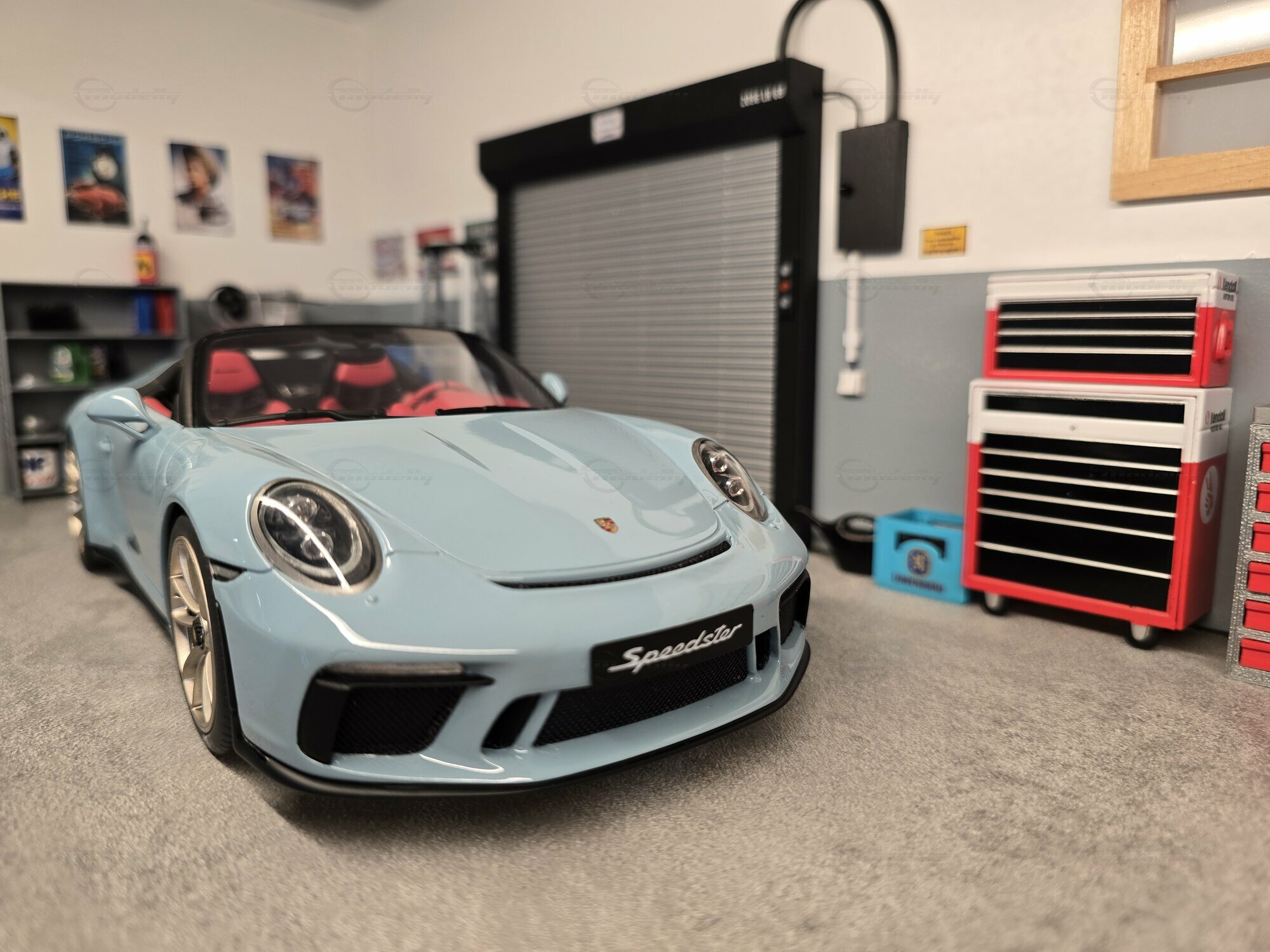 Das hier gezeigte Modellauto gehört zur Sammlung von Modelly‑Mitglied „Play-X“ und stellt den Porsche 911 (991.2) Speedster im Maßstab 1:18 dar. Gefertigt wurde es von GT Spirit, einem Hersteller, der seine Großmodelle überwiegend als geschlossene Modelle aus Resin realisiert. Auch dieses Exemplar besteht aus dem Werkstoff Resin; bewegliche Türen oder Hauben sind zugunsten sauberer Spaltmaße und fein detaillierter Oberflächen nicht vorhanden. Es handelt sich um eine limitierte Edition: Limitierung: 1 von 1500 weltweit. Damit ist das Modell für Sammler klar abgegrenzt und nachvollziehbar. Auf den Fotos steht das Fahrzeug in einem Garagen‑Diorama mit Werkzeugwagen, Porsche‑Wandemblem und Regalen – eine sachliche Umgebung, die den Charakter des Porsche 911 (991.2) Speedster als fahrorientierten Roadster betont. Die zweite explizite Nennung: Es handelt sich um ein Modellauto im Maßstab 1:18 des Herstellers GT Spirit.