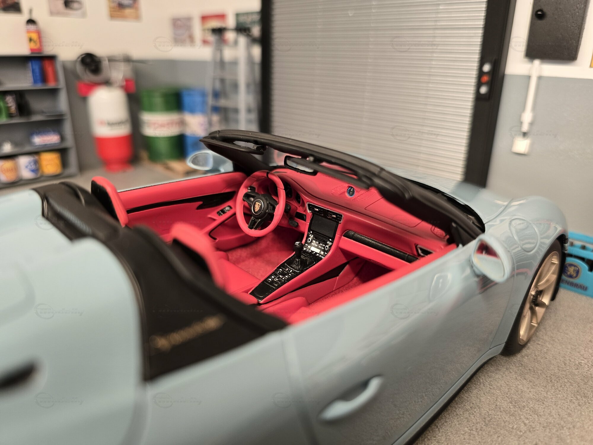 Das Miniaturfahrzeug übernimmt die prägenden Formelemente des Porsche 911 (991.2) Speedster: die flache Frontscheibe, die markante „Double‑Bubble“-Heckabdeckung und die eigenständige Frontschürze. Die Lackierung zeigt ein helles Blau, das an historische Porsche‑Farbgebungen erinnert; in Kombination mit der roten Innenausstattung entsteht der für den Speedster typische Kontrast. Vorn sind die ovalen LED-Hauptscheinwerfer mit umlaufender Tagfahrlicht-Grafik nachgebildet, am Bugspoiler ist der „Speedster“-Schriftzug zu erkennen. Am Heck trägt das Modell die schmalen, quer liegenden Rückleuchten der 991‑Generation sowie den mittigen „Speedster“-Schriftzug auf dem Deckel. Die Sitze entsprechen leichten Schalensitzen; im Modell sind sie in Rot mit schwarzen Einsätzen umgesetzt. Die Felgen sind als Porsche 20-Zoll Zentralverschluss-Felgen dargestellt, passend zum Vorbild, mit goldfarbenen Speichen und sichtbaren Zentralmuttern. Dahinter sitzen gelb gefärbte Bremssättel, die auf die PCCB‑Keramikbremsen verweisen. Die Spaltverläufe sind im Resin präzise graviert, Lüftungsöffnungen und Gitter sind plastisch nachgebildet. In der Draufsicht fällt die flache Silhouette auf; seitlich ist die gedrungene Türlinie sichtbar, die beim Original aus Aerodynamikgründen leicht ansteigt. Das Modell zeigt insgesamt eine ruhige, saubere Oberfläche ohne sichtbare Anbauteile, wodurch die Form des Porsche 911 (991.2) Speedster klar erkennbar bleibt.