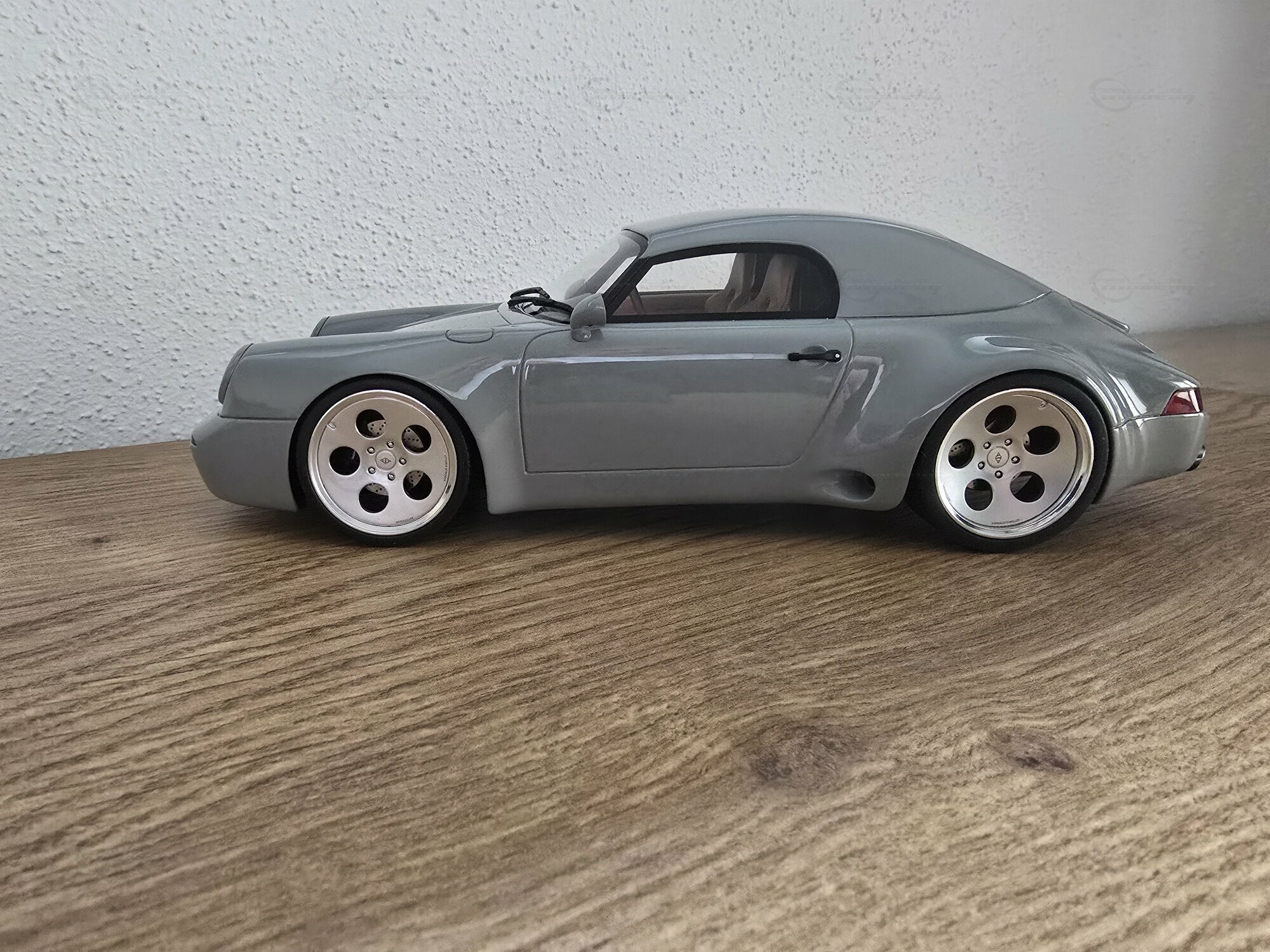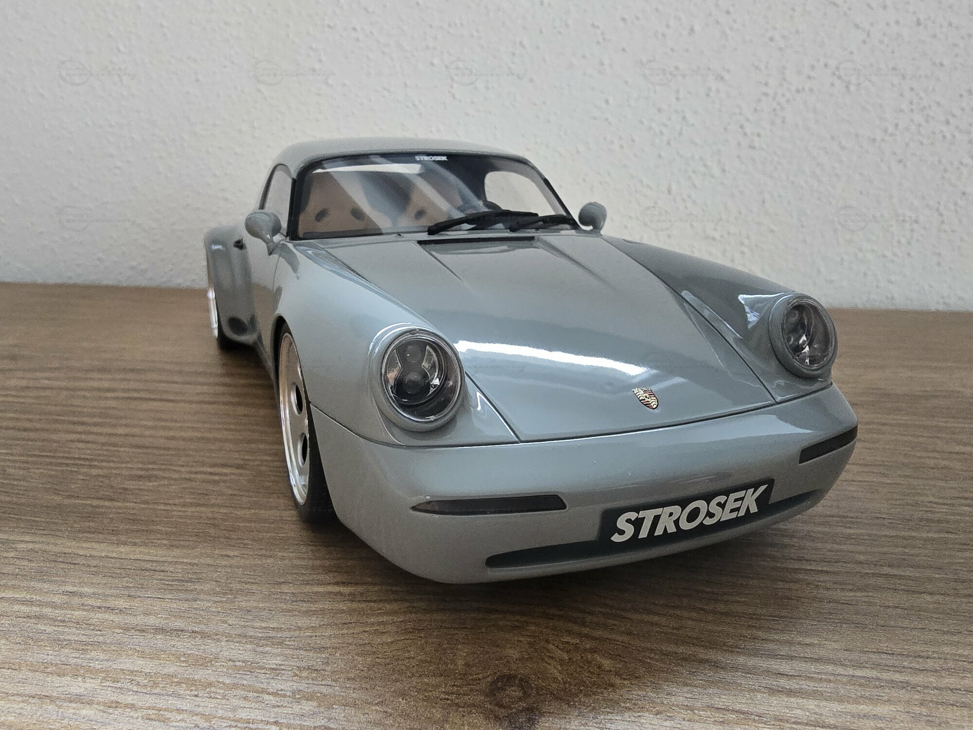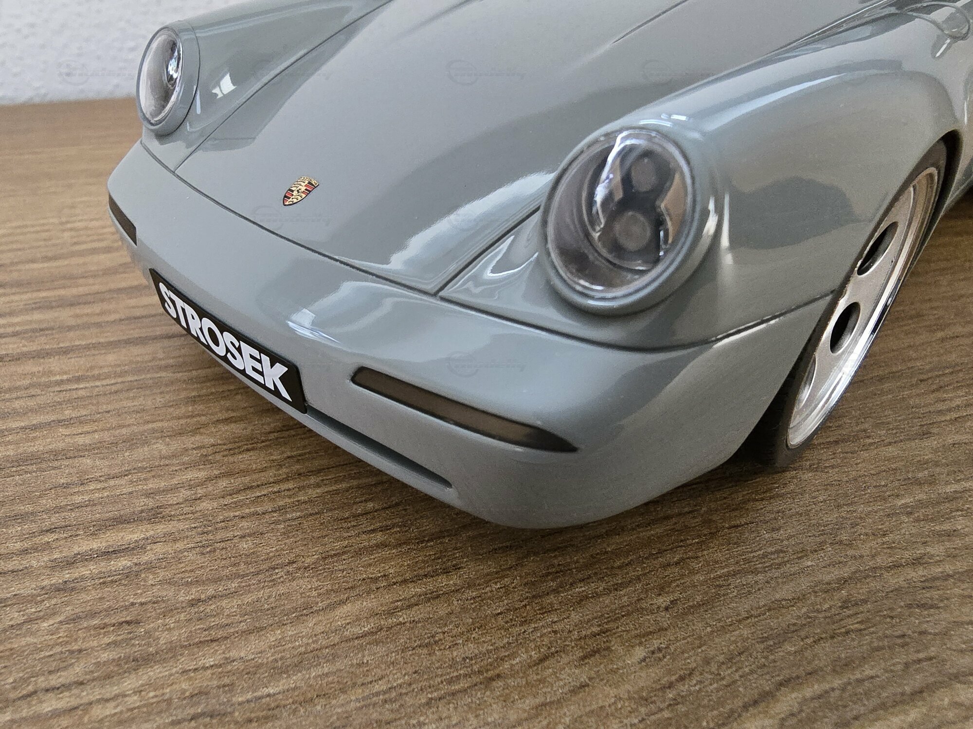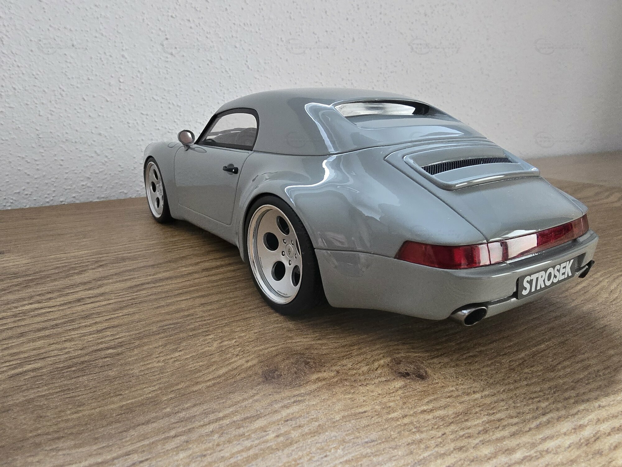 Das hier zu sehende Modellauto im Maßstab 1:18 stammt von GT Spirit und befindet sich in der Sammlung des Modelly-Mitglieds „Play-X“. Es handelt sich um ein geschlossenes Resin-Modell; die Karosserie besteht aus Kunstharz (Resin) und besitzt keine zu öffnenden Teile, was eine saubere Wiedergabe der glatten Flächen des Vorbilds ermöglicht. Front und Heck zeigen die für Strosek typischen, flächenbündigen Stoßfänger sowie die schmale Lufteinlass-Öffnung vorn. Die Fotos dokumentieren die dezent gehaltene graue Lackierung ohne Metallic-Effekt, schwarze Dichtungen an Scheiben und Leuchten sowie einen goldfarbenen Porsche-Wappensticker auf der Fronthaube. Auffällig sind die weit ausgestellten hinteren Radhäuser, die seitlichen Einlässe und die tiefe Fahrzeuglage. Die durchgehende Heckleuchte, das schnörkellose Deckelgitter über dem Motor und die beidseitigen Endrohre sind korrekt nachgebildet. Die Fünfloch-Felgen mit poliertem Außenbett passen zum Erscheinungsbild der Umbauten der frühen 1990er-Jahre; eine konkrete Felgenmarke lässt sich aus den Bildern nicht zweifelsfrei ableiten. Im Innenraum – durch die Seitenfenster erkennbar – finden sich dunkel gehaltene Sitze, ein klassisches 911‑Armaturenbrett und ein Dreispeichenlenkrad. Das Kennzeichen mit „STROSEK“-Schriftzug und die schlicht ausgeführten Türgriffe greifen markante Details des Vorbildes auf. Dieses Modellauto im Maßstab 1:18 von GT Spirit ist damit eine sachliche Ergänzung für Sammler, die Umbauten der 964‑Ära dokumentieren möchten.