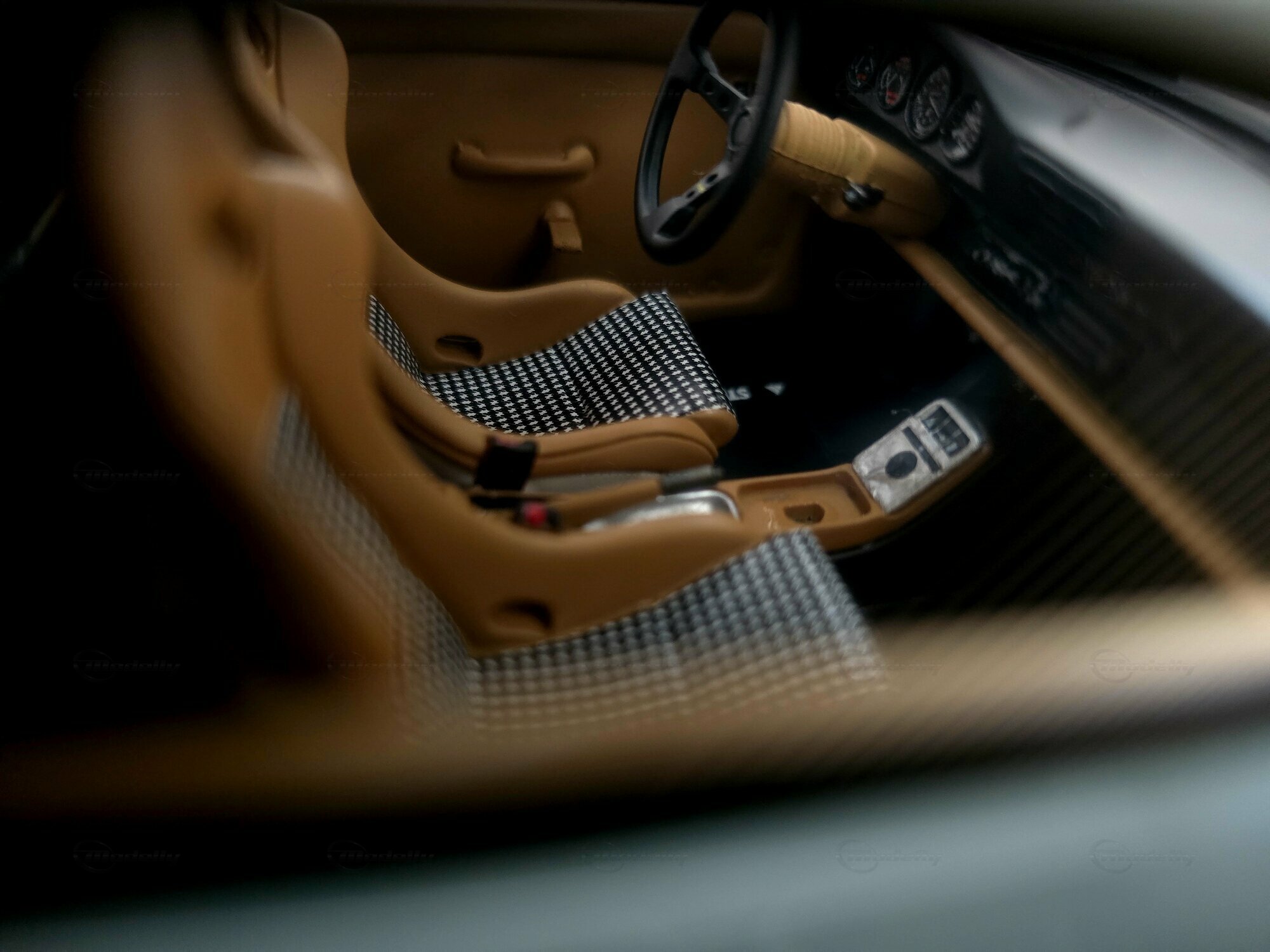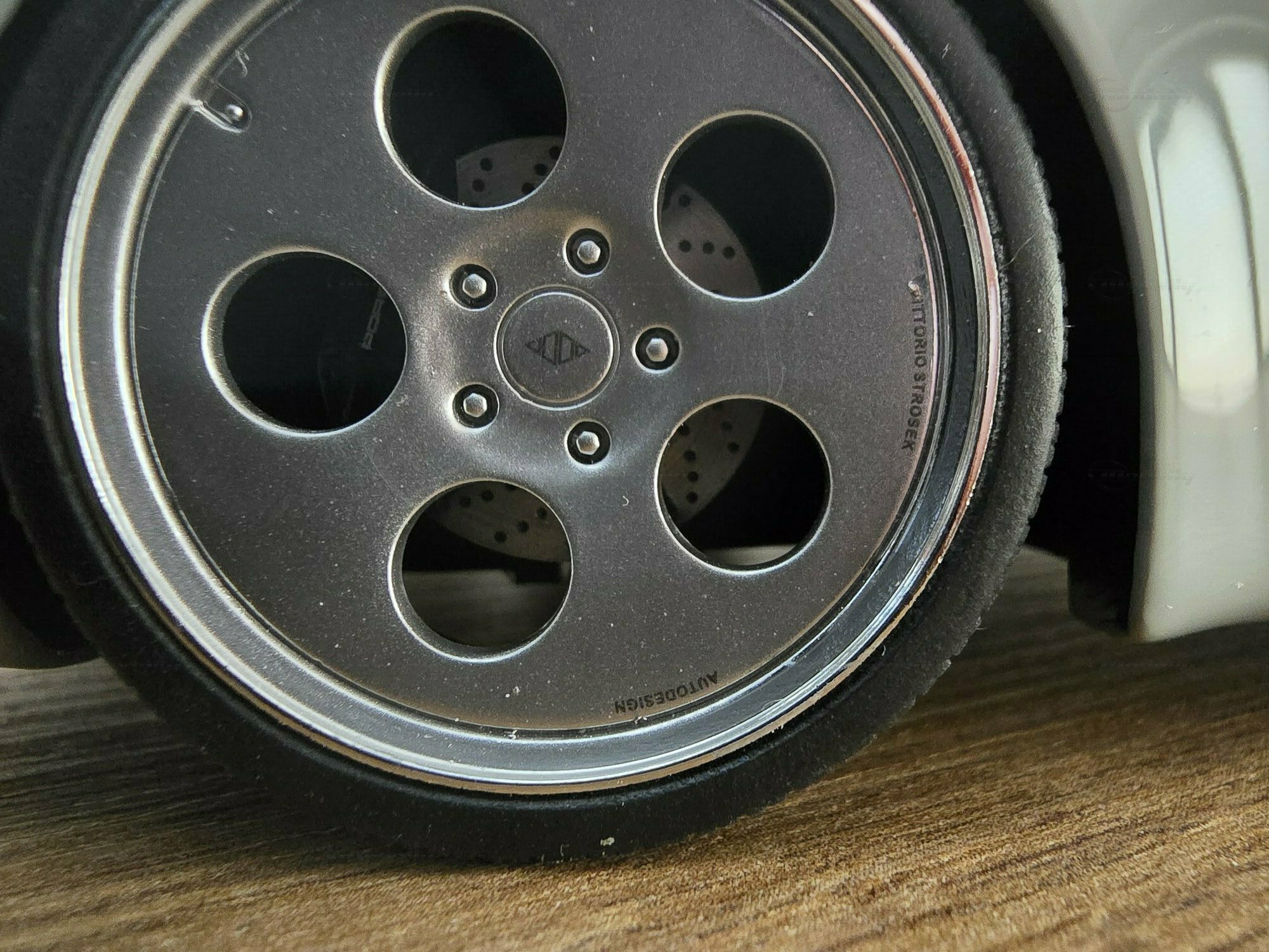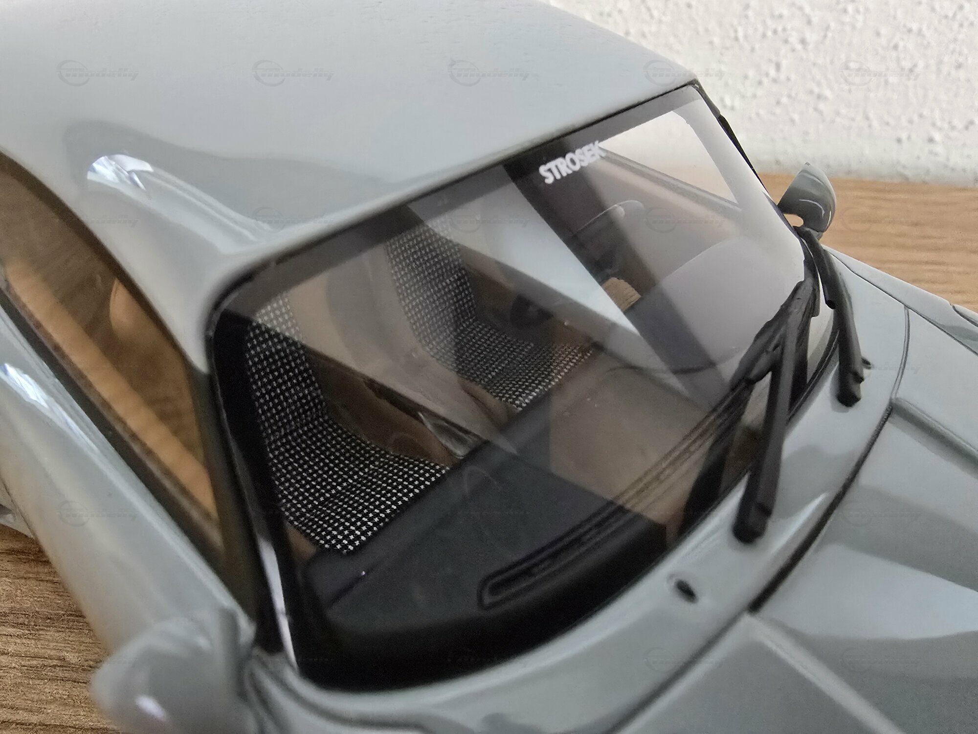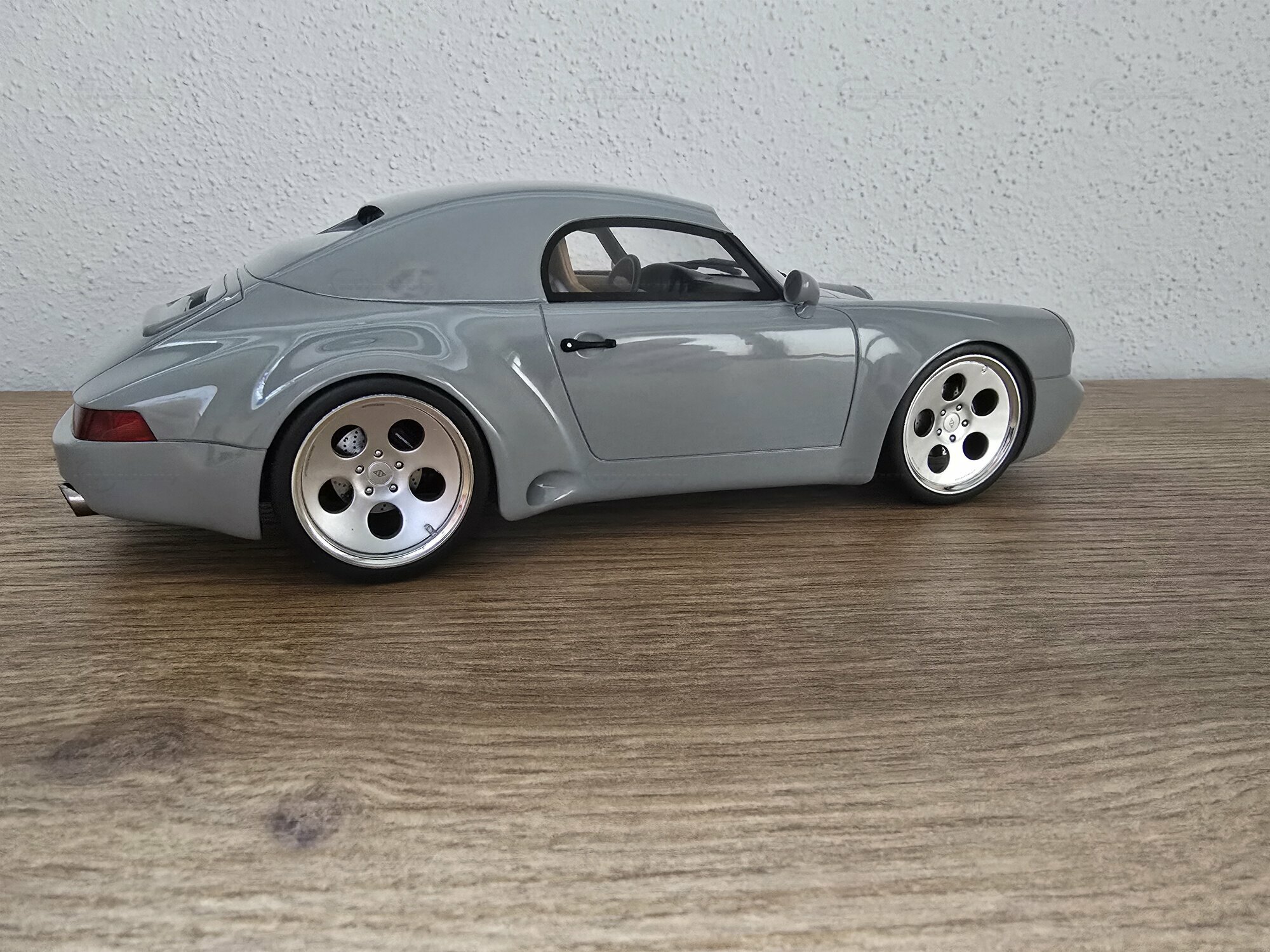 Das hier zu sehende Modellauto im Maßstab 1:18 stammt von GT Spirit und befindet sich in der Sammlung des Modelly-Mitglieds „Play-X“. Es handelt sich um ein geschlossenes Resin-Modell; die Karosserie besteht aus Kunstharz (Resin) und besitzt keine zu öffnenden Teile, was eine saubere Wiedergabe der glatten Flächen des Vorbilds ermöglicht. Front und Heck zeigen die für Strosek typischen, flächenbündigen Stoßfänger sowie die schmale Lufteinlass-Öffnung vorn. Die Fotos dokumentieren die dezent gehaltene graue Lackierung ohne Metallic-Effekt, schwarze Dichtungen an Scheiben und Leuchten sowie einen goldfarbenen Porsche-Wappensticker auf der Fronthaube. Auffällig sind die weit ausgestellten hinteren Radhäuser, die seitlichen Einlässe und die tiefe Fahrzeuglage. Die durchgehende Heckleuchte, das schnörkellose Deckelgitter über dem Motor und die beidseitigen Endrohre sind korrekt nachgebildet. Die Fünfloch-Felgen mit poliertem Außenbett passen zum Erscheinungsbild der Umbauten der frühen 1990er-Jahre; eine konkrete Felgenmarke lässt sich aus den Bildern nicht zweifelsfrei ableiten. Im Innenraum – durch die Seitenfenster erkennbar – finden sich dunkel gehaltene Sitze, ein klassisches 911‑Armaturenbrett und ein Dreispeichenlenkrad. Das Kennzeichen mit „STROSEK“-Schriftzug und die schlicht ausgeführten Türgriffe greifen markante Details des Vorbildes auf. Dieses Modellauto im Maßstab 1:18 von GT Spirit ist damit eine sachliche Ergänzung für Sammler, die Umbauten der 964‑Ära dokumentieren möchten.