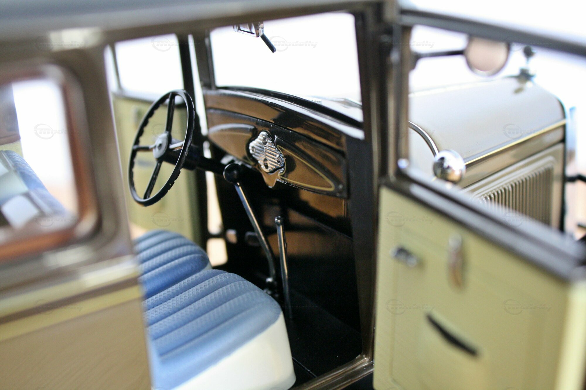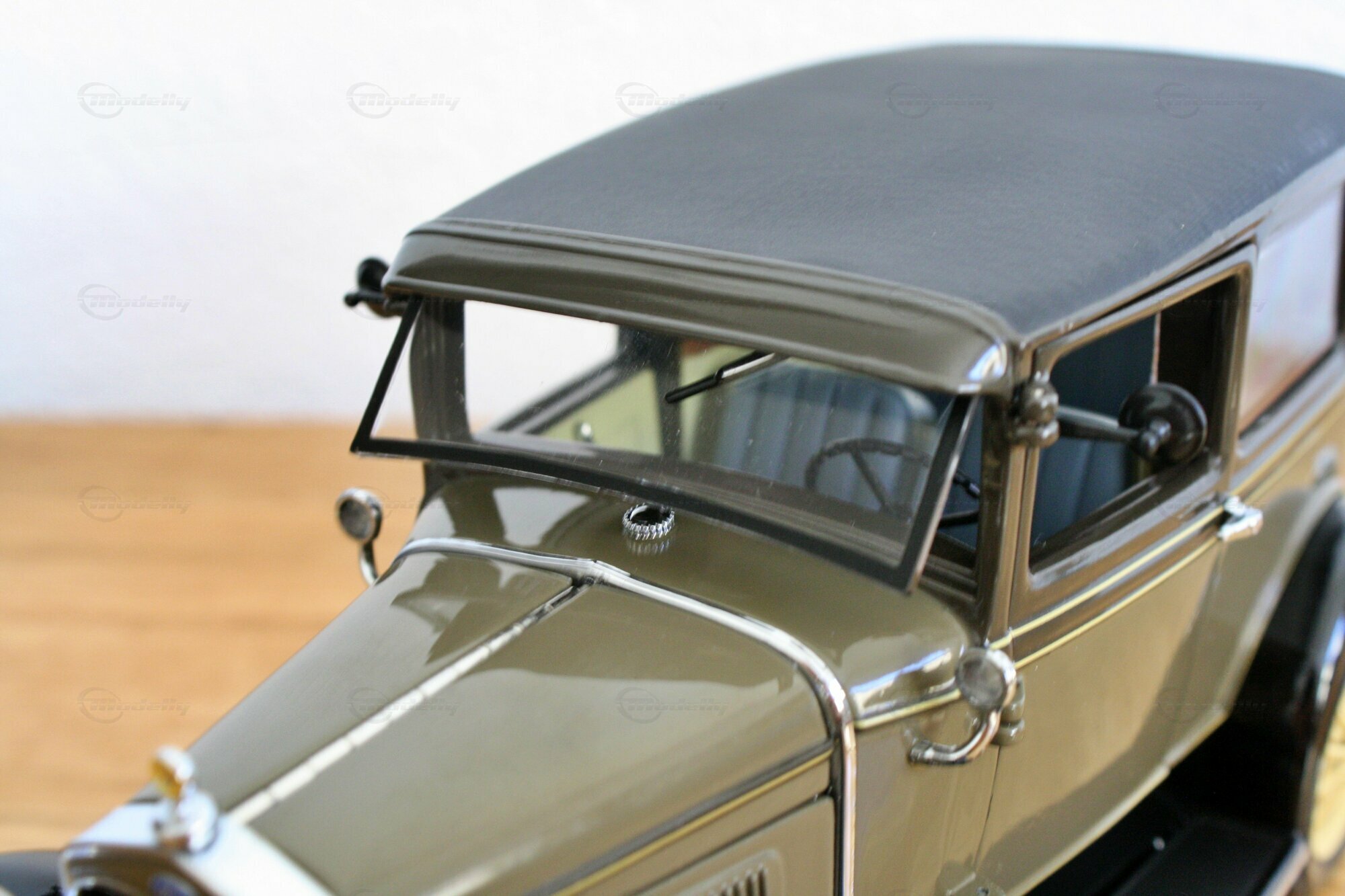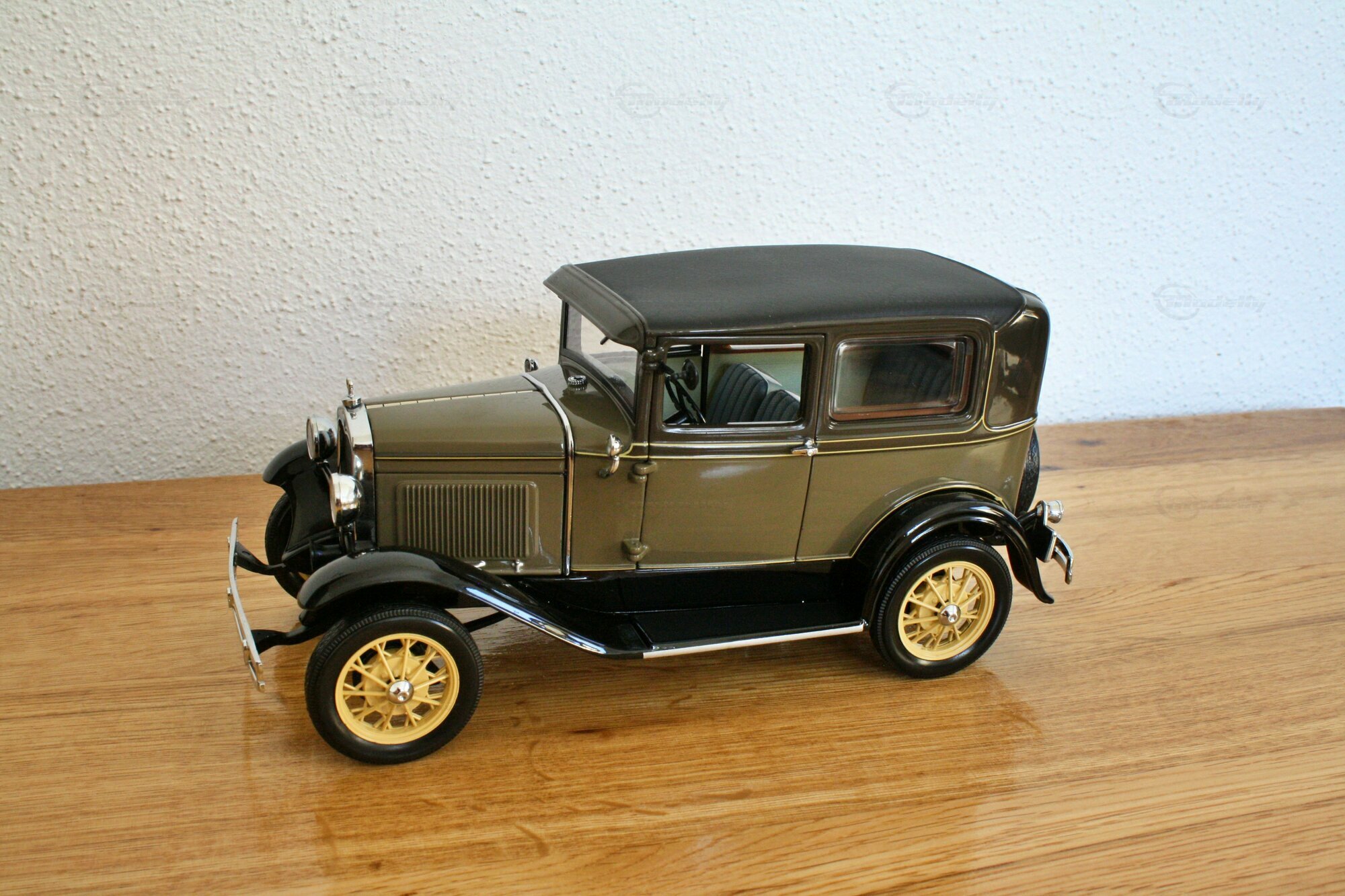 Sammler von Automodellen weltweit schätzen die detaillierten Nachbildungen historischer Fahrzeuge. Dieses 1:18 Modell des Ford Model A Tudor stammt von Motor City Classics und wurde aus hochwertigem Diecast-Material gefertigt. Das Modell, das sich in der Sammlung von Modelly-Mitglied "Play-X" befindet, besticht durch seine exakte Darstellung und Detaillierung. Die Lackierung spiegelt den klassischen Stil der Ära wider: ein elegantes dunkelgrünes Gehäuse kombiniert mit schwarzen Kotflügeln und einem lebensechten Innenraum. Die goldfarbenen Felgen, die detailtreu an den originalen Drahtspeichenrädern orientiert sind, runden das Gesamtbild ab.