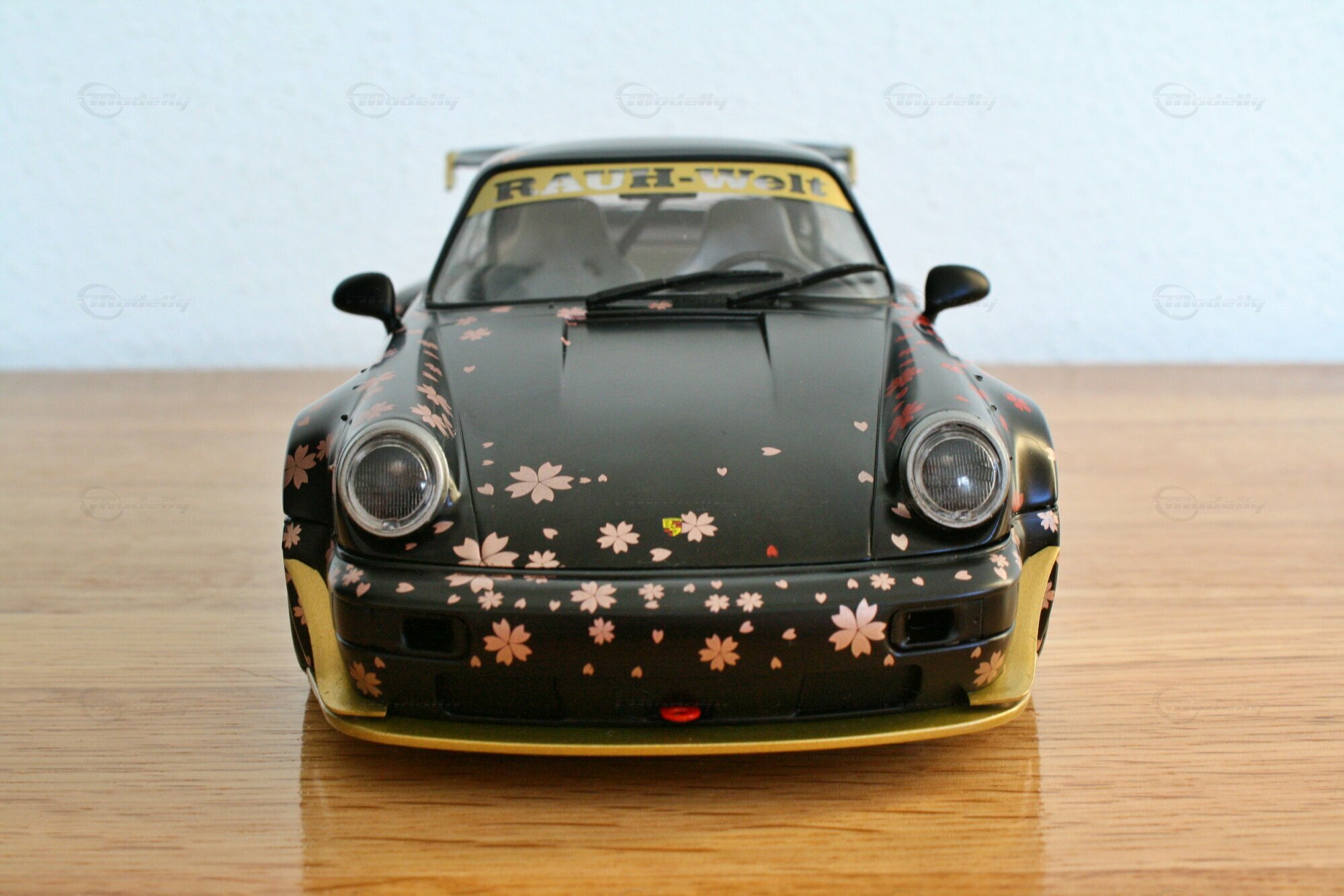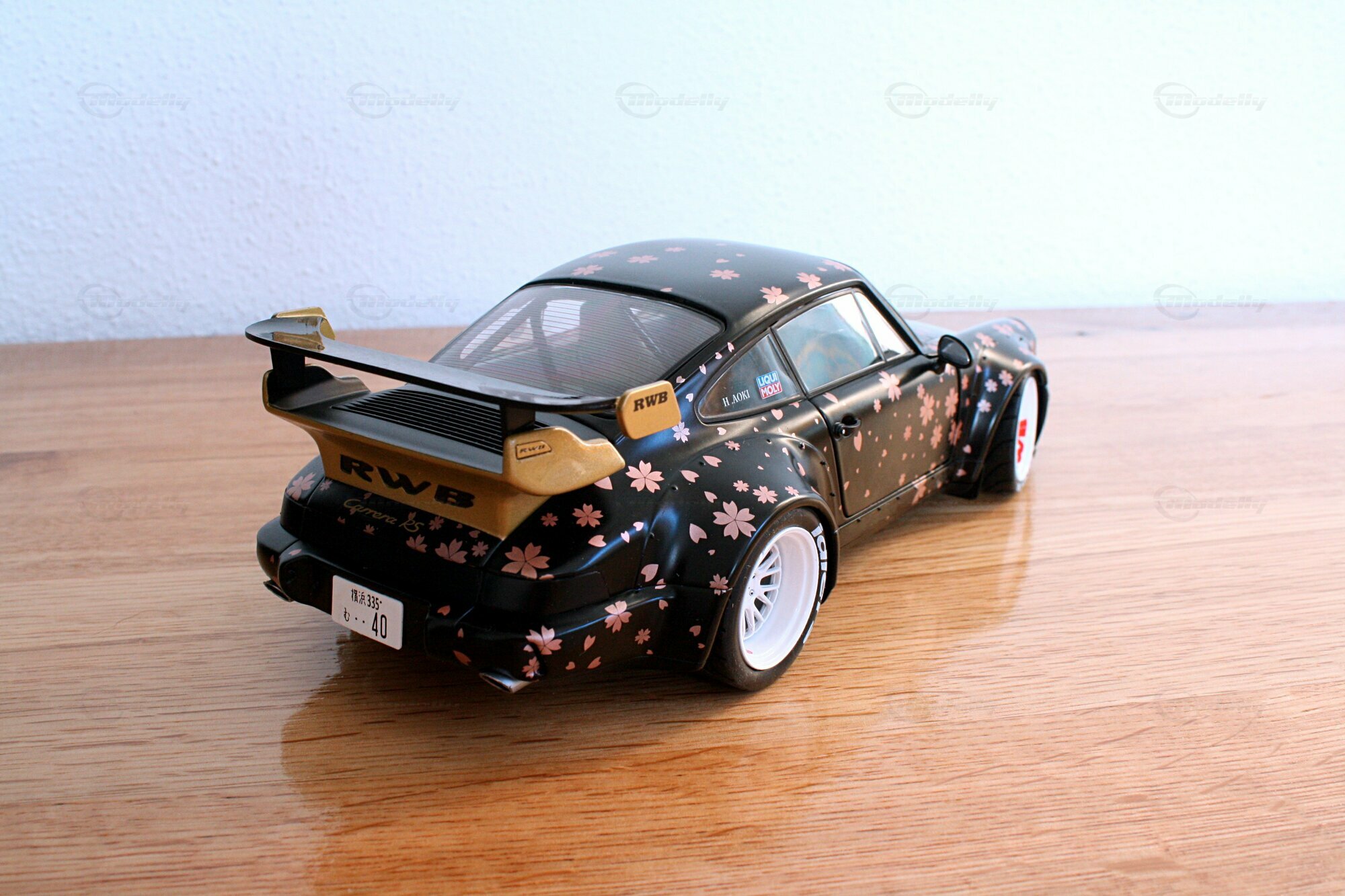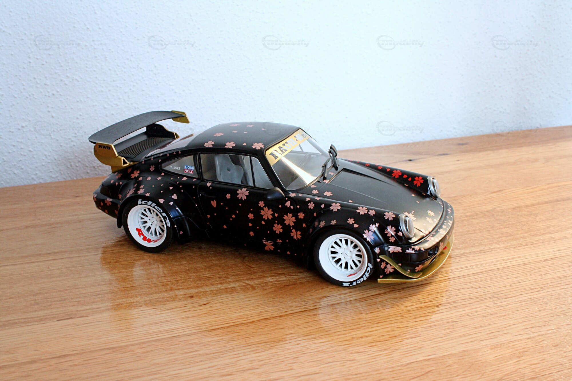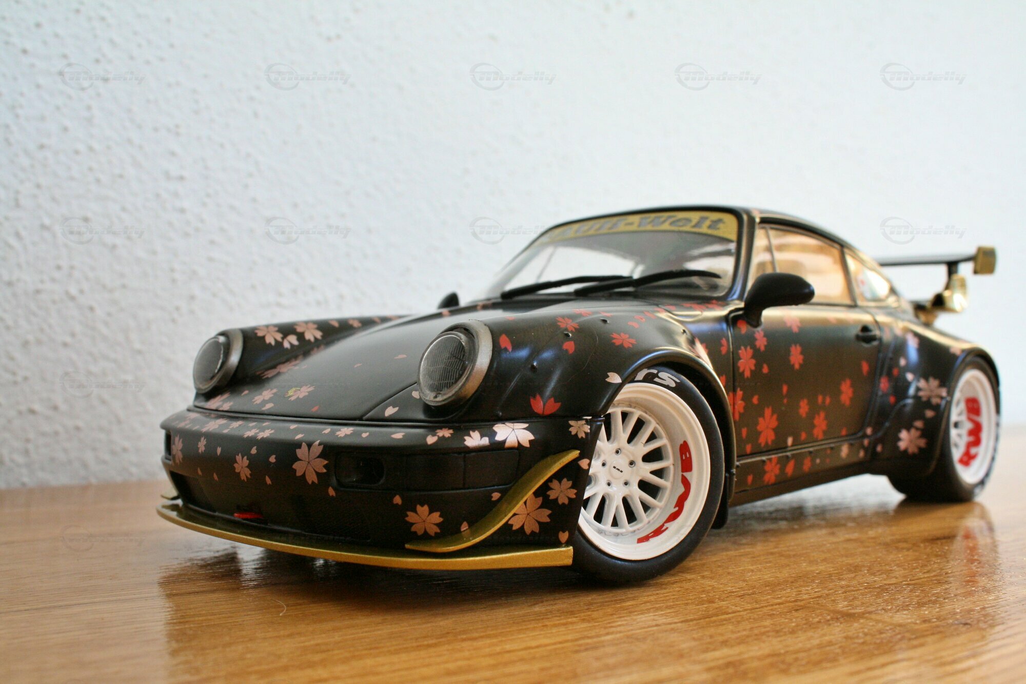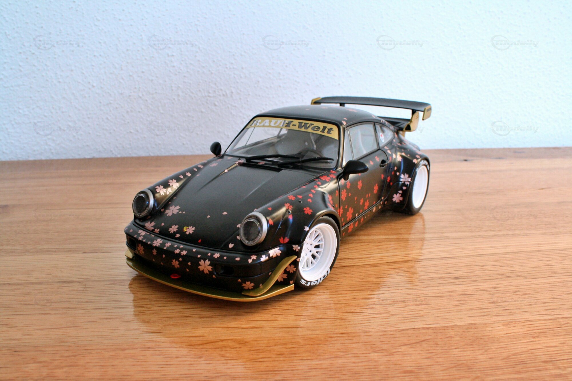 Dieses Modell im Maßstab 1:18 zeichnet sich durch seine spezielle Lackierung aus, die mit Kirschblüten-Motiven versehen ist. Die schwarzen und goldenen Farbtöne kombiniert mit den detaillierten Kirschblüten verleihen dem Modell eine einzigartige Ästhetik. Auffällig sind auch die weißen Felgen, die typischerweise von Work Wheels stammen und in diesem Fall eine perfekte Ergänzung zu den ungewöhnlichen Farbschemas darstellen. Auf der Windschutzscheibe prangt ein großes „Rauh-Welt Begriff“-Banner, ein weiteres charakteristisches Detail, das diesem Modell zu seiner Authentizität verhilft. Modellauto-Sammler, wie der Modelly-Mitglied „Play-X“, werden sicherlich die präzise Verarbeitung der Details, wie den goldenen Schriftzug und den maßgeschneiderten Heckflügel, zu schätzen wissen.