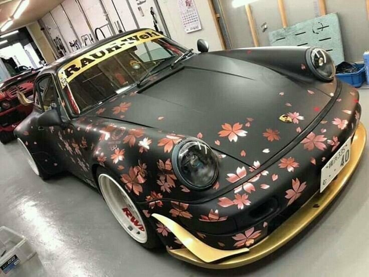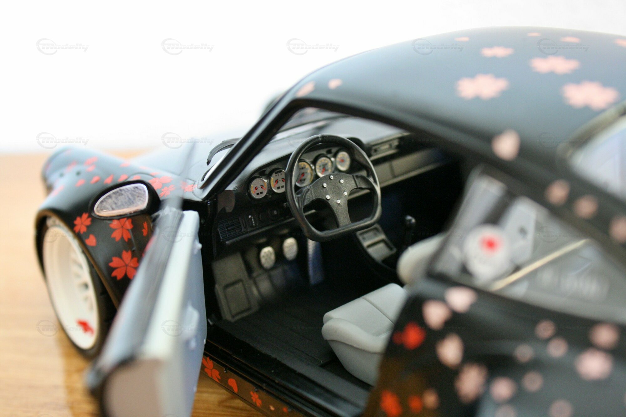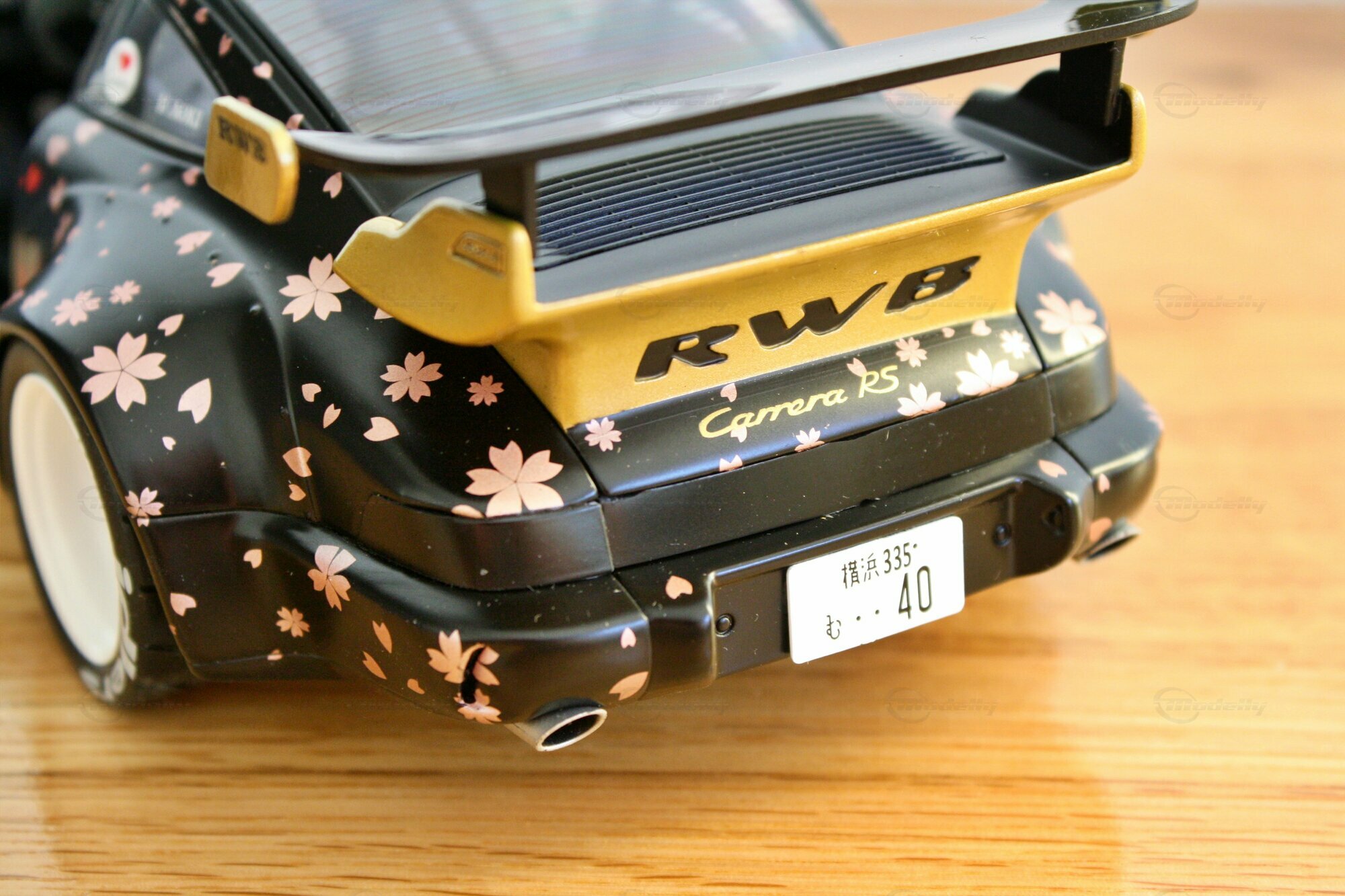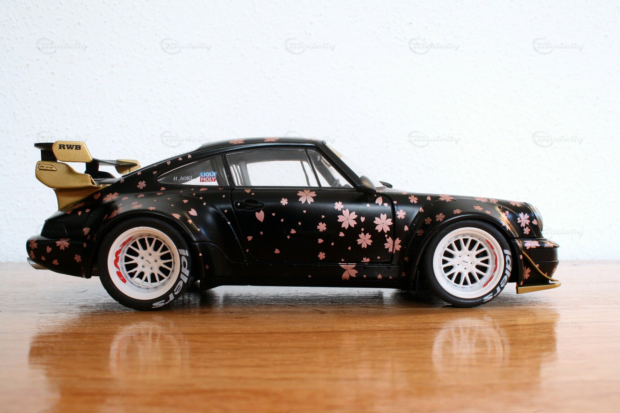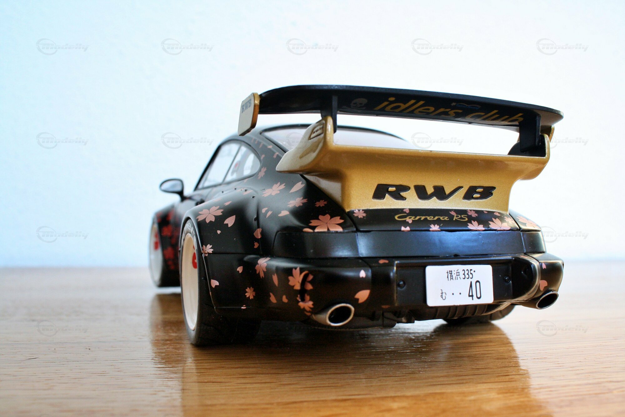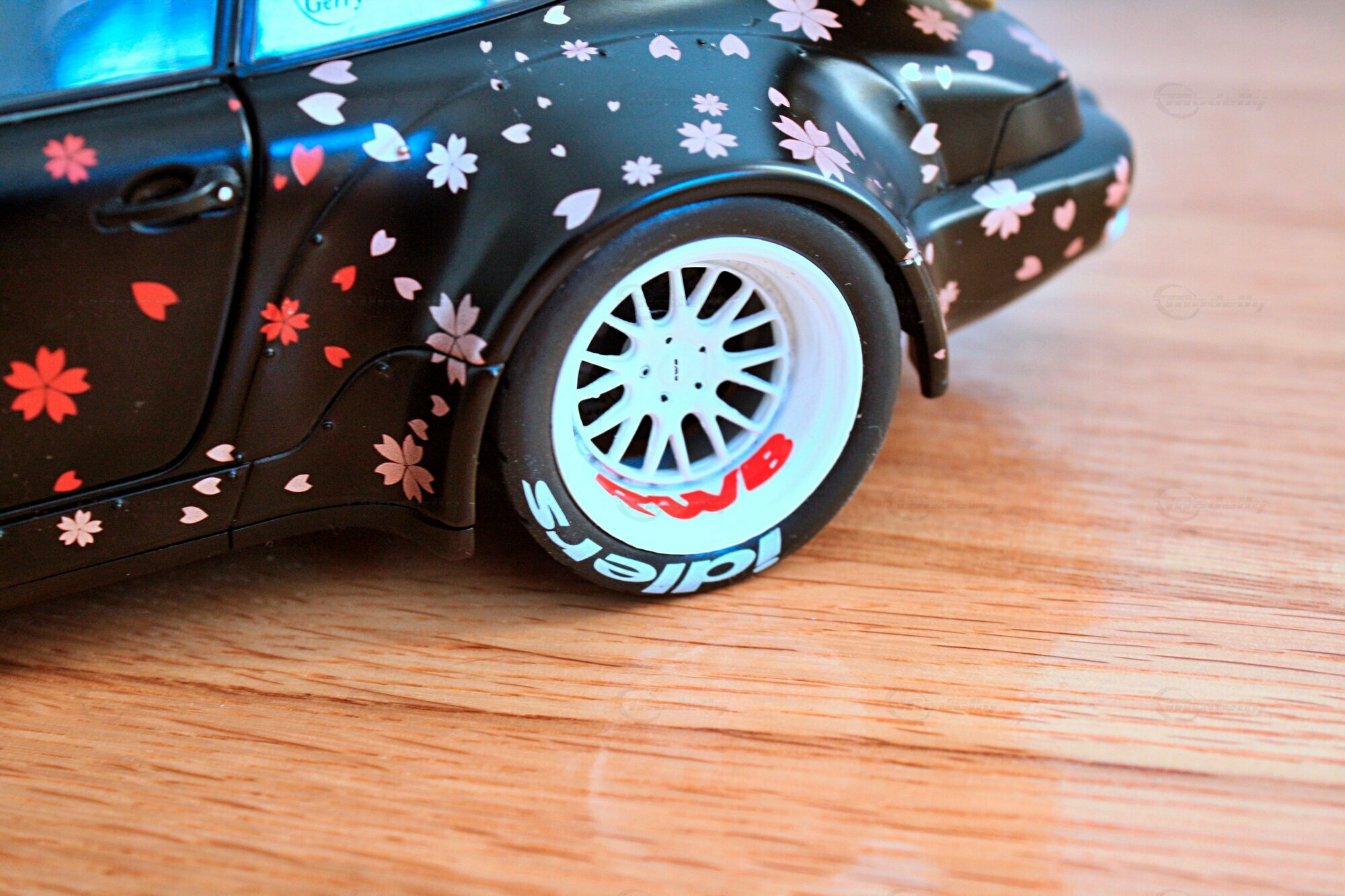 Dieses Modell im Maßstab 1:18 zeichnet sich durch seine spezielle Lackierung aus, die mit Kirschblüten-Motiven versehen ist. Die schwarzen und goldenen Farbtöne kombiniert mit den detaillierten Kirschblüten verleihen dem Modell eine einzigartige Ästhetik. Auffällig sind auch die weißen Felgen, die typischerweise von Work Wheels stammen und in diesem Fall eine perfekte Ergänzung zu den ungewöhnlichen Farbschemas darstellen. Auf der Windschutzscheibe prangt ein großes „Rauh-Welt Begriff“-Banner, ein weiteres charakteristisches Detail, das diesem Modell zu seiner Authentizität verhilft. Modellauto-Sammler, wie der Modelly-Mitglied „Play-X“, werden sicherlich die präzise Verarbeitung der Details, wie den goldenen Schriftzug und den maßgeschneiderten Heckflügel, zu schätzen wissen.