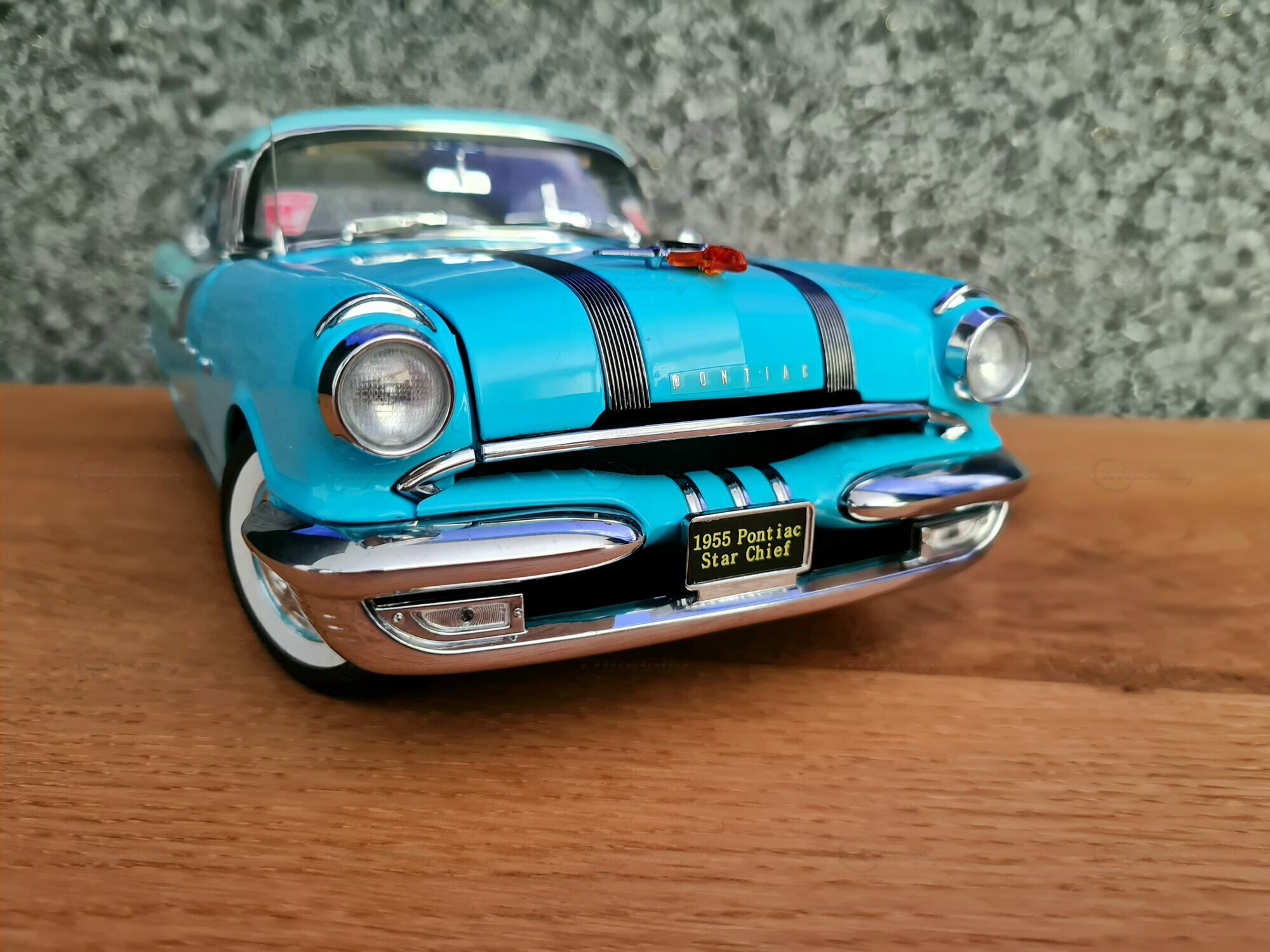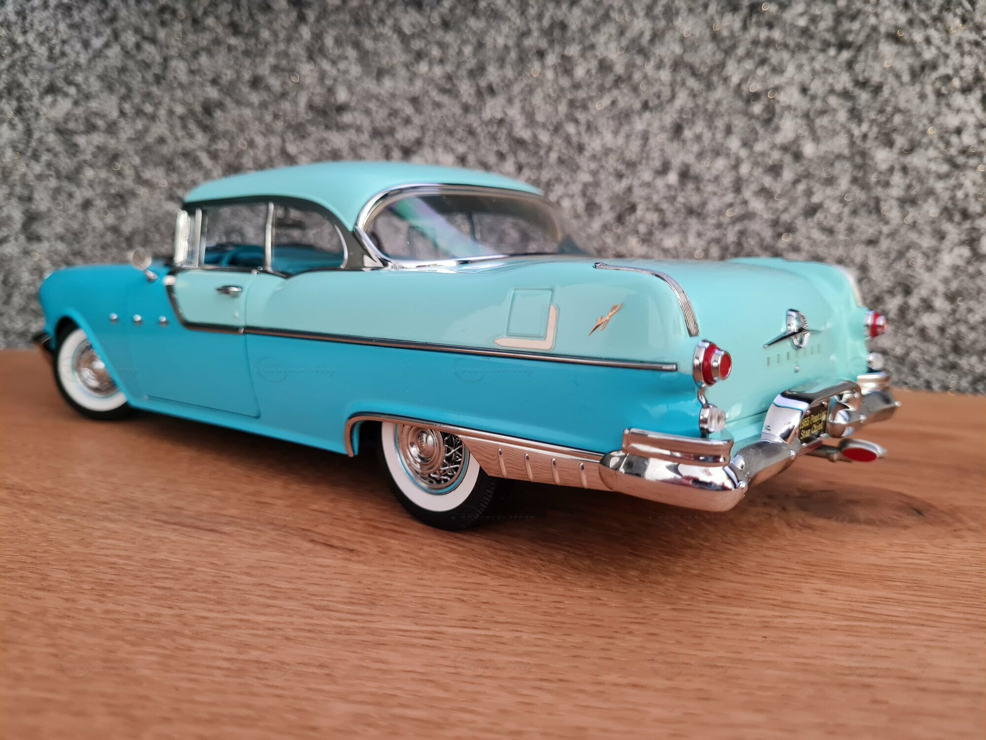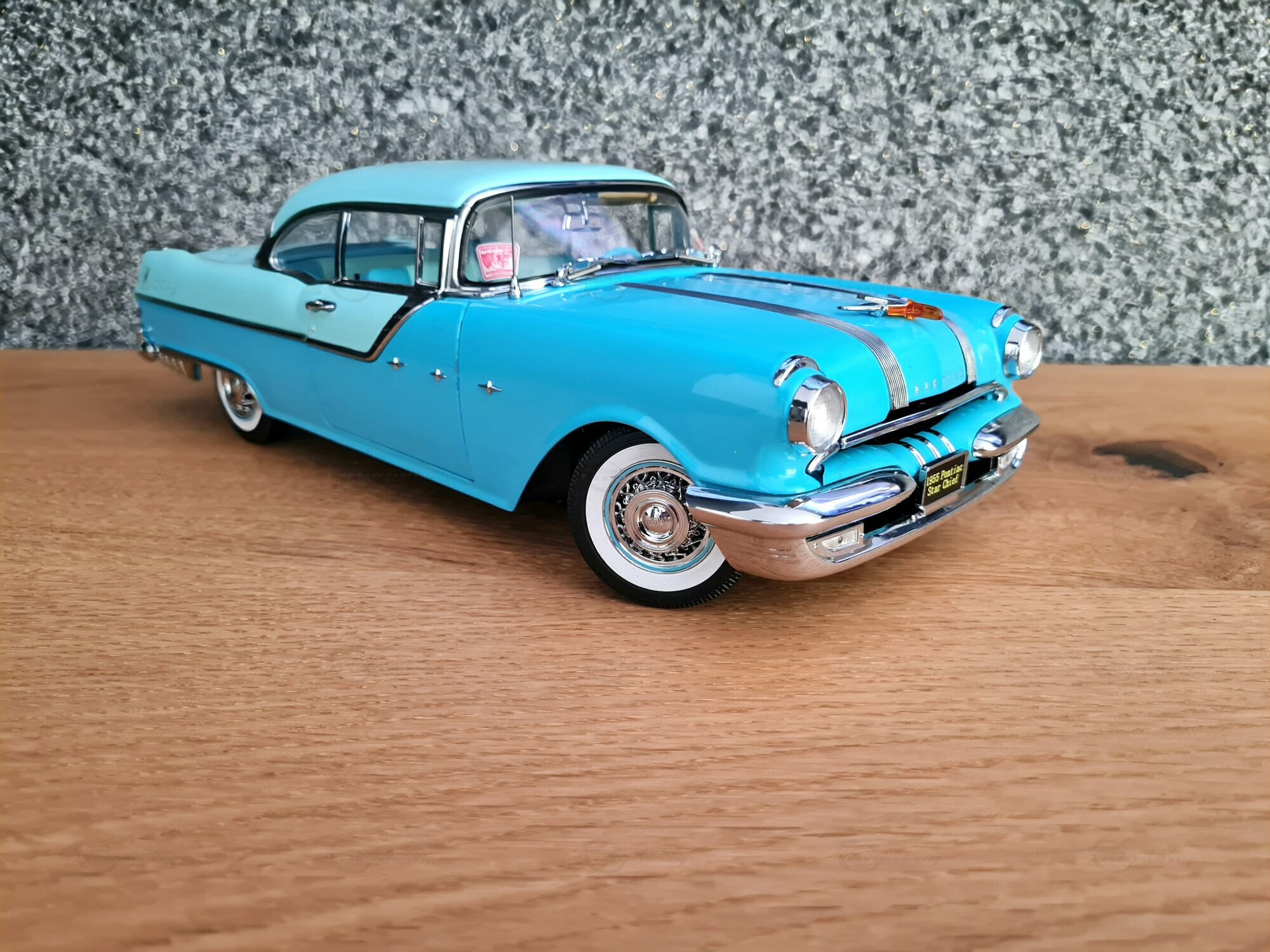 Der Pontiac Star Chief ist ein klassisches amerikanisches Automobil, das in den 1950er Jahren produziert wurde. Genauer gesagt, die gezeigte Miniatur basiert auf dem Modell aus dem Jahr 1955, das zur zweiten Generation des Pontiac Star Chief gehört, die von 1955 bis 1957 produziert wurde. Der Pontiac Star Chief war damals eines der renommiertesten Fahrzeuge der Marke Pontiac und stellte das Spitzenmodell der Marke dar. Designtechnisch zeichnet sich der Wagen durch seine elegante und markante Linienführung aus, welche unter der Federführung von Harley Earl entwickelt wurde. Im Jahr 1955, als dieser Wagen zum ersten Mal gebaut wurde, betraten bekannte Filme wie „Auf der Jagd nach dem goldenen Vlies“ die Kinolandschaft, und Disneyland, der berühmte Freizeitpark, öffnete seine Tore.