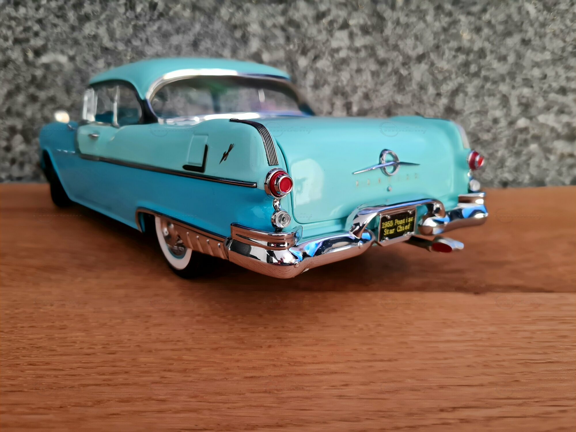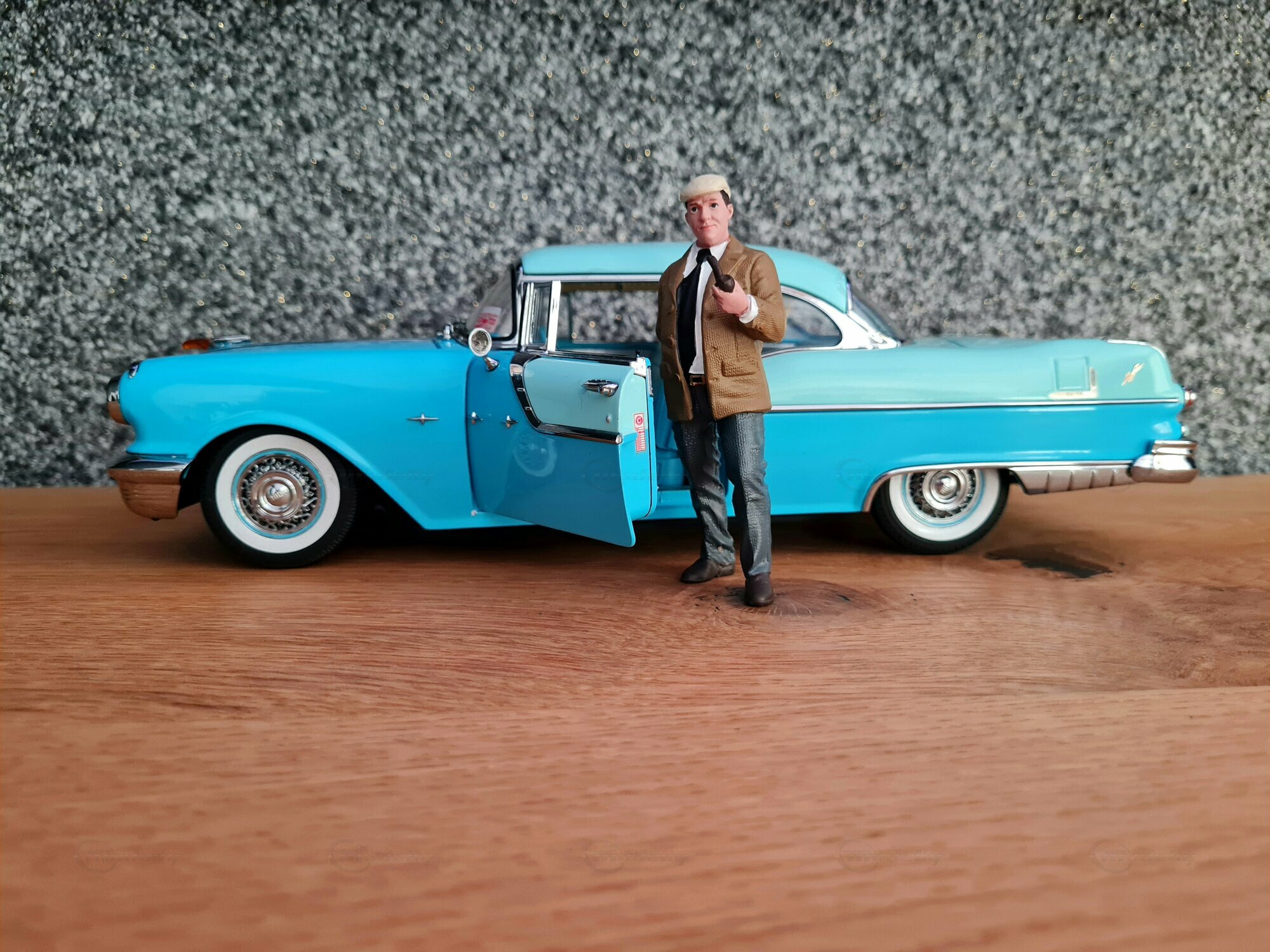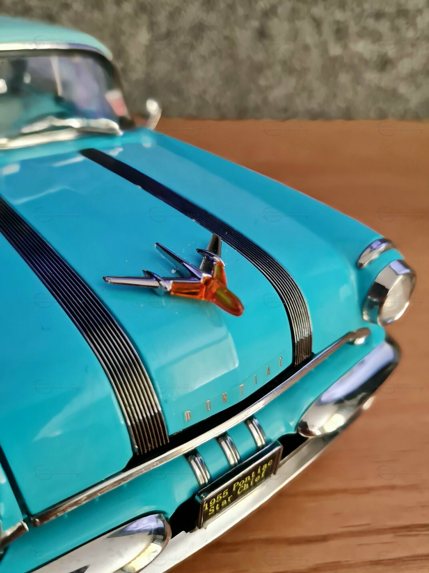 Der Pontiac Star Chief ist ein klassisches amerikanisches Automobil, das in den 1950er Jahren produziert wurde. Genauer gesagt, die gezeigte Miniatur basiert auf dem Modell aus dem Jahr 1955, das zur zweiten Generation des Pontiac Star Chief gehört, die von 1955 bis 1957 produziert wurde. Der Pontiac Star Chief war damals eines der renommiertesten Fahrzeuge der Marke Pontiac und stellte das Spitzenmodell der Marke dar. Designtechnisch zeichnet sich der Wagen durch seine elegante und markante Linienführung aus, welche unter der Federführung von Harley Earl entwickelt wurde. Im Jahr 1955, als dieser Wagen zum ersten Mal gebaut wurde, betraten bekannte Filme wie „Auf der Jagd nach dem goldenen Vlies“ die Kinolandschaft, und Disneyland, der berühmte Freizeitpark, öffnete seine Tore.