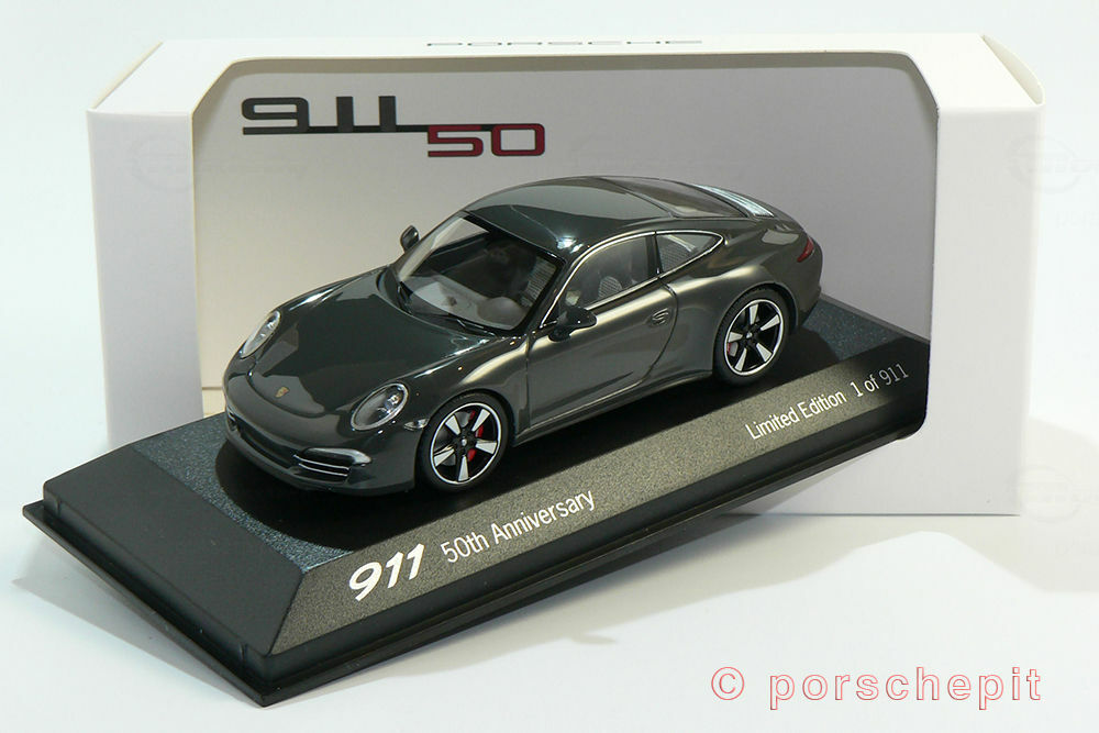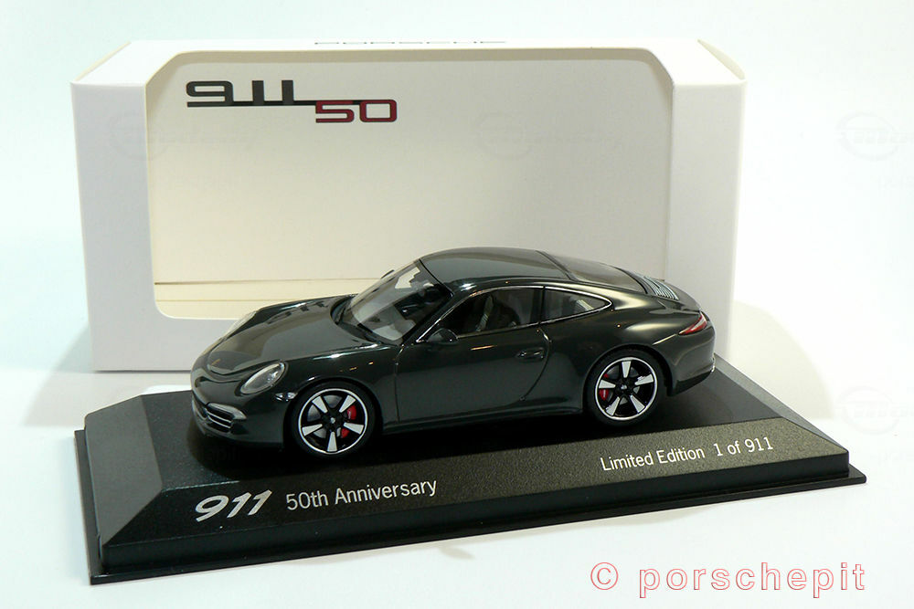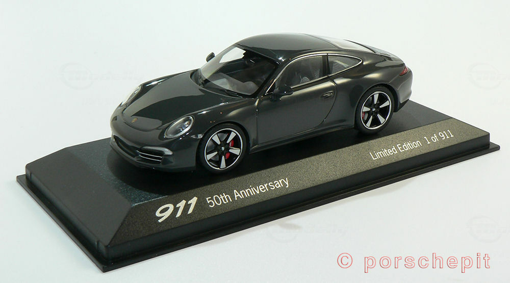 Das hier gezeigte Modell von Porschepit ist ein 1:43-Maßstab-Modellauto, das von der renommierten Marke Minichamps als Porsche Dealer Edition produziert wurde. Dieses Modell, das aus Diecast-Material gefertigt wurde, zeichnet sich durch seine präzise Verarbeitung und detailgetreue Nachbildung des originalen Fahrzeugs aus. Die Miniatur repräsentiert die aufwändige Lackierung in Graphitgrau und Schwarz sowie die charakteristischen 20-Zoll-Fuchs-Felgen. Zudem sind die emblematischen 50th Anniversary Logos am Modell deutlich zu erkennen. Diese Minichamps Miniatur ist eine limitierte Auflage von nur 911 Stück und stellt ein wertvolles Sammlerstück für Modellauto-Enthusiasten dar.