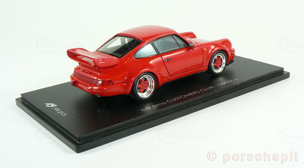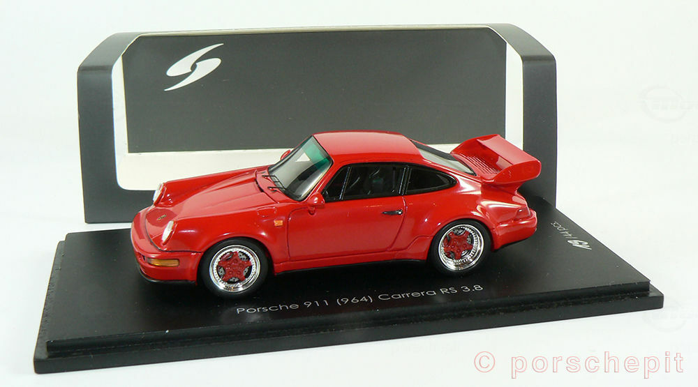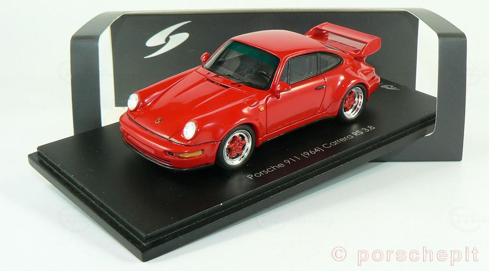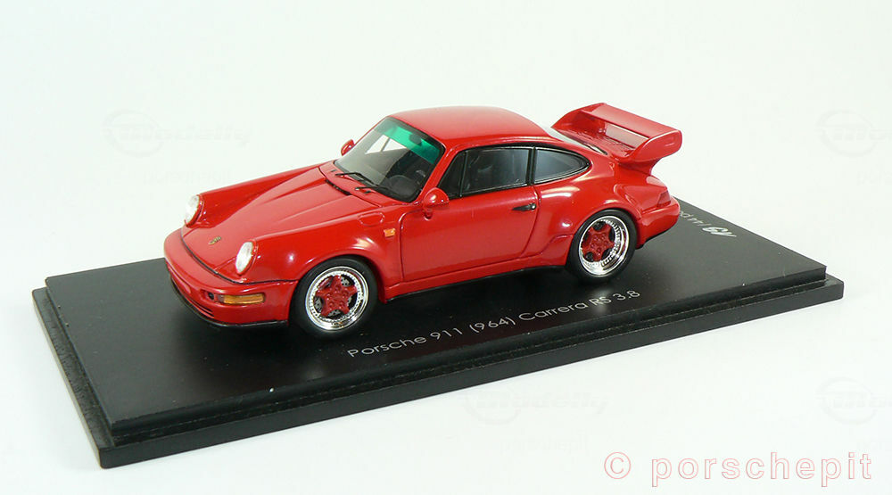 Das von Spark/Cartima hergestellte Miniaturmodell des Porsche 911 (964) Carrera RS 3.8 ist im Maßstab 1:43 gefertigt. Spark hat das Modellauto detailliert nachgebildet und setzt auf Materialsorgfalt. Das Modell ist auf Basis von Resin gefertigt, was eine präzise Darstellungsgenauigkeit und viele filigrane Details ermöglicht. Das Modell zeigt das Fahrzeug in einem glänzenden Rot, das die sportliche Eleganz des Originals betont. Die wichtige und markante Form des Heckspoilers sowie die schnittige Seitenlinie sind gut nachgebildet. In der Sammlung von Modelly Mitglied "porschepit" ist dieses Modell wegen seiner Detailtreue als Highlight zu betrachten. Auf den Fotos erkennt man die exakte Gestaltung der Front- und Heckpartien, die an das Rennsportdesign der 90er Jahre erinnern.