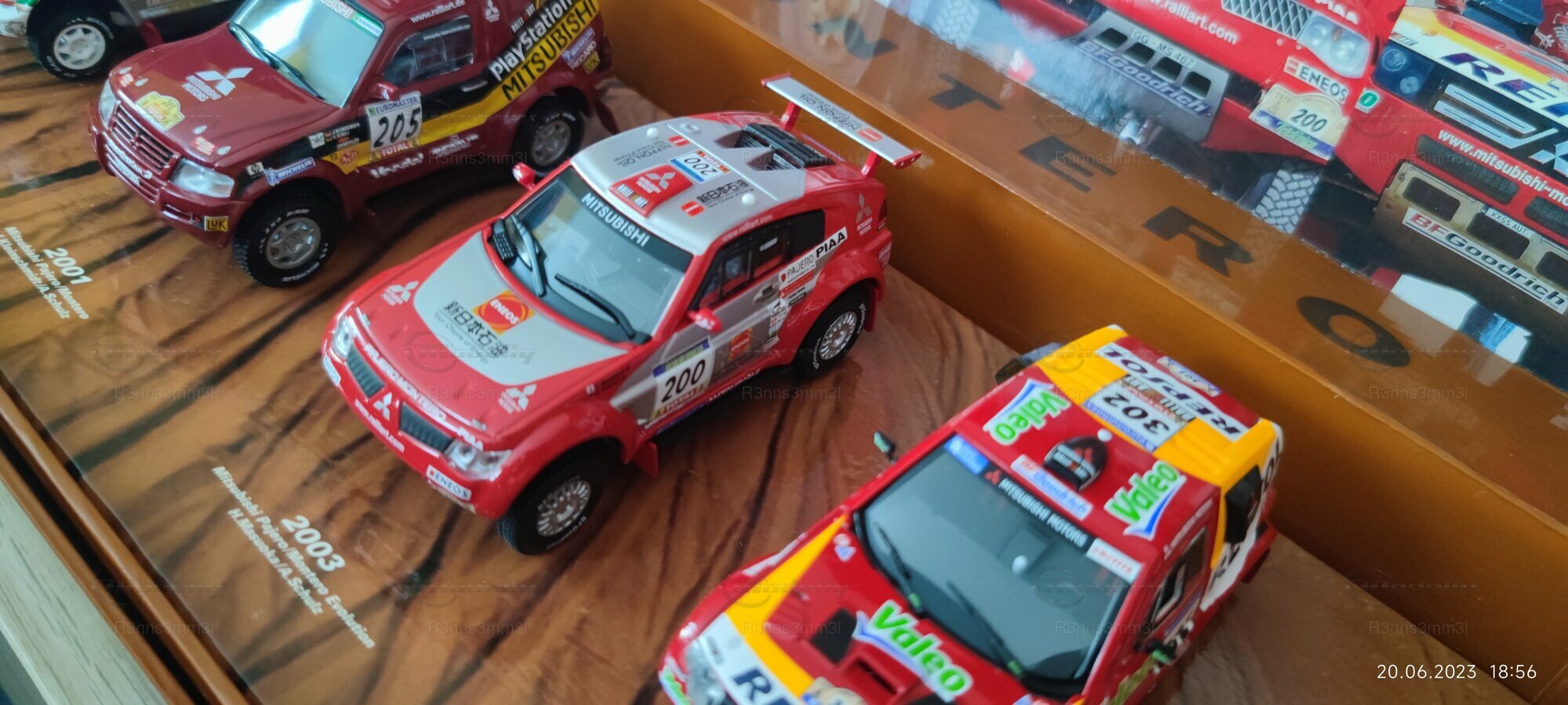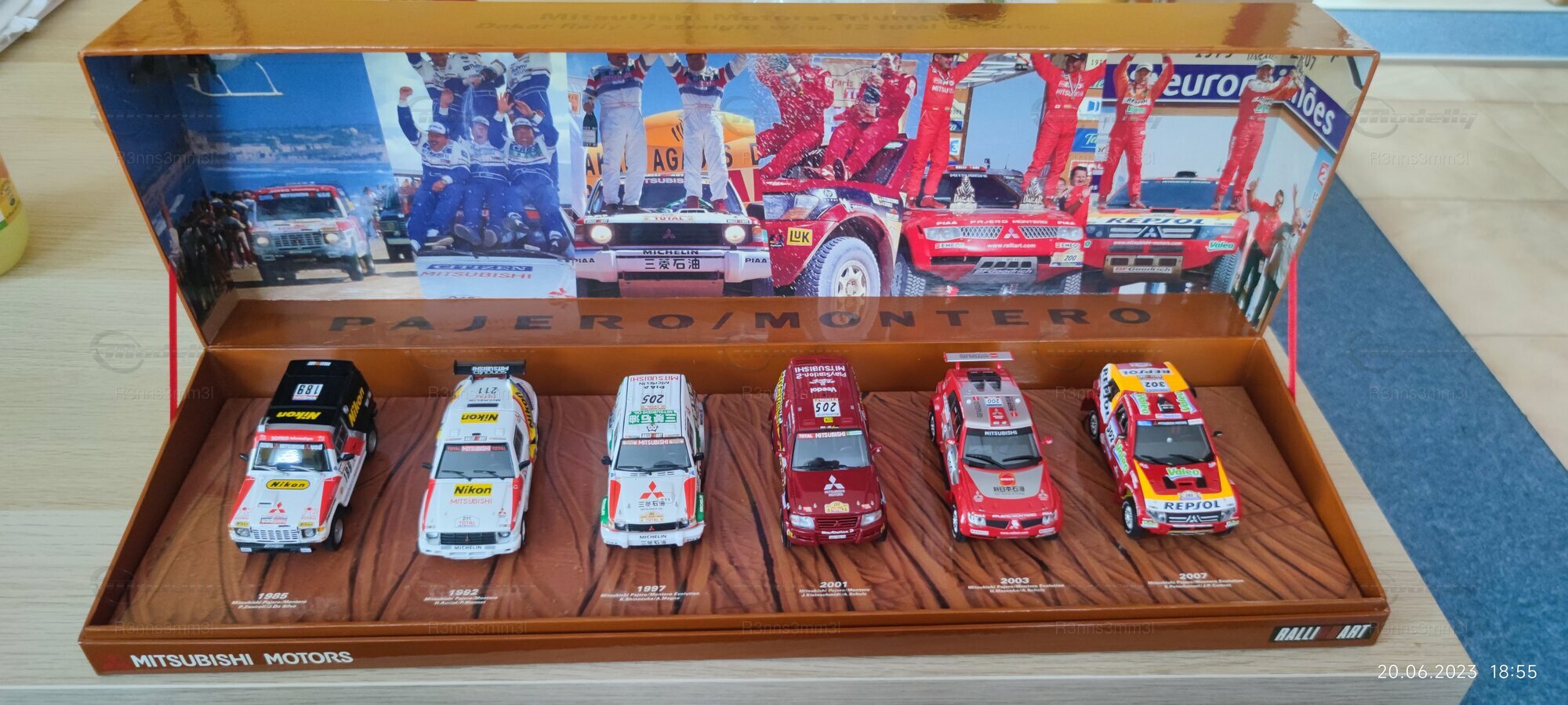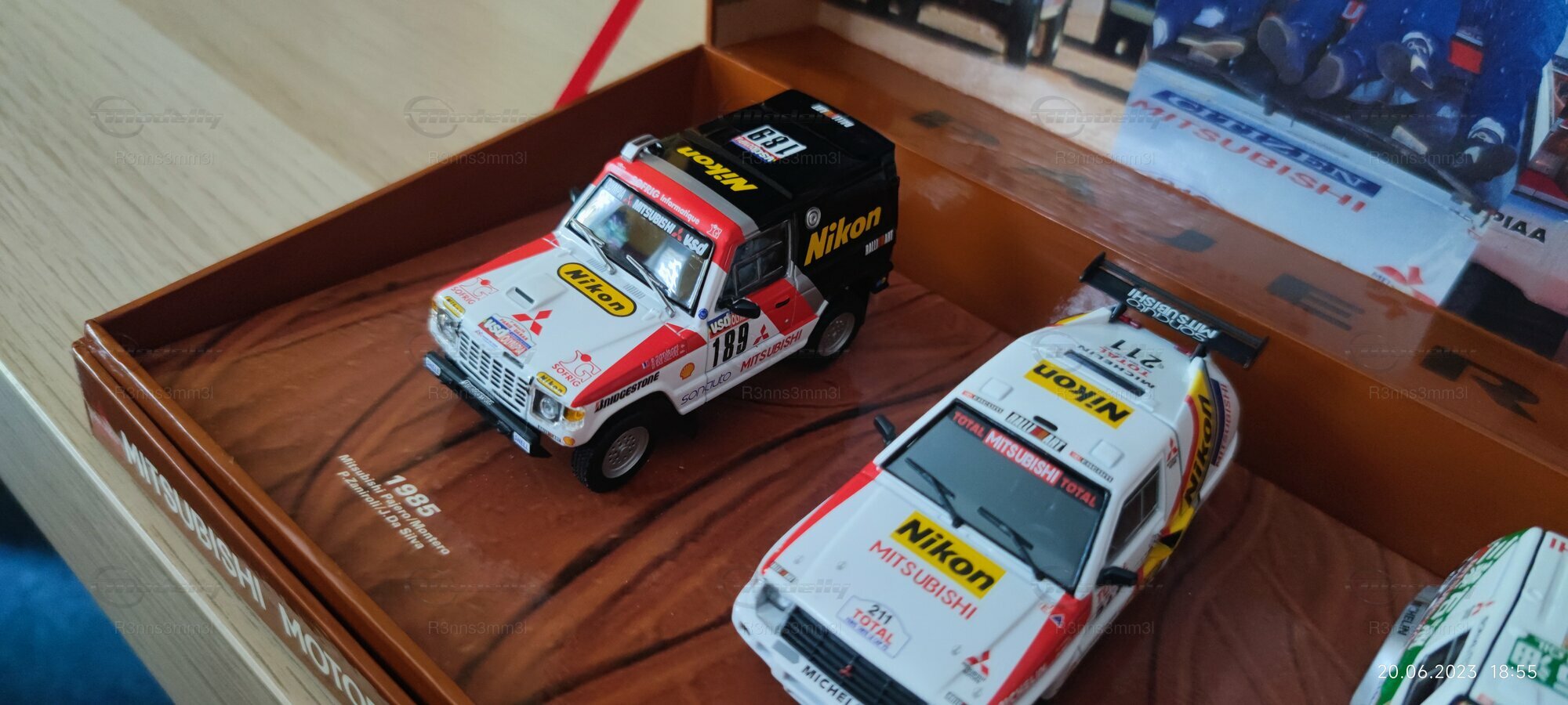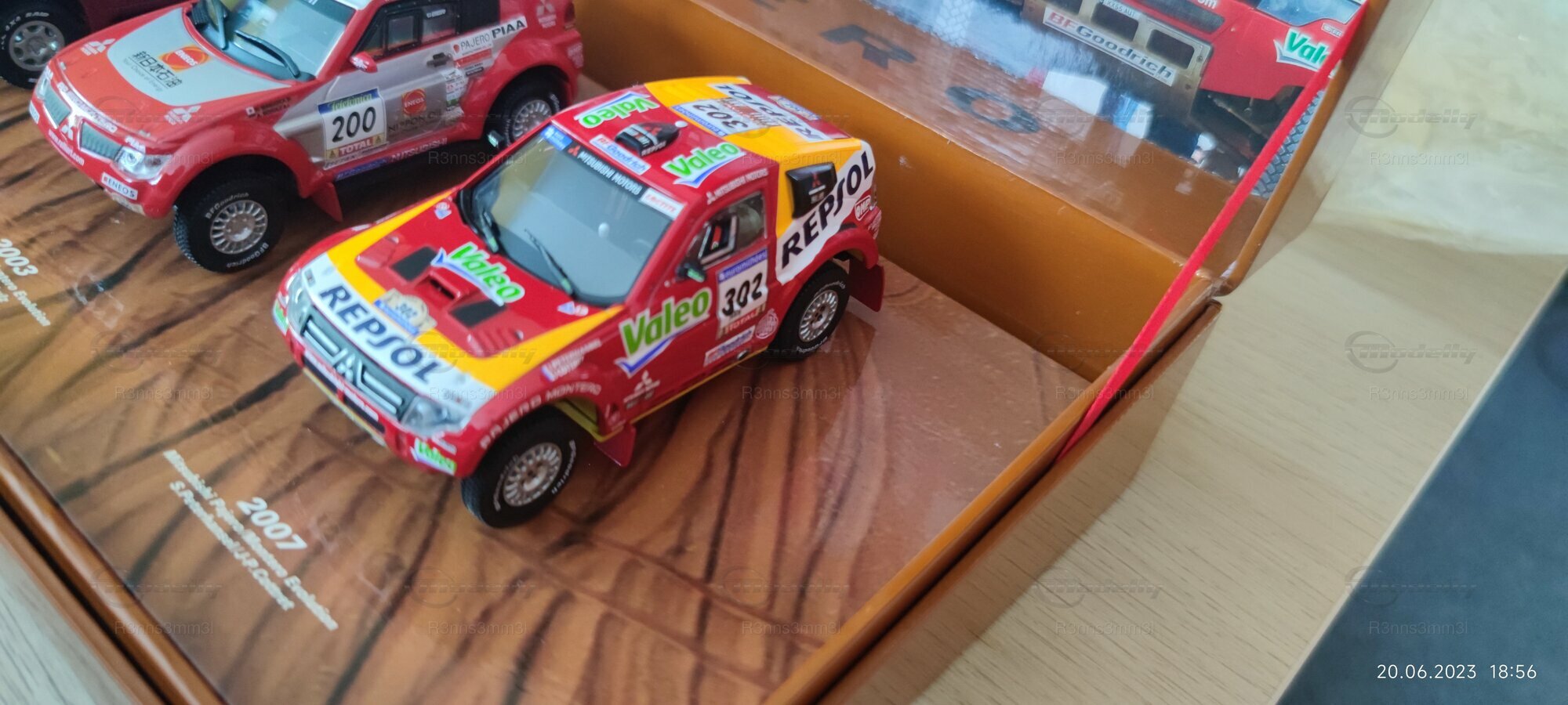 Das hier vorgestellte Miniaturmodell des Mitsubishi Pajero im 1:43 Maßstab stammt von Norev und ist aus Diecast-Material gefertigt. Modellautosammler schätzen die detailreiche Nachbildung und die präzise Verarbeitung dieses Modells. Auf dem Foto ist erkennbar, dass das Modell Teil der Sammlung von Modelly-Mitglied "R3nns3mm3l" ist. Die Box enthält verschiedene Varianten des Pajero, die an unterschiedlichen Dakar-Veranstaltungen teilgenommen haben. Die Modelle sind auf einem stilisierten Sanduntergrund präsentiert, was dem gesamten Set ein authentisches Wüstenrennen-Gefühl verleiht.
