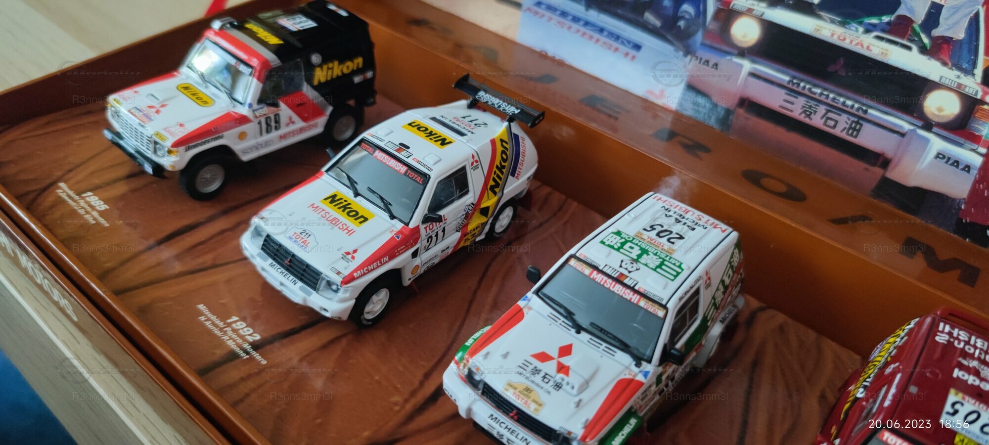 Das Miniaturmodell zeigt die charakteristische Lackierung des Mitsubishi Pajero in den typischen Rallye-Farben. Auffällig sind die Sponsoren-Aufkleber, darunter prominente Namen wie Nikon, Bridgestone und Total. Die Lackierung besteht aus einer Kombination aus Rot, Weiß und Schwarz, die dem Originalfahrzeug entspricht. Die Modelle haben auch präzise nachgebildete Details wie Scheinwerfer, seitliche Spiegel und das Logo von Mitsubishi auf der Motorhaube. Die Form und Proportionen des Modells entsprechen exakt denen des Originalfahrzeugs.