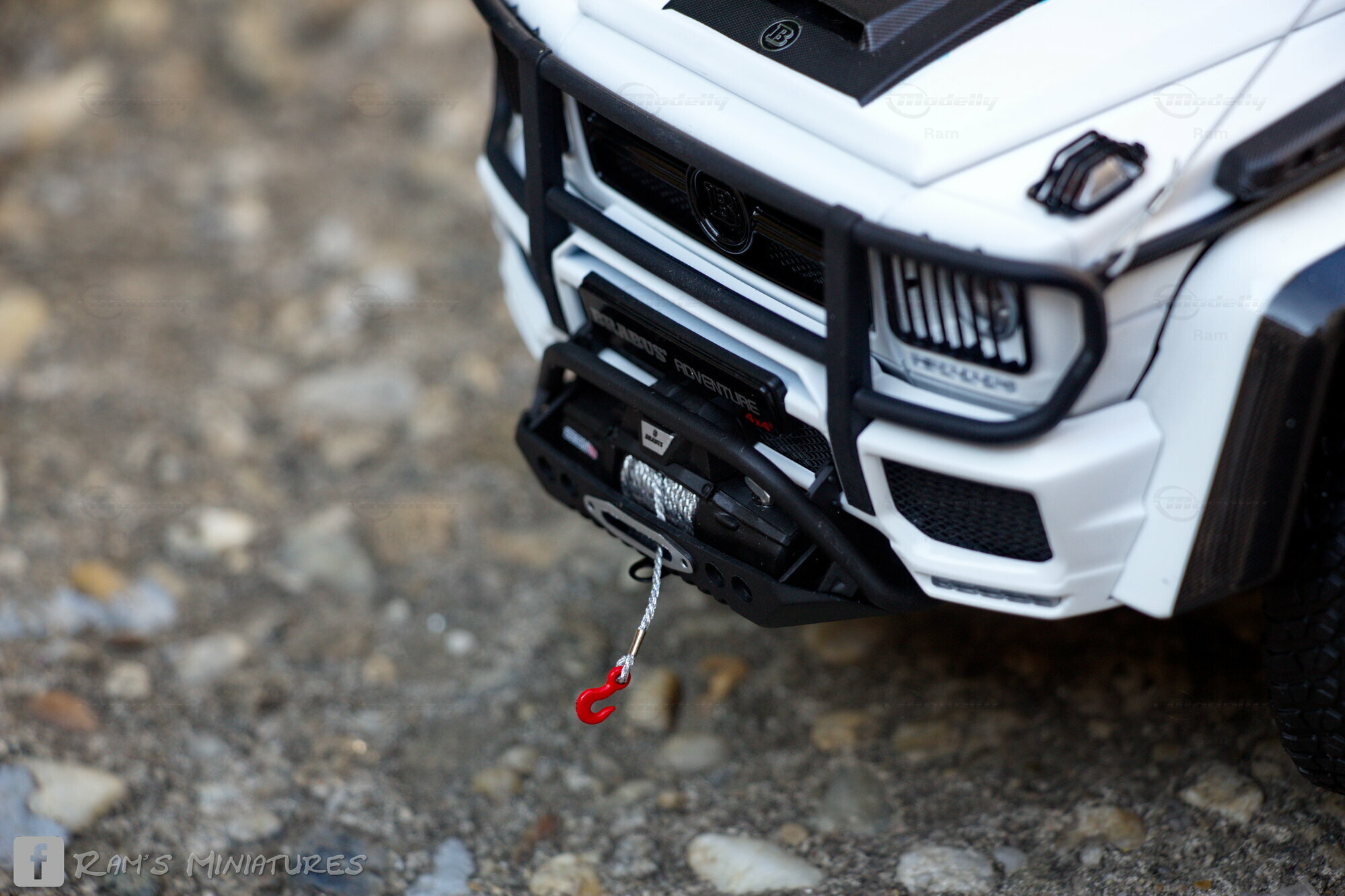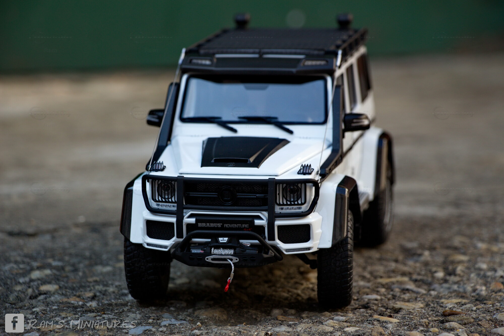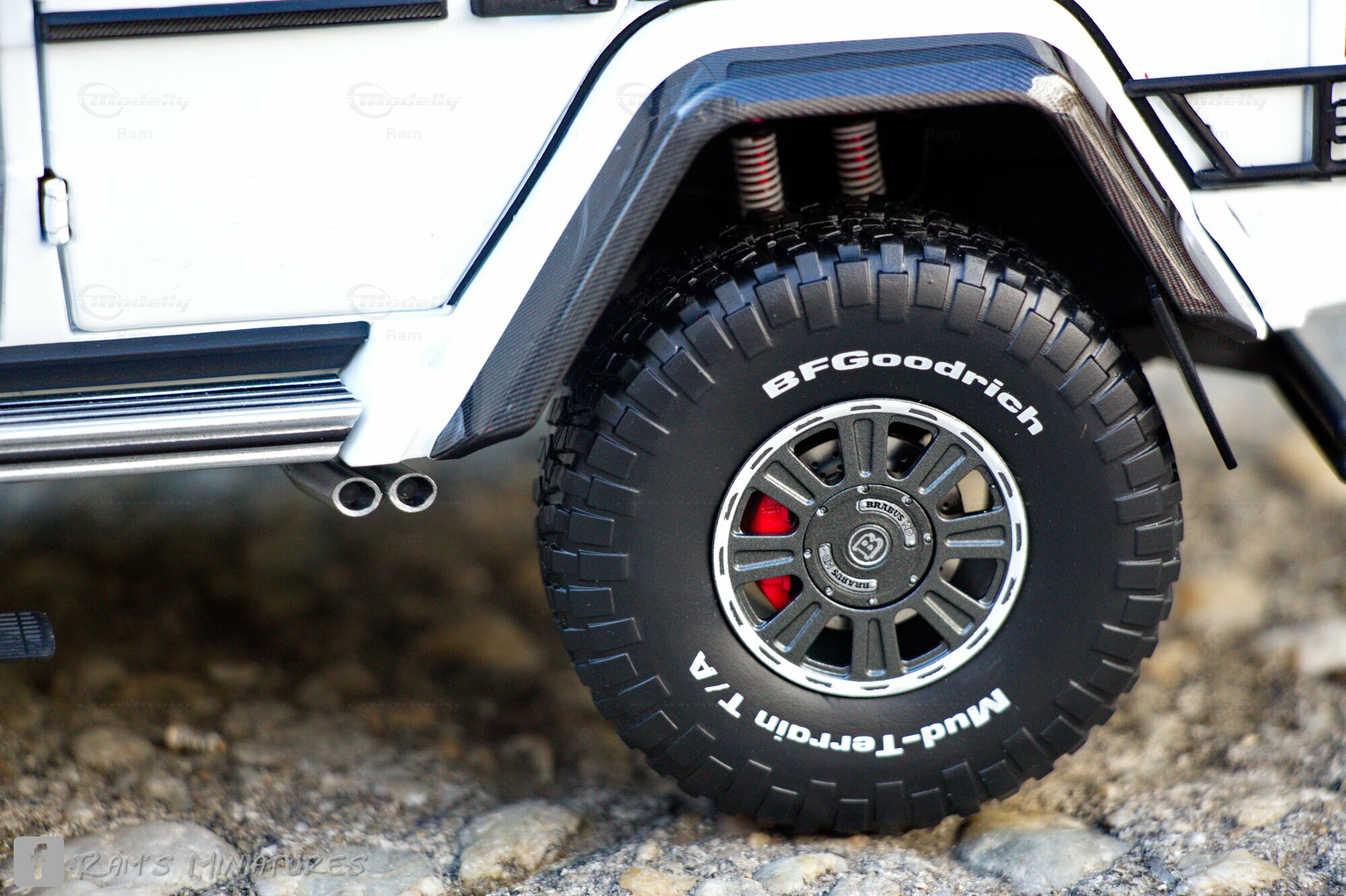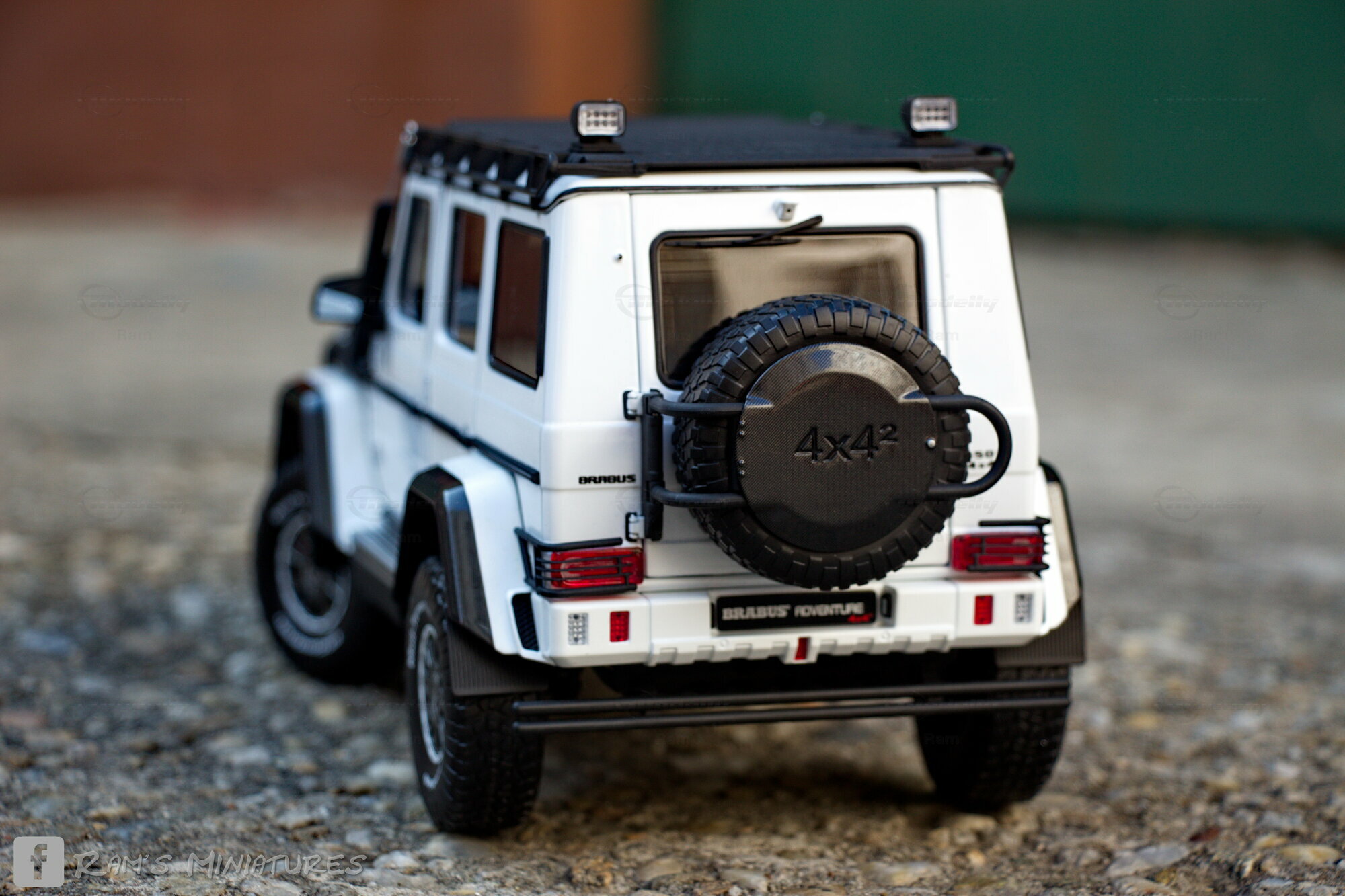 Das Modellauto, das hier in den 1:18 Maßstab von Almost Real umgesetzt wurde, ist ein exquisites Beispiel für Präzision und Detailtreue. Diese Miniatur ist aus hochwertigem Diecast-Material gefertigt, was ihr nicht nur ein realistisches Aussehen, sondern auch eine solide Haptik verleiht. Auffällig ist die perfekte Wiedergabe der mattschwarzen und weißen Farbgebung des Originals. Jedes kleinste Detail – von den Luftauslässen auf der Motorhaube bis hin zur Aussenverkabelung – wurde minutiös rekonstruiert. Auch der Frontschutzbügel inklusive Seilwinde sowie die Räder mit dem logo der Reifenmarke BF Goodrich Mud-Terrain T/A stechen hervor, die dem Modell seine robuste und abenteuerliche Erscheinung verleihen. Modellautosammler können sich an diesen Details erfreuen, die den Brabus 550 Adventure 4×4² in Miniaturform auszeichnen.
