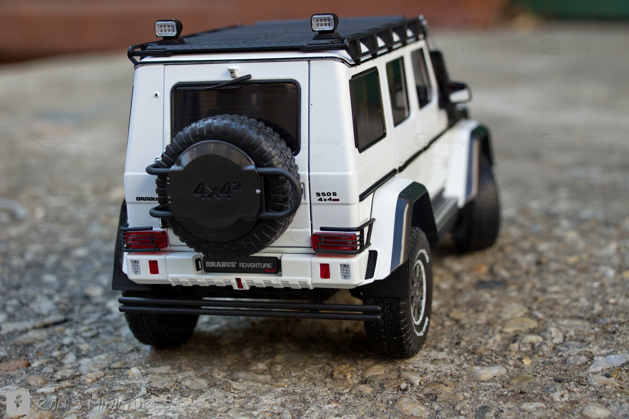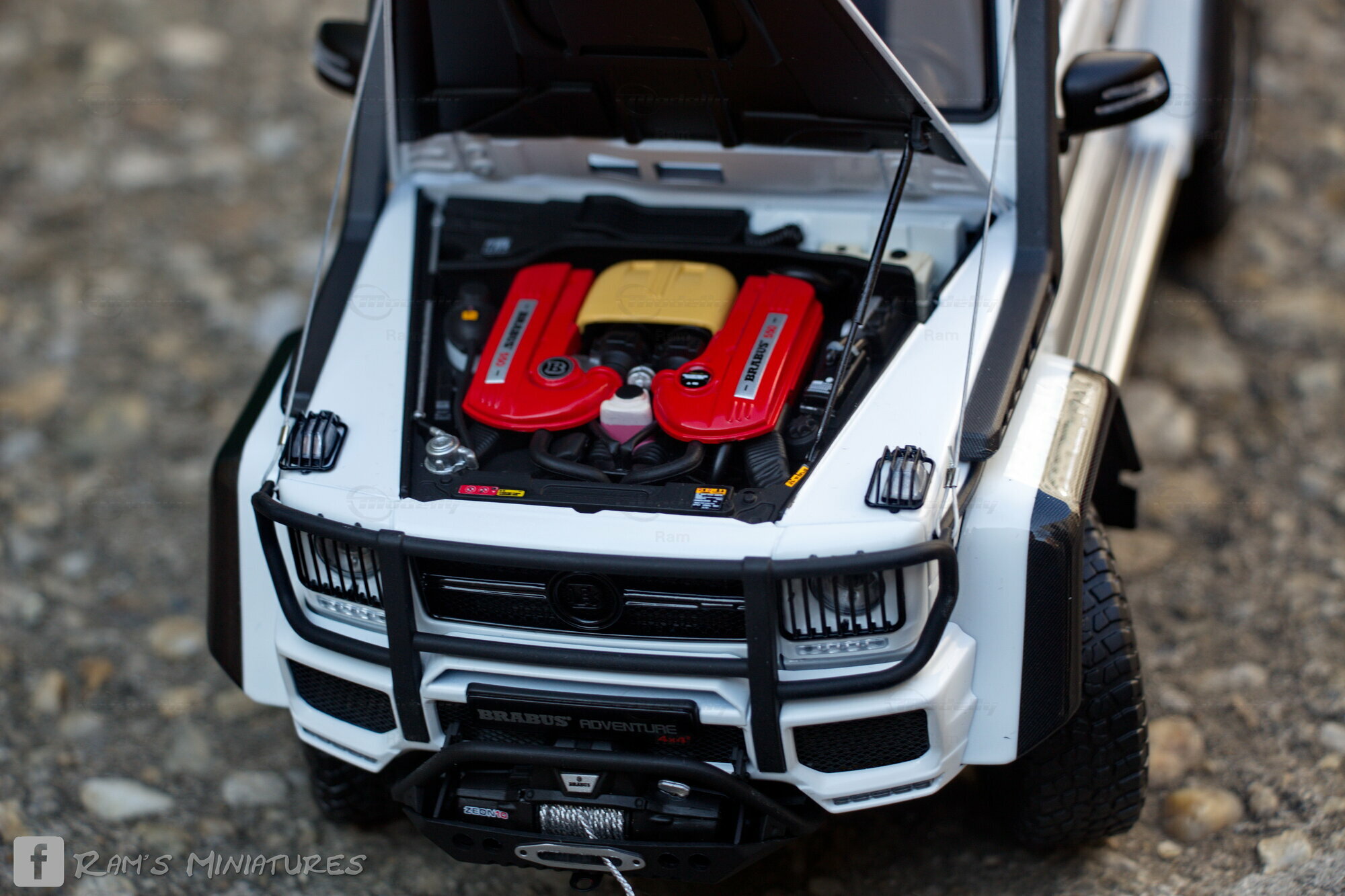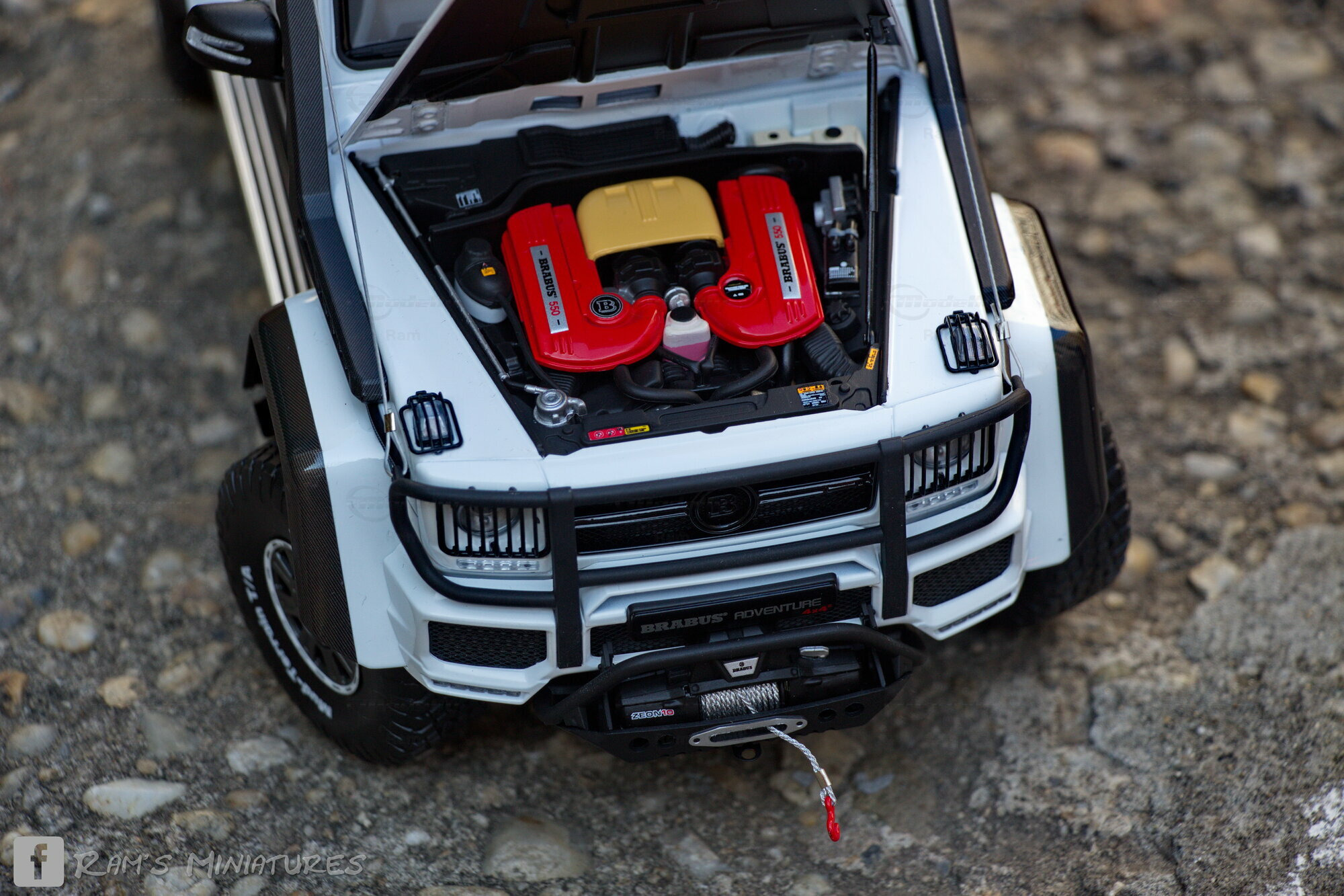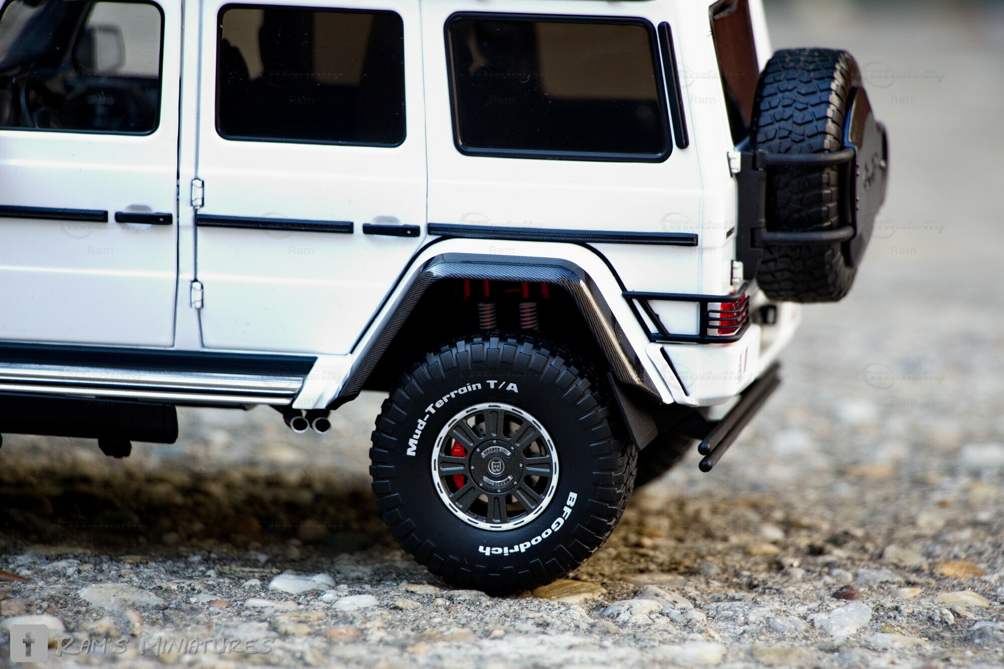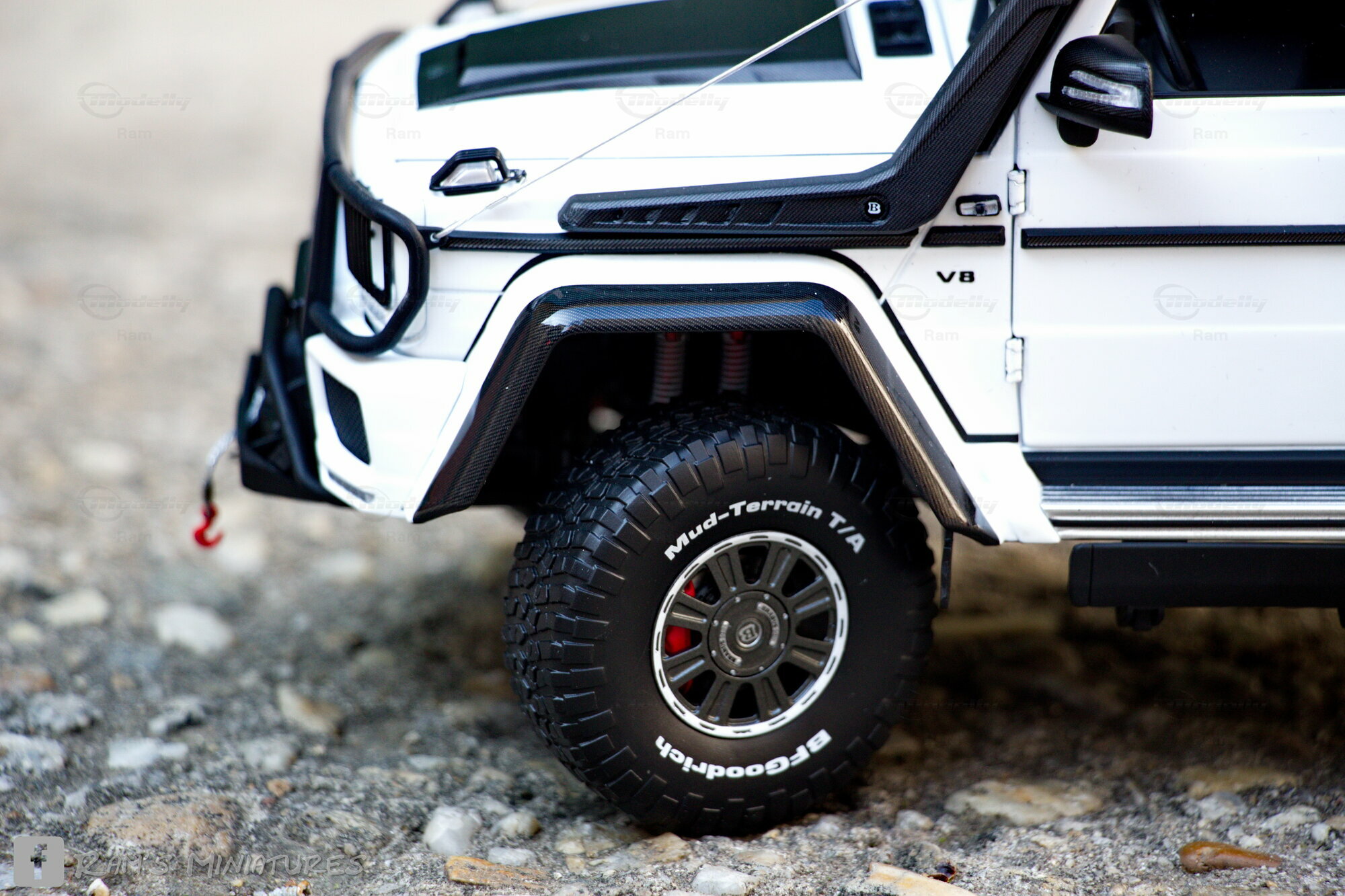 Das Modellauto, das hier in den 1:18 Maßstab von Almost Real umgesetzt wurde, ist ein exquisites Beispiel für Präzision und Detailtreue. Diese Miniatur ist aus hochwertigem Diecast-Material gefertigt, was ihr nicht nur ein realistisches Aussehen, sondern auch eine solide Haptik verleiht. Auffällig ist die perfekte Wiedergabe der mattschwarzen und weißen Farbgebung des Originals. Jedes kleinste Detail – von den Luftauslässen auf der Motorhaube bis hin zur Aussenverkabelung – wurde minutiös rekonstruiert. Auch der Frontschutzbügel inklusive Seilwinde sowie die Räder mit dem logo der Reifenmarke BF Goodrich Mud-Terrain T/A stechen hervor, die dem Modell seine robuste und abenteuerliche Erscheinung verleihen. Modellautosammler können sich an diesen Details erfreuen, die den Brabus 550 Adventure 4×4² in Miniaturform auszeichnen.