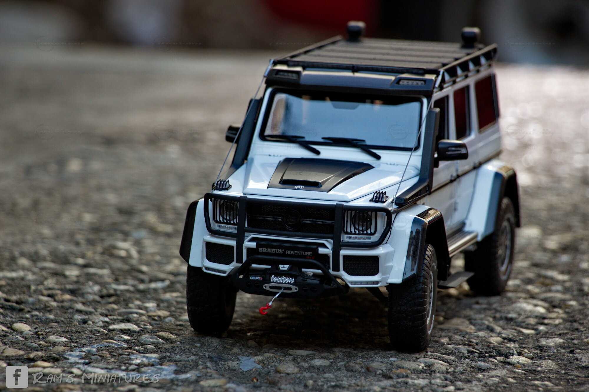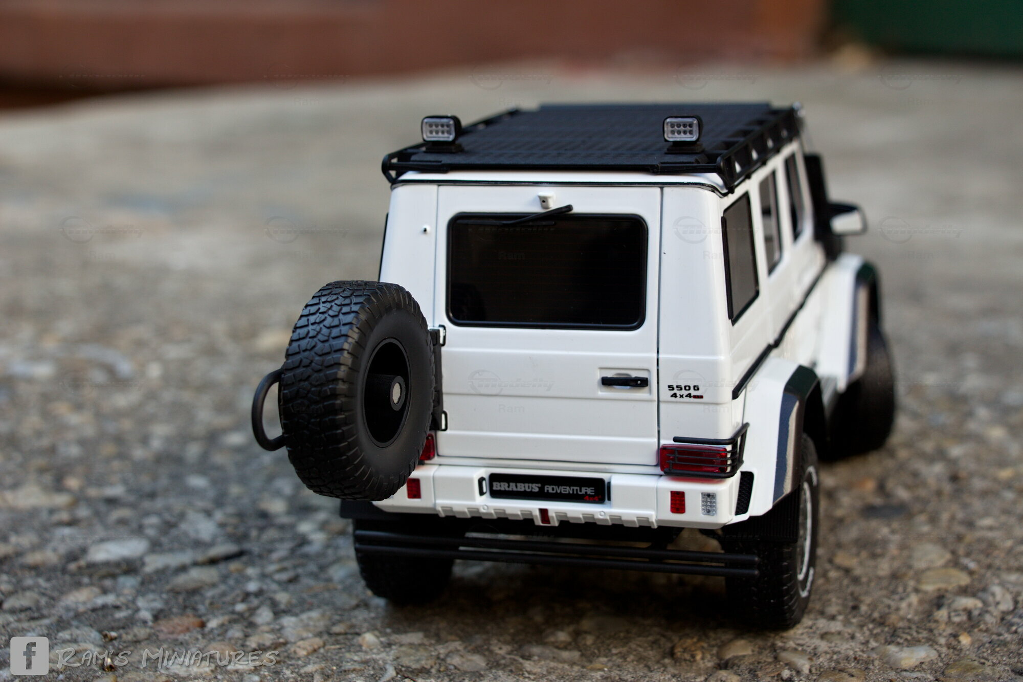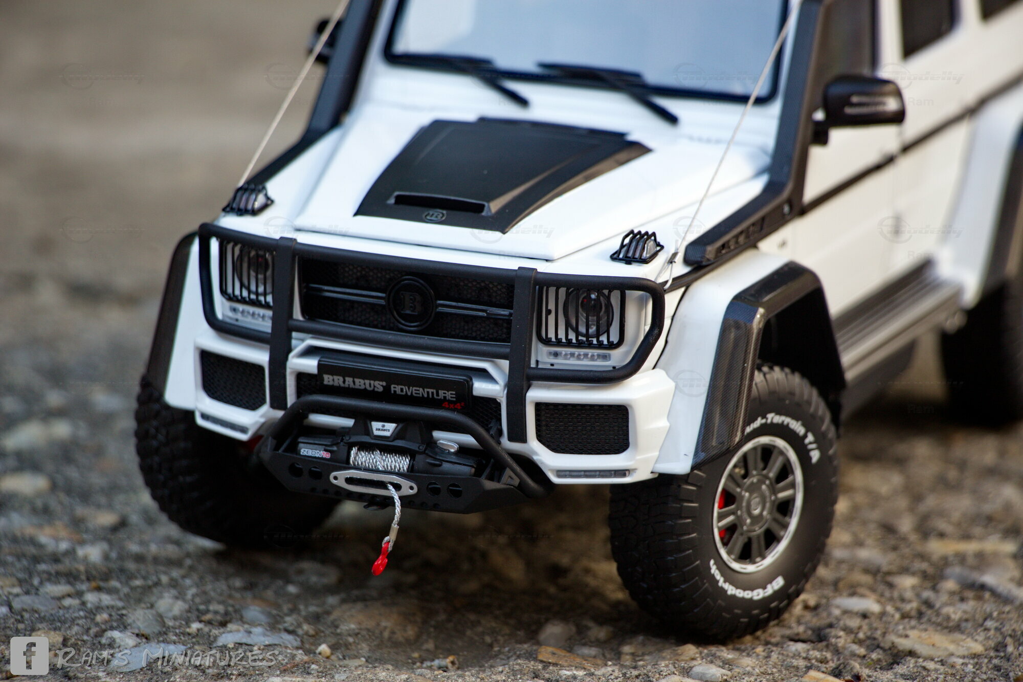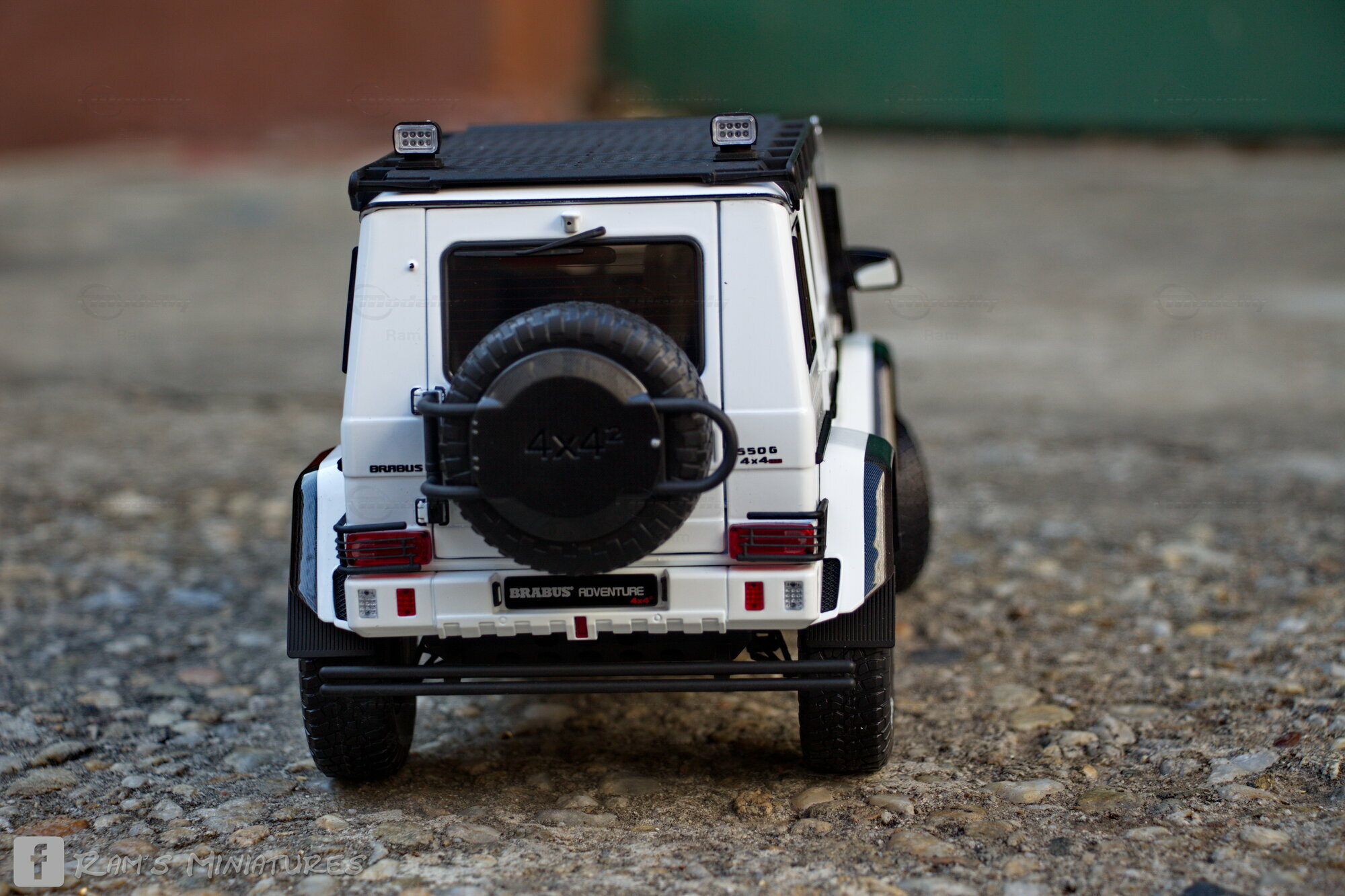 Das Modellauto, das hier in den 1:18 Maßstab von Almost Real umgesetzt wurde, ist ein exquisites Beispiel für Präzision und Detailtreue. Diese Miniatur ist aus hochwertigem Diecast-Material gefertigt, was ihr nicht nur ein realistisches Aussehen, sondern auch eine solide Haptik verleiht. Auffällig ist die perfekte Wiedergabe der mattschwarzen und weißen Farbgebung des Originals. Jedes kleinste Detail – von den Luftauslässen auf der Motorhaube bis hin zur Aussenverkabelung – wurde minutiös rekonstruiert. Auch der Frontschutzbügel inklusive Seilwinde sowie die Räder mit dem logo der Reifenmarke BF Goodrich Mud-Terrain T/A stechen hervor, die dem Modell seine robuste und abenteuerliche Erscheinung verleihen. Modellautosammler können sich an diesen Details erfreuen, die den Brabus 550 Adventure 4×4² in Miniaturform auszeichnen.