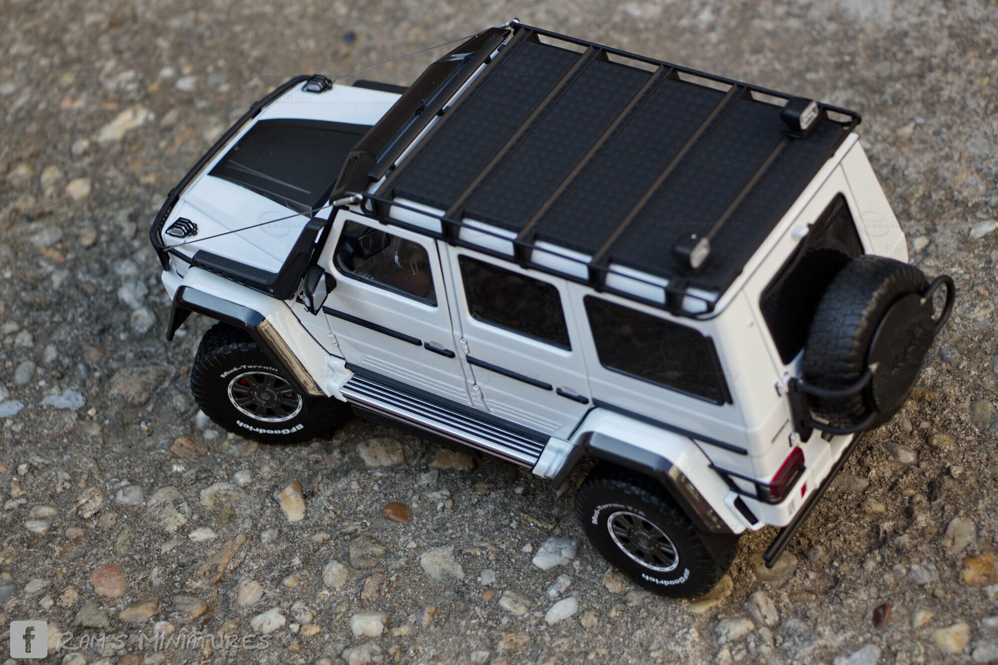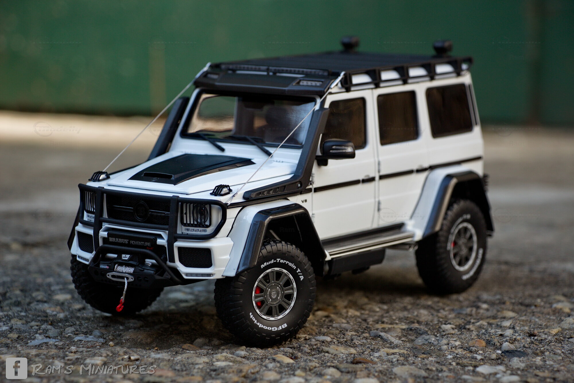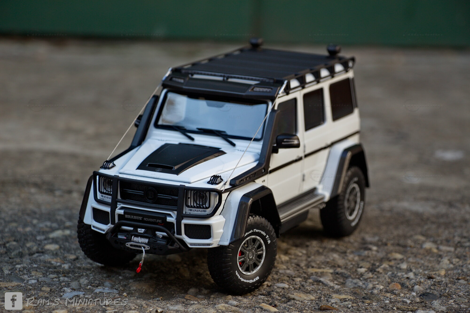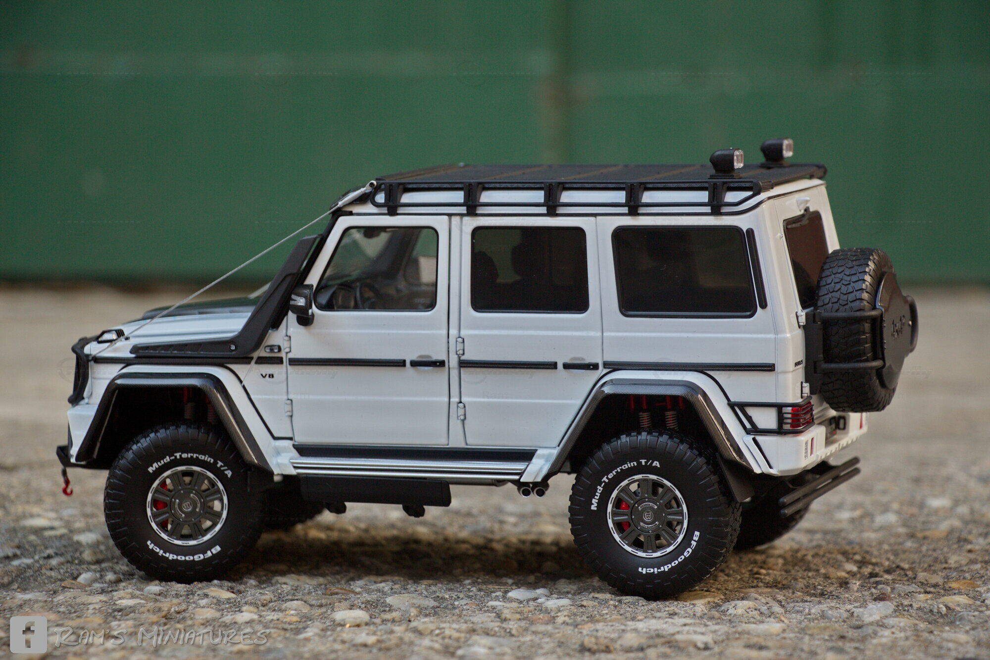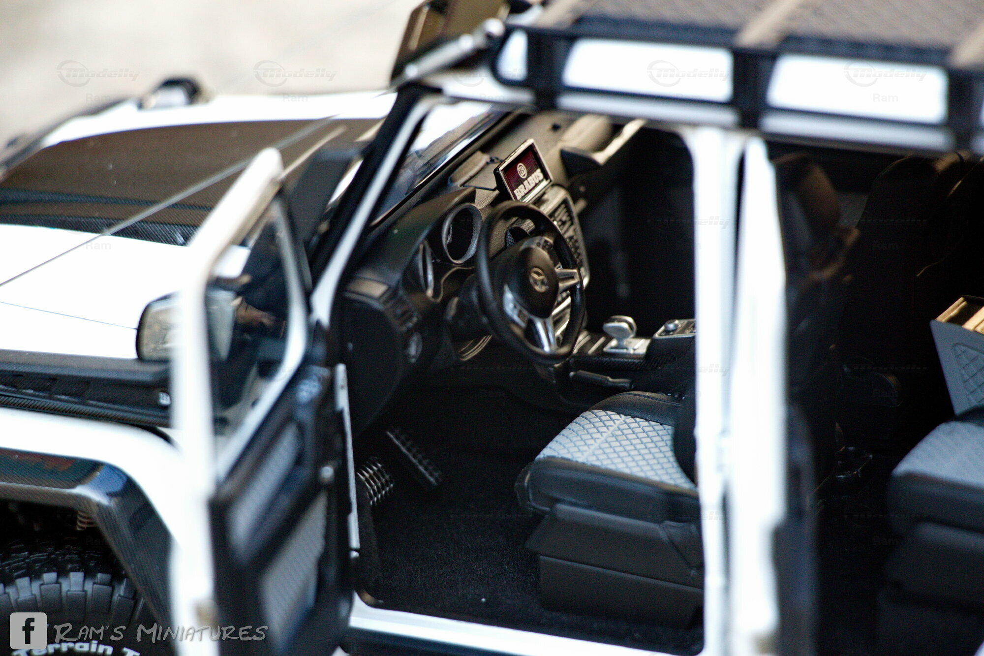 Das Modellauto, das hier in den 1:18 Maßstab von Almost Real umgesetzt wurde, ist ein exquisites Beispiel für Präzision und Detailtreue. Diese Miniatur ist aus hochwertigem Diecast-Material gefertigt, was ihr nicht nur ein realistisches Aussehen, sondern auch eine solide Haptik verleiht. Auffällig ist die perfekte Wiedergabe der mattschwarzen und weißen Farbgebung des Originals. Jedes kleinste Detail – von den Luftauslässen auf der Motorhaube bis hin zur Aussenverkabelung – wurde minutiös rekonstruiert. Auch der Frontschutzbügel inklusive Seilwinde sowie die Räder mit dem logo der Reifenmarke BF Goodrich Mud-Terrain T/A stechen hervor, die dem Modell seine robuste und abenteuerliche Erscheinung verleihen. Modellautosammler können sich an diesen Details erfreuen, die den Brabus 550 Adventure 4×4² in Miniaturform auszeichnen.
