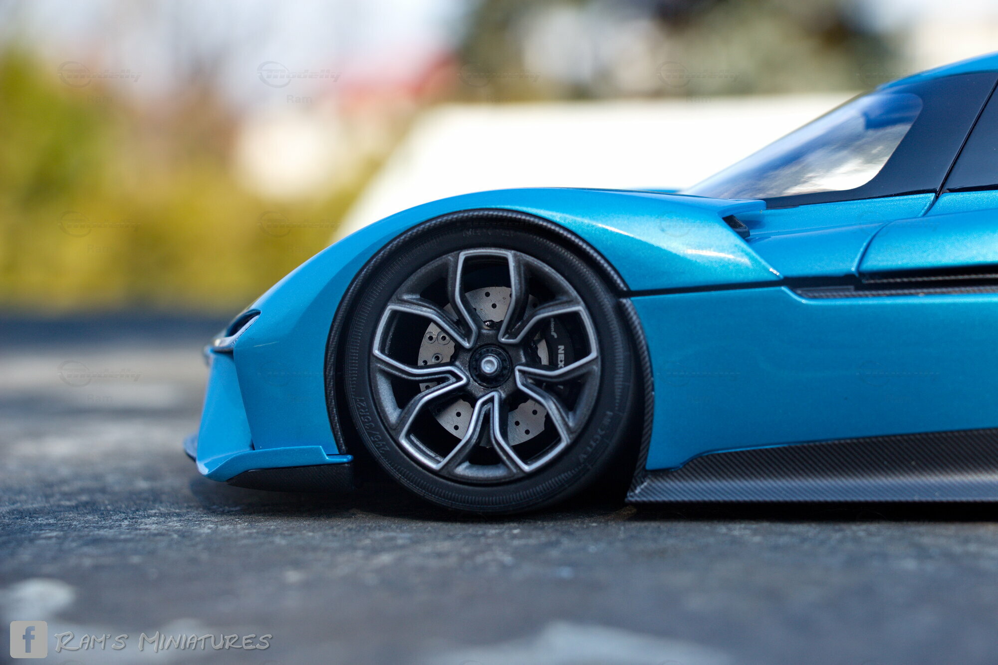 Das hier gezeigte Modell des NIO EP9 wurde von Almost Real im Maßstab 1:18 gefertigt und basiert auf dem Material Diecast, was eine hohe Detailtreue und Qualität verspricht. Dieser maßstabsgetreue Nachbau fängt die aggressive und dennoch elegante Linie des Originals perfekt ein. Zu den Highlights gehören die präzise nachgebildeten Scheinwerfer, die charakteristische Frontpartie sowie der markante Heckspoiler. Die schwarzen Felgen unterstreichen das sportliche Erscheinungsbild des Modells und verleihen ihm eine zusätzliche Tiefe im Design. Das Modell ist in einem markanten Blau lackiert, welches den dynamischen Charakter des Sportwagens unterstreicht und in jeder Sammlung heraussticht.