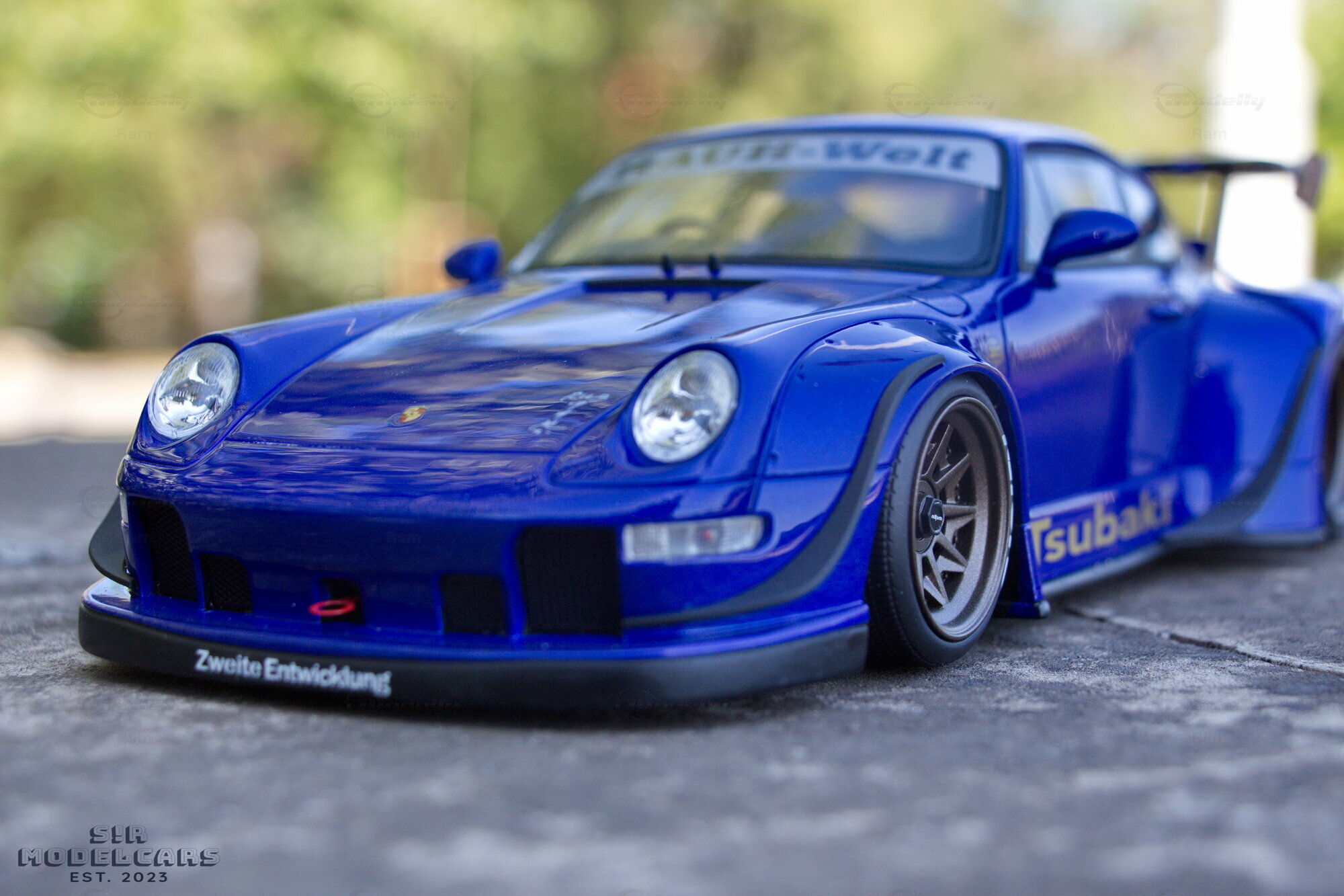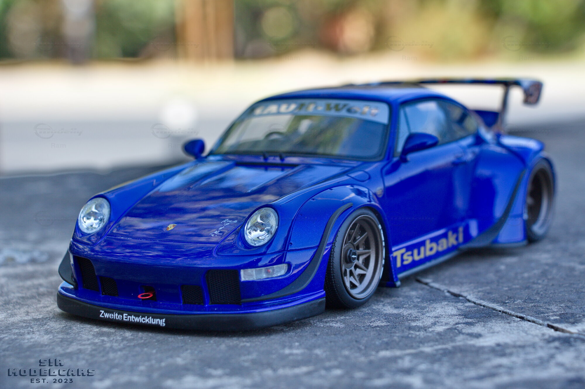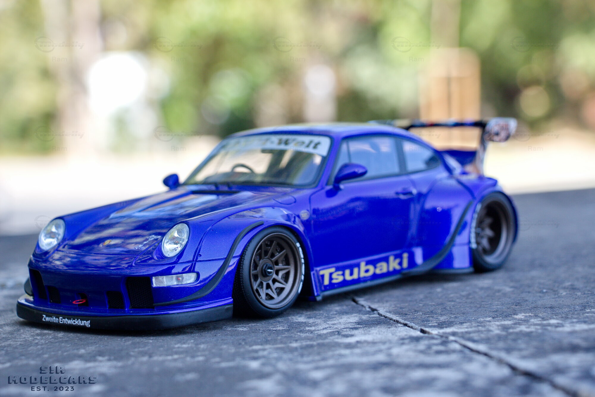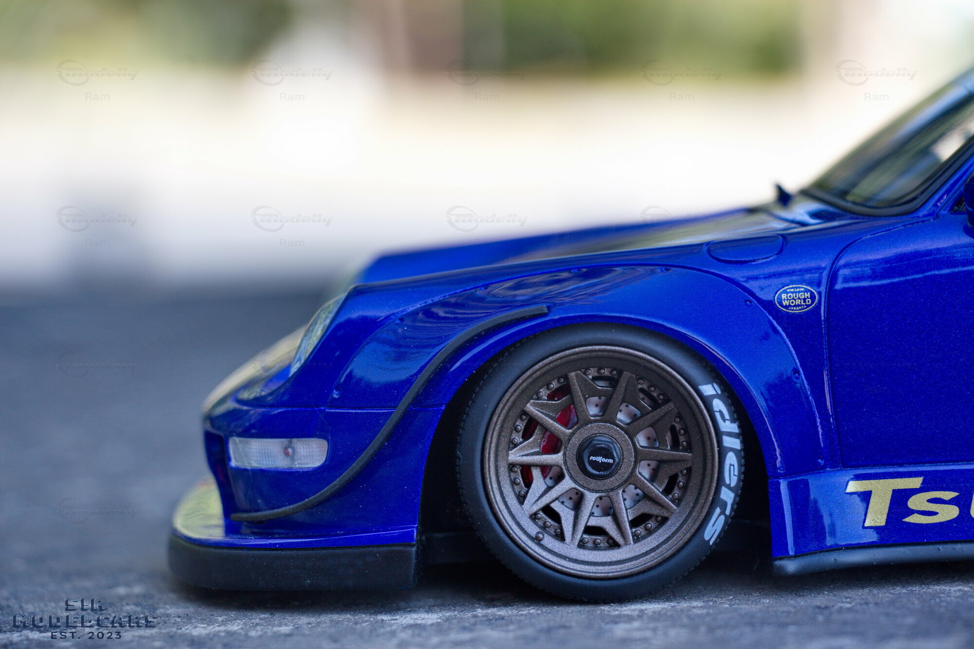 Die GT Spirit Nachbildung dieses 1:18 Modells beeindruckt durch ihre Detailtreue und den feinen Verarbeitungsgrad. Das auffällige Karosseriedesign des RWB (Rauh-Welt Begriff) Widebody-Kits, entwickelt vom Tuner Akira Nakai, ist präzise wiedergegeben. Das markante blaue Finish des Modells und die ausgefallenen grafischen Akzente auf dem Heckflügel sind ebenfalls exakt nachempfunden. Das Modell hat spezifische Work Meister Felgen, die zu den beliebtesten Tuning-Komponenten für diesen Fahrzeugtyp zählen. Diese Komponenten tragen maßgeblich zur Erkennung der historischen Modifikationen bei. Neben dem auffälligen Design und den detaillierten Felgen zeigt das Modell die charakteristischen breiten Kotflügel und den überdimensionalen Heckspoiler des RWB-Kits.