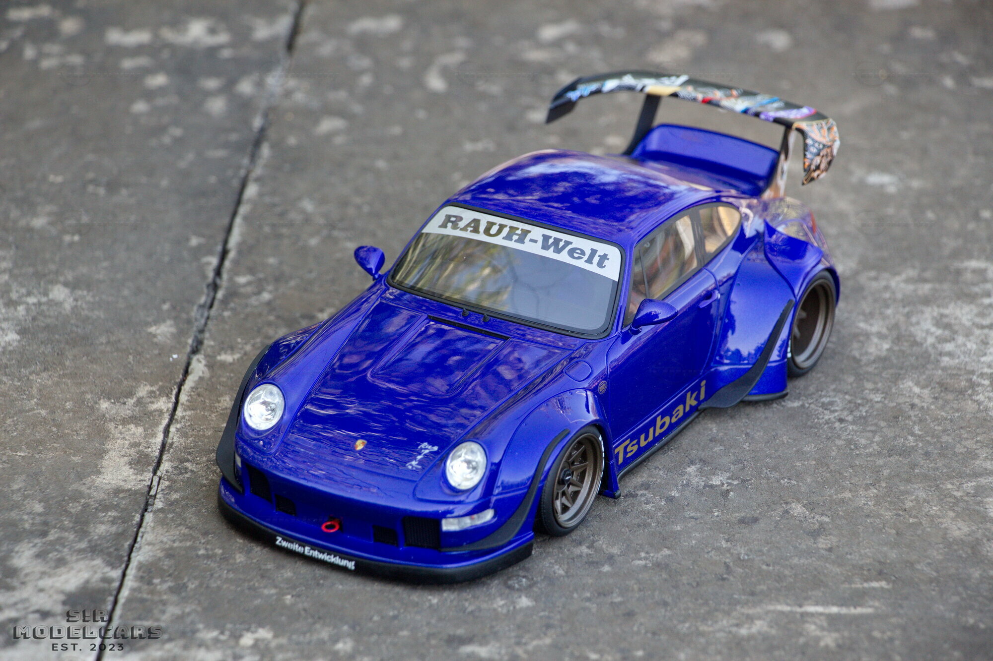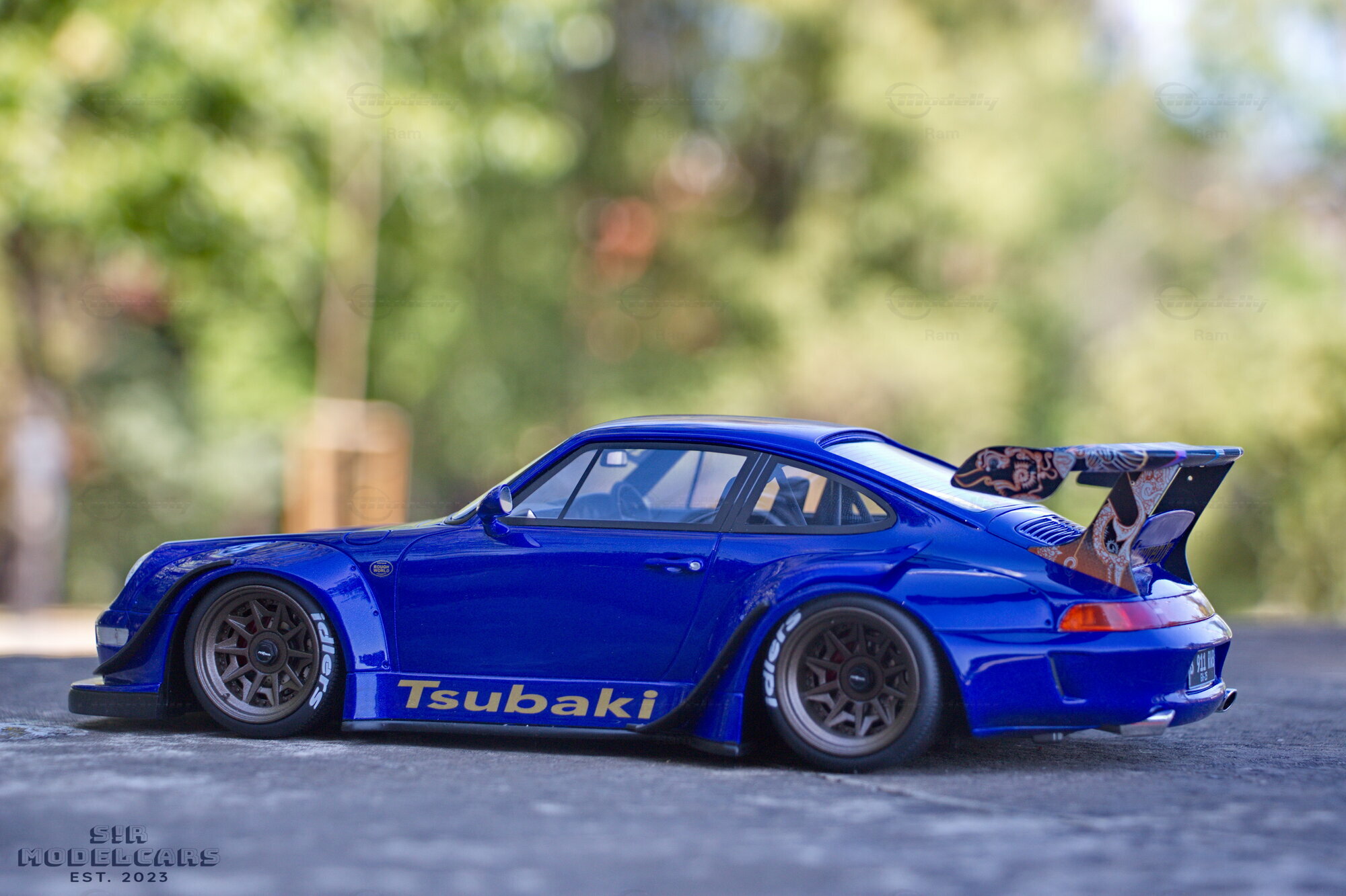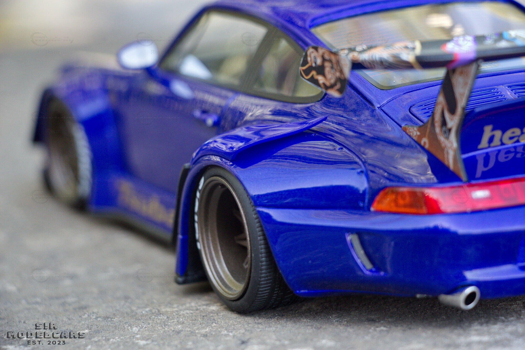 Die GT Spirit Nachbildung dieses 1:18 Modells beeindruckt durch ihre Detailtreue und den feinen Verarbeitungsgrad. Das auffällige Karosseriedesign des RWB (Rauh-Welt Begriff) Widebody-Kits, entwickelt vom Tuner Akira Nakai, ist präzise wiedergegeben. Das markante blaue Finish des Modells und die ausgefallenen grafischen Akzente auf dem Heckflügel sind ebenfalls exakt nachempfunden. Das Modell hat spezifische Work Meister Felgen, die zu den beliebtesten Tuning-Komponenten für diesen Fahrzeugtyp zählen. Diese Komponenten tragen maßgeblich zur Erkennung der historischen Modifikationen bei. Neben dem auffälligen Design und den detaillierten Felgen zeigt das Modell die charakteristischen breiten Kotflügel und den überdimensionalen Heckspoiler des RWB-Kits.