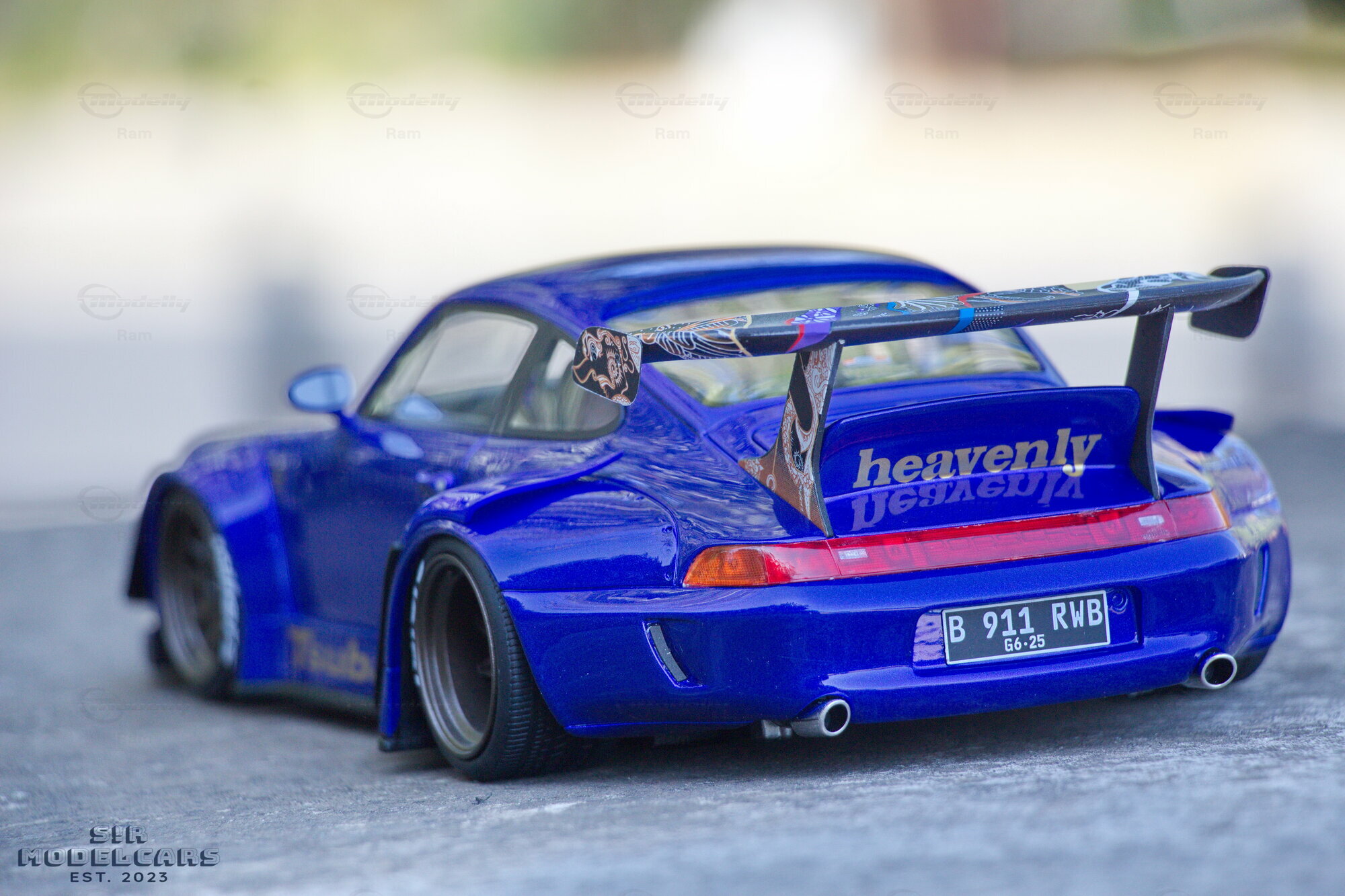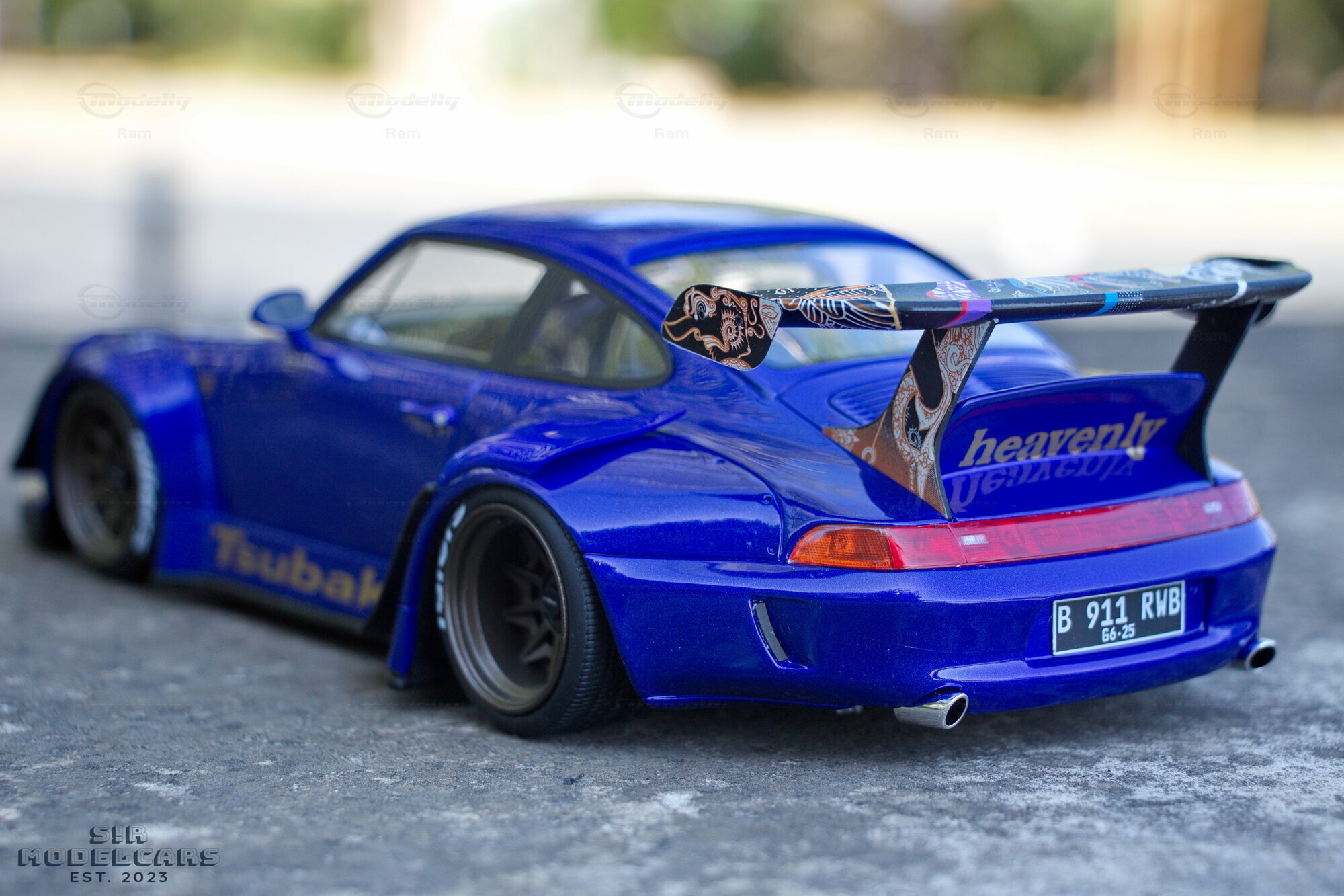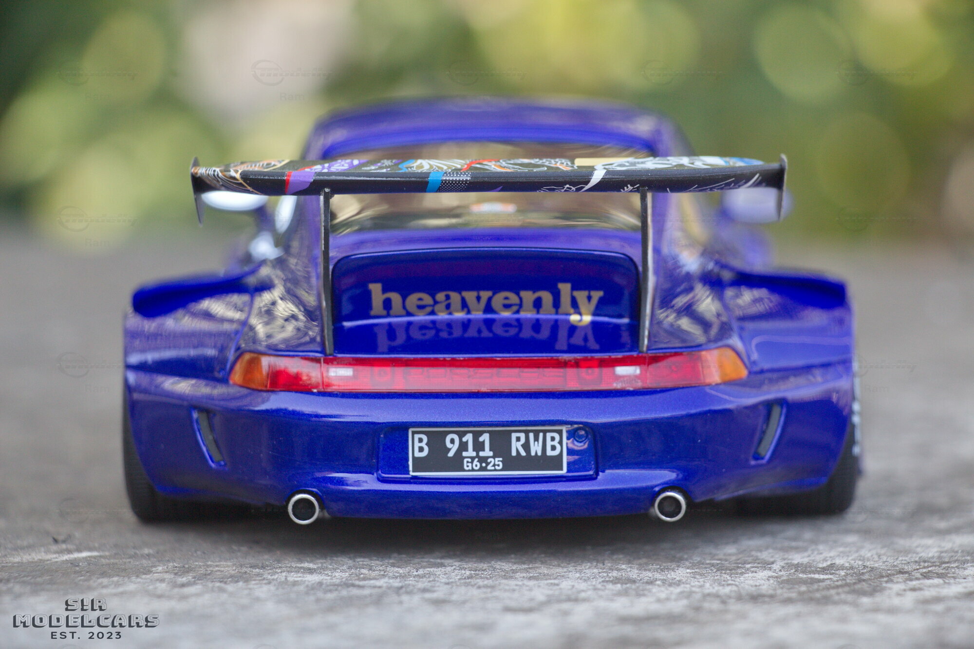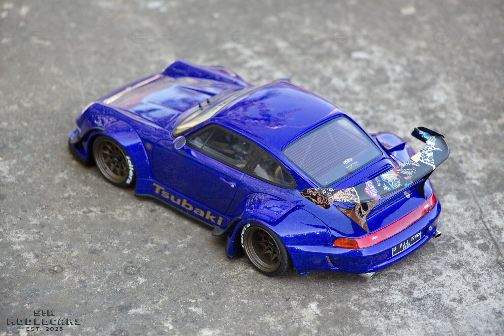 Die GT Spirit Nachbildung dieses 1:18 Modells beeindruckt durch ihre Detailtreue und den feinen Verarbeitungsgrad. Das auffällige Karosseriedesign des RWB (Rauh-Welt Begriff) Widebody-Kits, entwickelt vom Tuner Akira Nakai, ist präzise wiedergegeben. Das markante blaue Finish des Modells und die ausgefallenen grafischen Akzente auf dem Heckflügel sind ebenfalls exakt nachempfunden. Das Modell hat spezifische Work Meister Felgen, die zu den beliebtesten Tuning-Komponenten für diesen Fahrzeugtyp zählen. Diese Komponenten tragen maßgeblich zur Erkennung der historischen Modifikationen bei. Neben dem auffälligen Design und den detaillierten Felgen zeigt das Modell die charakteristischen breiten Kotflügel und den überdimensionalen Heckspoiler des RWB-Kits.