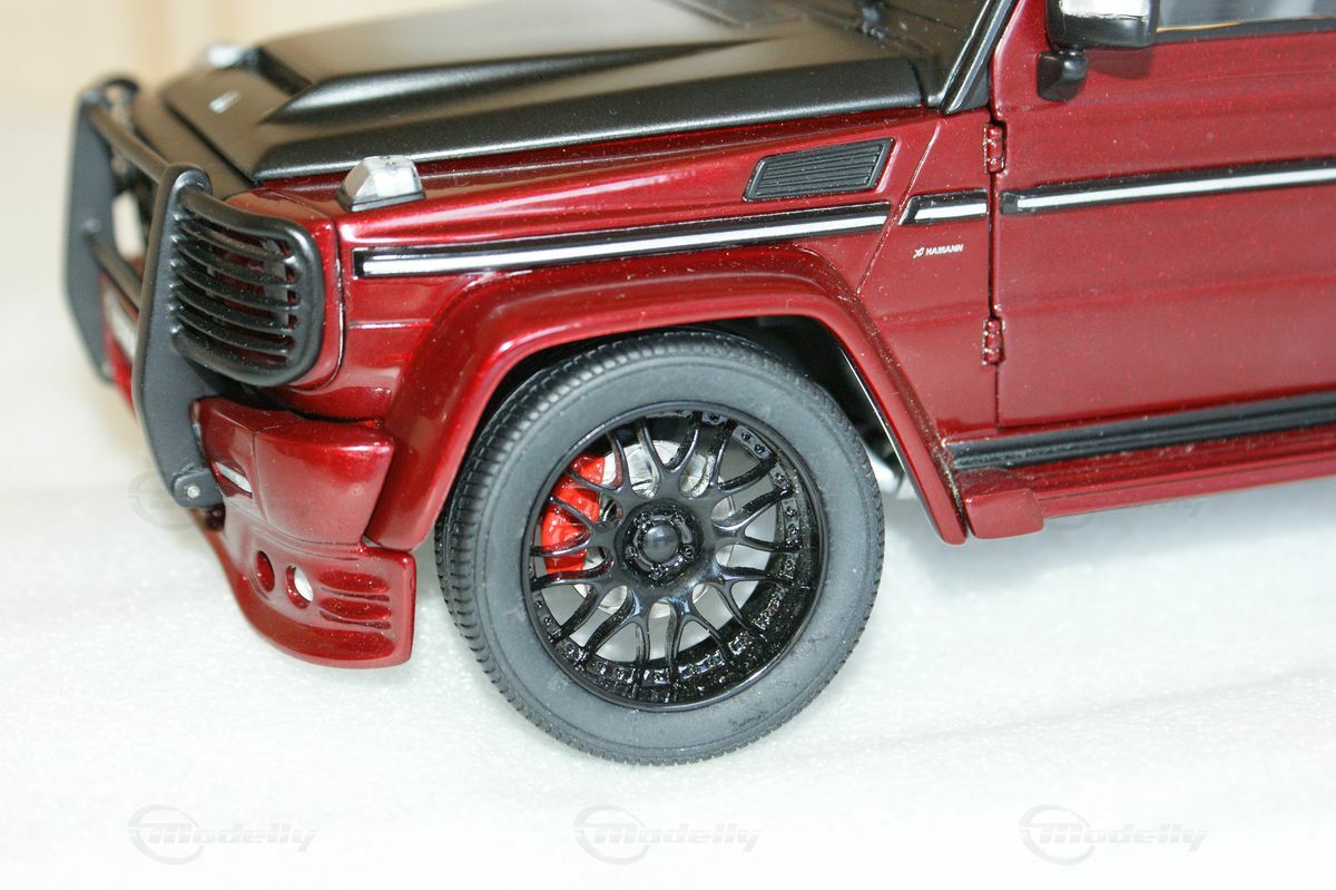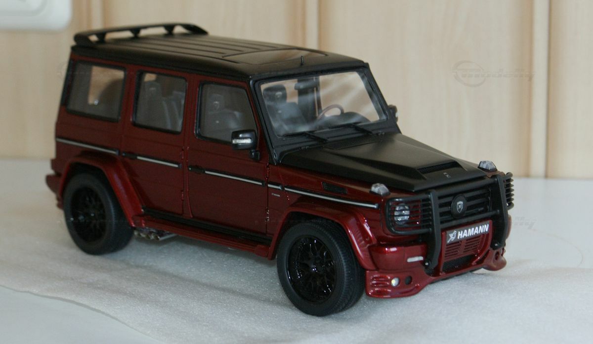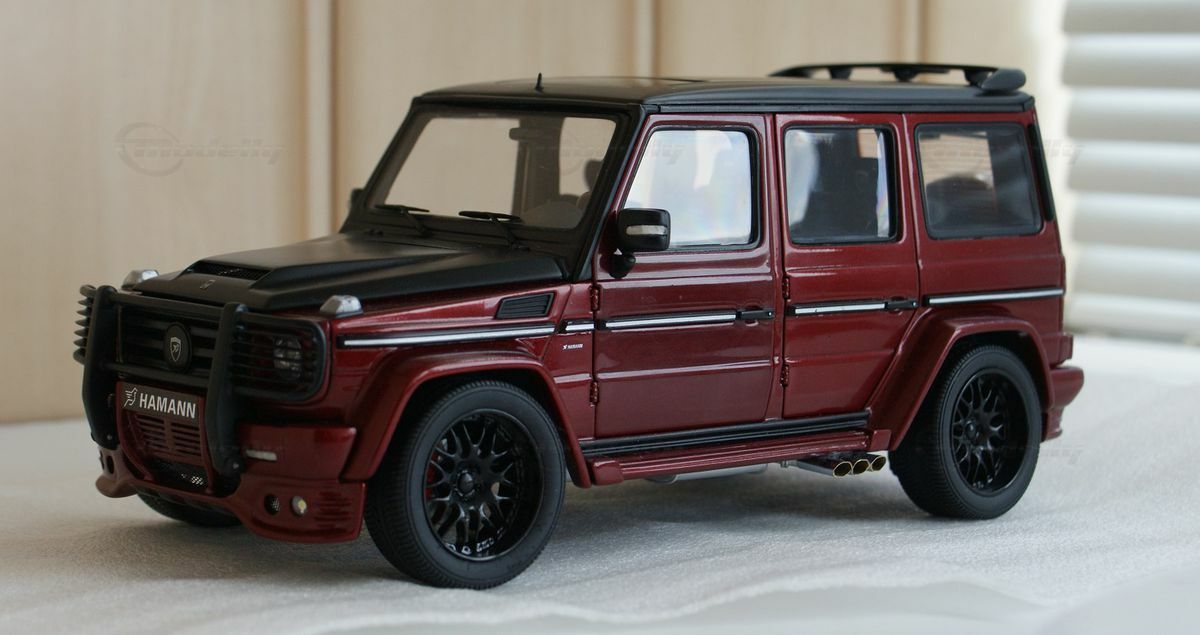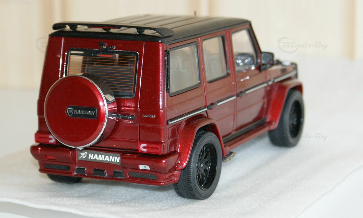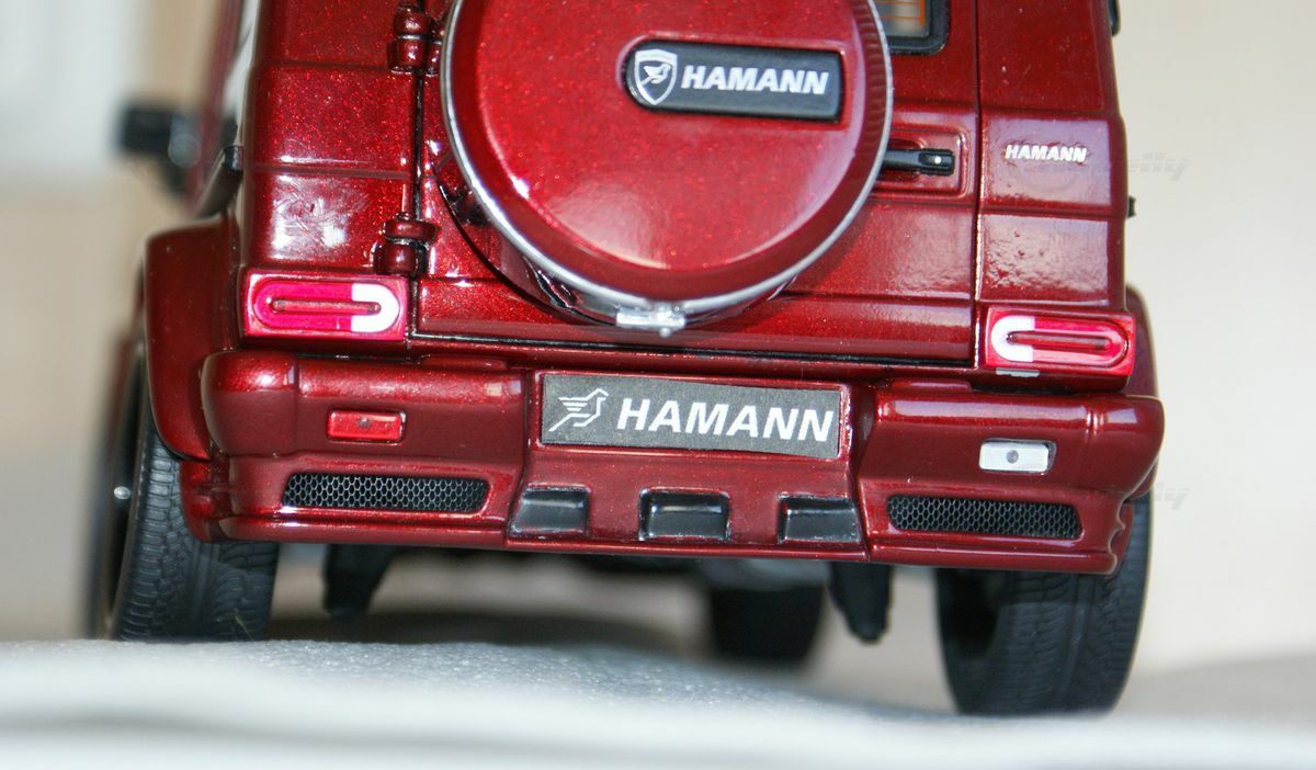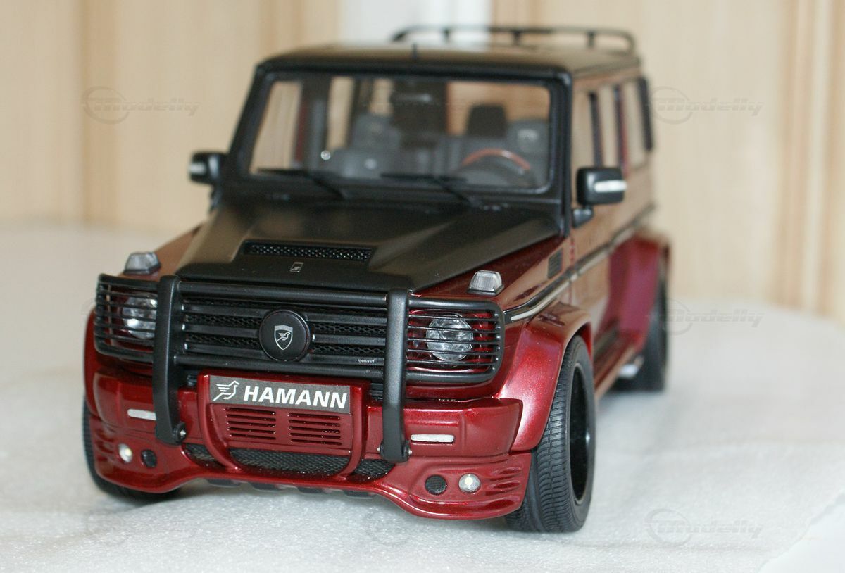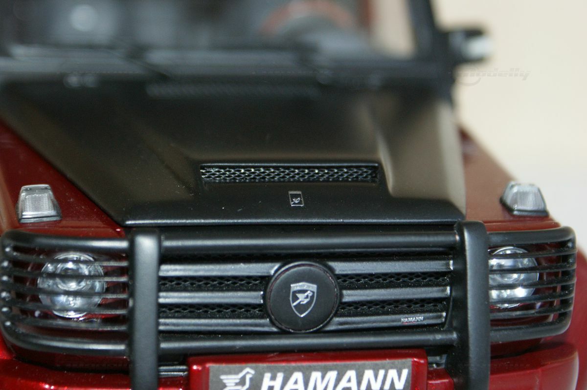 Auf den Fotos sind eindeutige Hinweise auf ein Tuning durch HAMANN Motorsport zu sehen. HAMANN Motorsport wurde 1986 in Laupheim (Deutschland) von Richard Hamann gegründet und ist für Bodykits, Räder, Abgasanlagen und Interieur‑Umrüstungen an sportlichen Fahrzeugen bekannt. Für die Mercedes‑Benz G 55 AMG bot der Tuner über die Jahre verschiedene Body‑Pakete an. Sichtbar sind typische Elemente wie eine Frontschutzbügel‑Optik, verbreiterte Radläufe, Front‑ und Heckschürzen mit zusätzlichen Lufteinlässen bzw. Gittern, Dachspoiler sowie diverse HAMANN‑Schriftzüge. Die realen Hamann‑Umbauten konnten zudem geänderte Räder (z. B. mehrteilige Schmiederäder), Leistungs‑Upgrades und Interieur‑Akzente umfassen. Auch wenn das hier gezeigte Miniaturmodell Anklänge an ein „HAMANN‑G55“ trägt, handelt es sich nicht um eine exakte Replik eines spezifischen Hamann‑Komplettfahrzeugs, sondern um eine gestalterisch an das Tuning angelehnte Umsetzung. Die technischen Eckdaten des Vorbilds bleiben jedoch die der Mercedes‑Benz G 55 AMG mit M113K‑V8, Allradsystem mit drei Sperren, Leiterrahmen und 5‑Stufen‑Automatik.