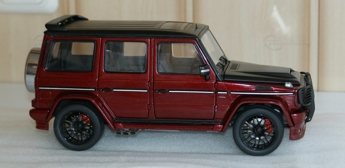 Die Karosserie dieses Umbau‑Modells zeigt eine zweifarbige Gestaltung mit einem dunklen Rotmetallic für die Flächen und Schwarz für Dach und Motorhaube. Die rotmetallische Lackierung besitzt feine Metallic‑Partikel, die im Licht klar ablesbar sind. Schwarz abgesetzte Elemente wie Kühlergrill, Lampeneinfassungen, Spiegelgehäuse, Türgriffe und die seitlichen Schutzleisten setzen sich kontrastreich vom Rot ab. Vorne ist ein massiver Frontschutzbügel montiert, der die charakteristische, senkrecht stehende Front der Mercedes‑Benz G‑Klasse betont. Die Stoßfänger tragen Gittereinsätze; an der Seite sind Trittbretter und die AMG‑typischen Seitenauspuffe sichtbar. Am Heck findet sich eine Reserveradabdeckung in Wagenfarbe mit zentralem HAMANN‑Emblem und ein Dachkantenspoiler über der Hecktür. Die geometrisch klaren Türscharniere, die kantige Verglasung und die umlaufende Zierleiste geben die W463‑Formensprache präzise wieder. Die Räder füllen die verbreiterten Radhäuser deutlich aus; die Bremsanlage mit gelochter Scheibe und lackiertem Sattel ist ablesbar. Insgesamt zeigt die Modifikation eine stimmige Anlehnung an typische HAMANN‑Umbauten. Für Sammler ist interessant, dass die Basis als Diecast‑Modell eine robuste Grundlage liefert und viele Details sauber trennt, was Umgestaltungen wie hier ermöglicht. Wer nach einem G‑Klassiker mit AMG‑Genen und Tuning‑Anleihen sucht, findet in diesem individuell umgebauten Exemplar aus der Sammlung von RiggsM eine prägnante Interpretation des Vorbilds Mercedes‑Benz G 55 AMG.