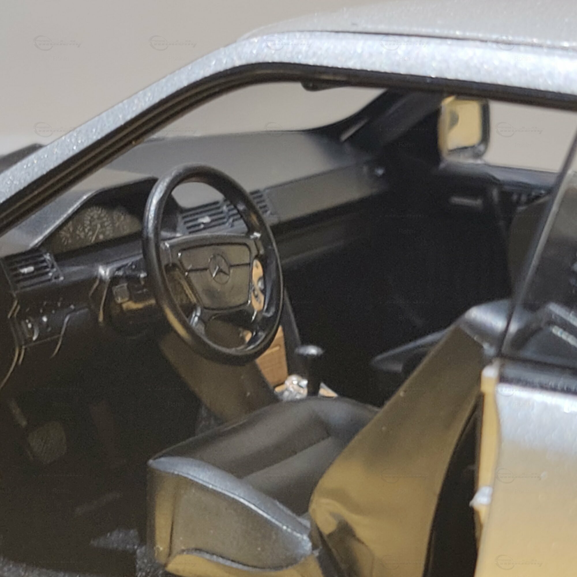 Die Detailtreue des Norev-1:18-Modellfahrzeugs wird durch das authentische Lackdesign und die sorgfältige Nachbildung der Exterieur-Elemente unterstrichen. Die silberne Lackierung des Modells verleiht ihm einen edlen Charakter und hebt die klaren Linien und Formen des Mercedes Benz 230CE W124 hervor. Besondere Aufmerksamkeit verdient die Nachbildung der Räder mit markanten Mehrloch-Felgen und dem typischen Mercedes-Stern in der Mitte. Die klar durchdachte Gestaltung mit dem unverwechselbaren Erscheinungsbild spiegelt sich perfekt in diesem Modell wider. Eine Augenweide für jeden Sammler. Technische Modifikationen, wie die innovative Multilink-Hinterachse, sind selbst bei diesem Modellfahrzeug ein bewundertes Merkmal. Die Authentizität des Modells wird durch die präzise Imitation der Fahrzeugdetails wie Türgriffe, Scheinwerfer und den Mercedes-Stern auf der Haube unterstrichen.
