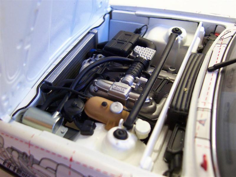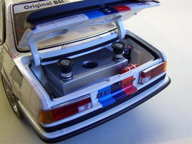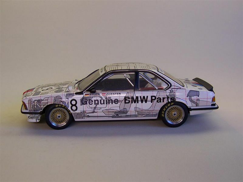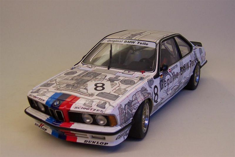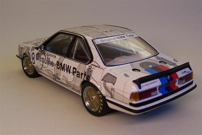 Das Modellfahrzeug besticht durch eine besondere Lackierung, die technische Diagramme und explodierte Ansichten von Fahrzeugteilen zeigt. Diese Grafik verleiht dem Auto einen einzigartigen Look und hebt die technische Komplexität und Ingenieurskunst hervor, die in das Original eingeflossen sind. Die wichtigen Sponsoren-Logos, wie beispielsweise von Castrol, Dunlop, und Schnitzer, sind auf dem Modell sichtbar und betonen seine Rennsport-Historie. An der Front prangt das ikonische BMW-Emblem und die klassische Nierengrille, die das Markenzeichen von BMW ist.